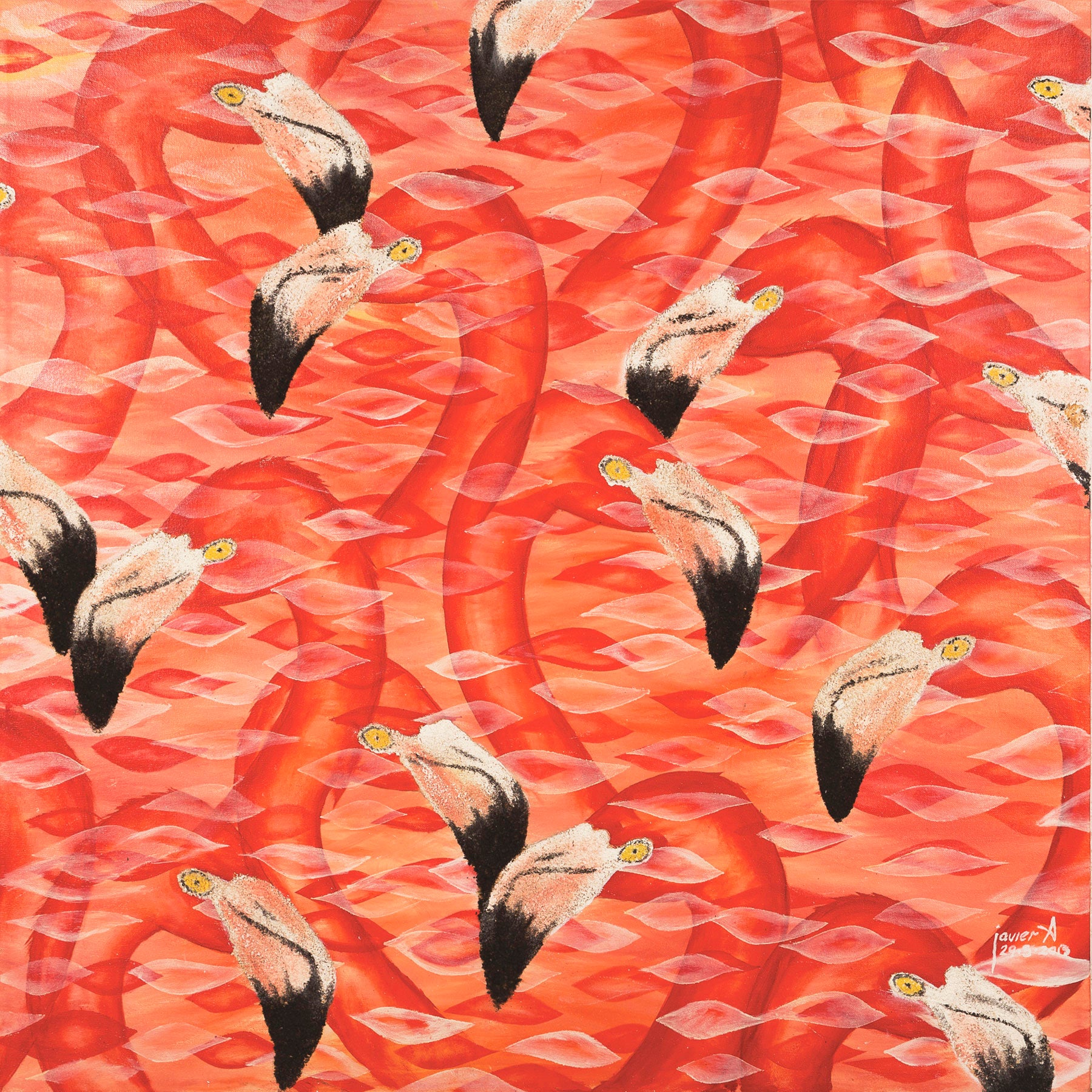 Esta obra representa el acto contemplativo de una parvada de flamencos danzantes, desde esta perspectiva pareciera una mancha rosa infinita, que solo que vislumbra a la especie por el contraste de sus picos blancos y negros. En una danza que parece ensayada, pero que es una dulce y caotica experiencia visual.