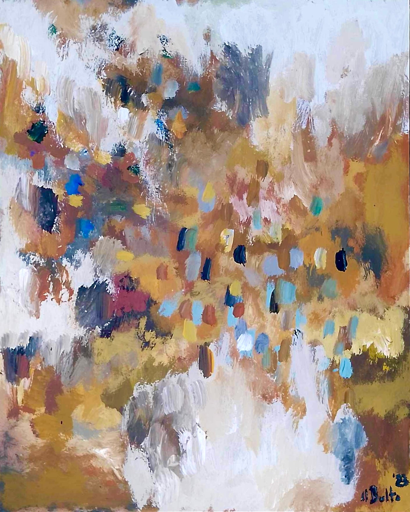 Obra de pintura experimental con tonos ocres de base en contraste con blancos y tonos claros.