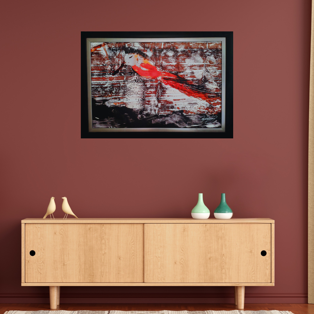 Una explosión de rojo y sombra revela el instante de lucha entre libertad y contención. Atrapado es una foto-pintura de energía visceral, donde el movimiento parece suspendido en el tiempo. La textura y el color se funden en una metáfora visual del alma que intenta liberarse de sus propias fronteras.