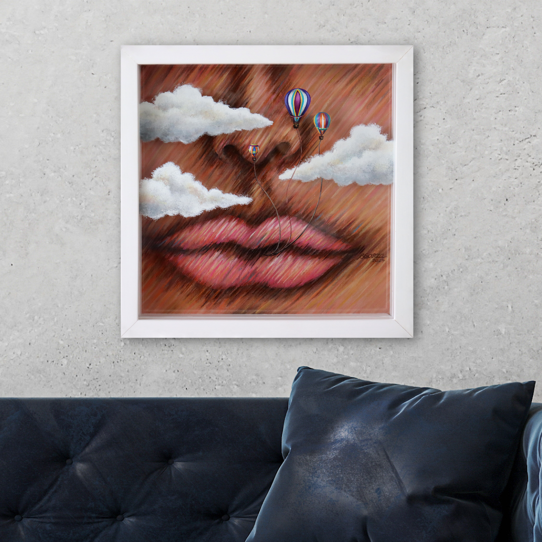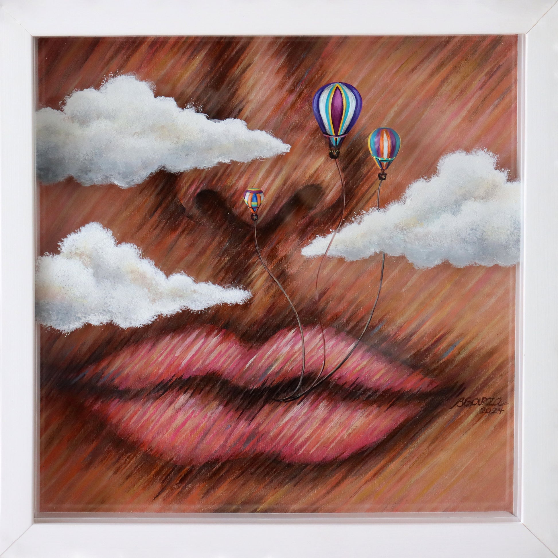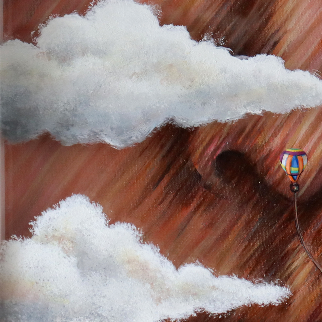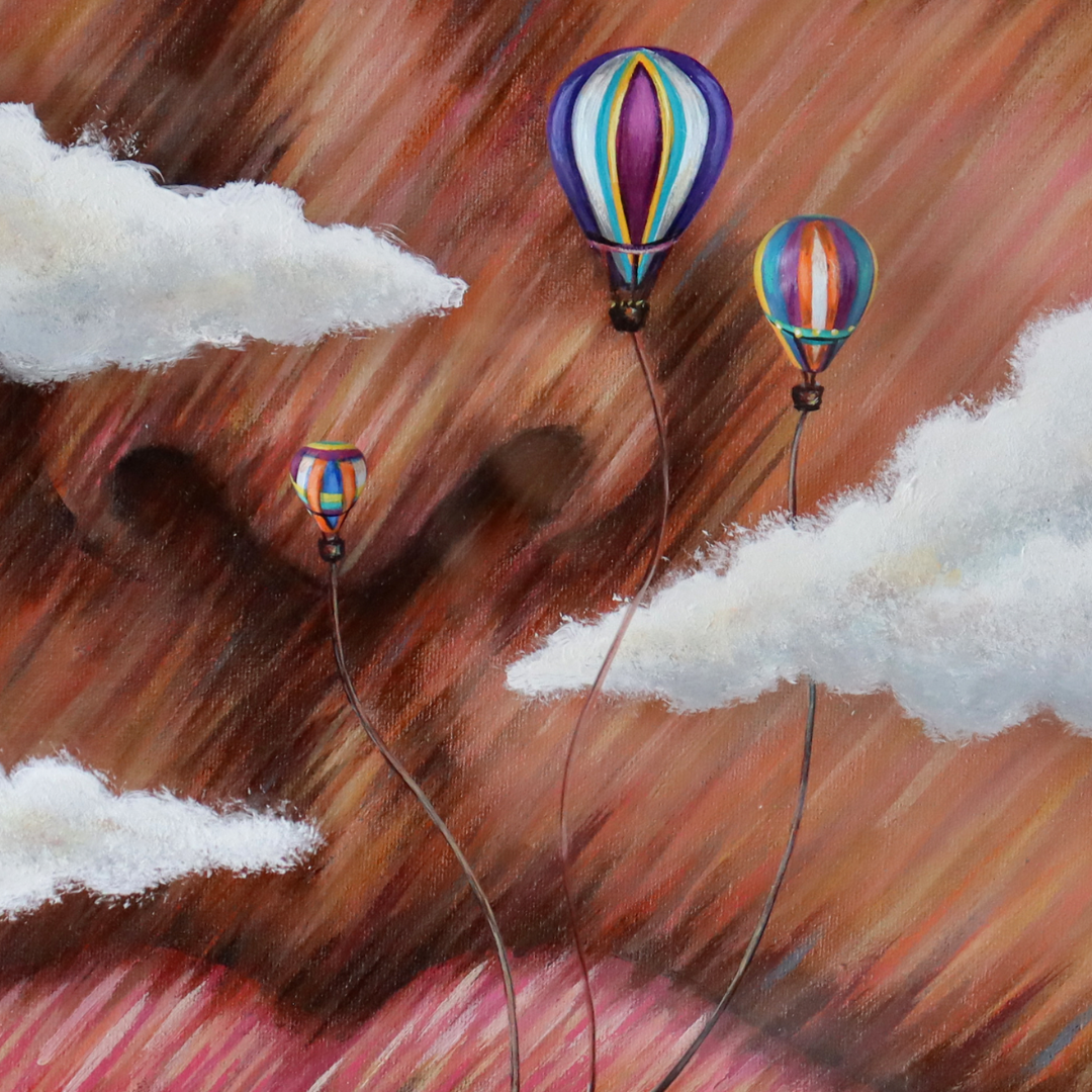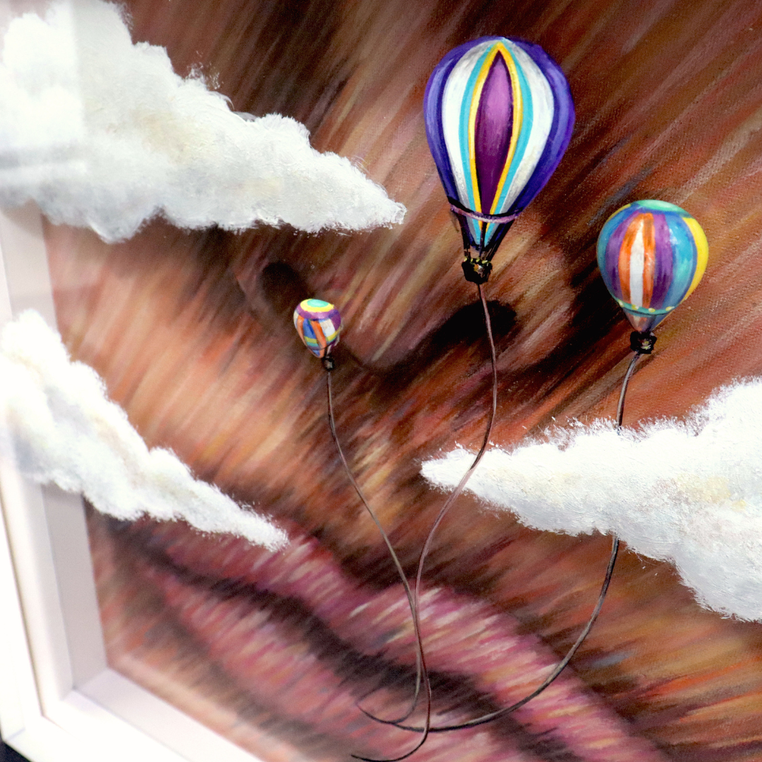 Pequeña pieza de técnica mixta con acrílico y óleo sobre tela en el fondo y dos capas más de placa acrílica transparente que dan profundidad y movimiento a la obra a través de los distintos planos. Con toques tridimensionales (los globos aerostáticos) y texturas visuales. Está enmarcada en color blanco y protegida con vidrio.