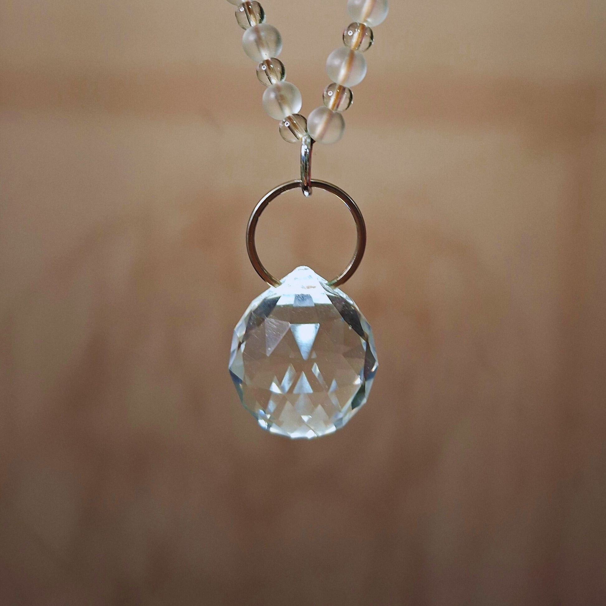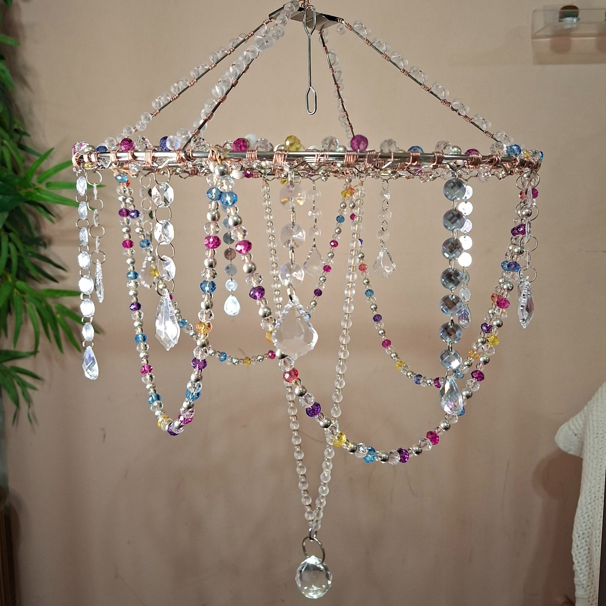Estructura metálica ensamblada con cuentas de cristal, acrílico y un prisma de cristal cortado.
