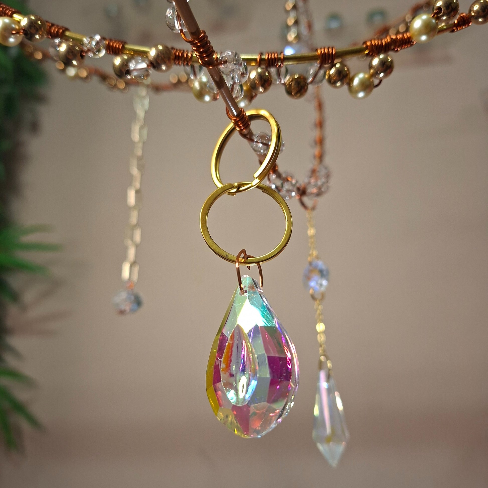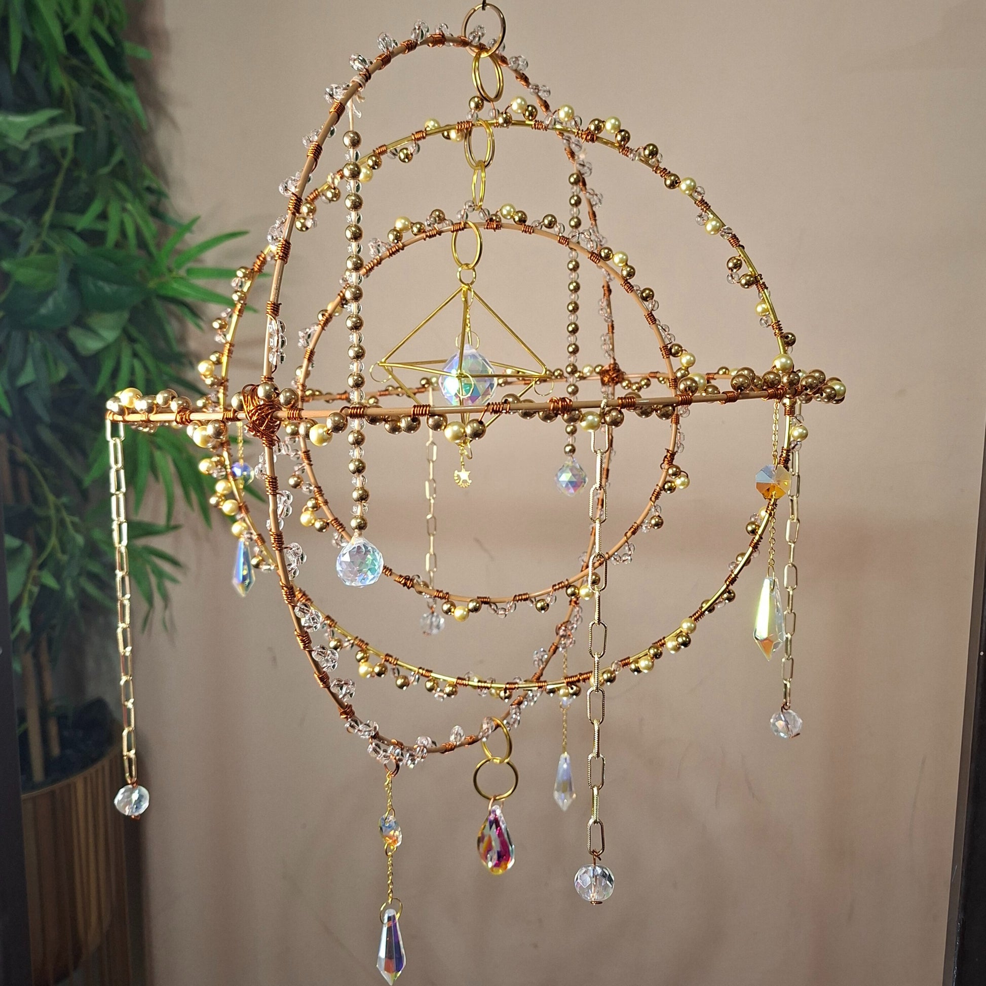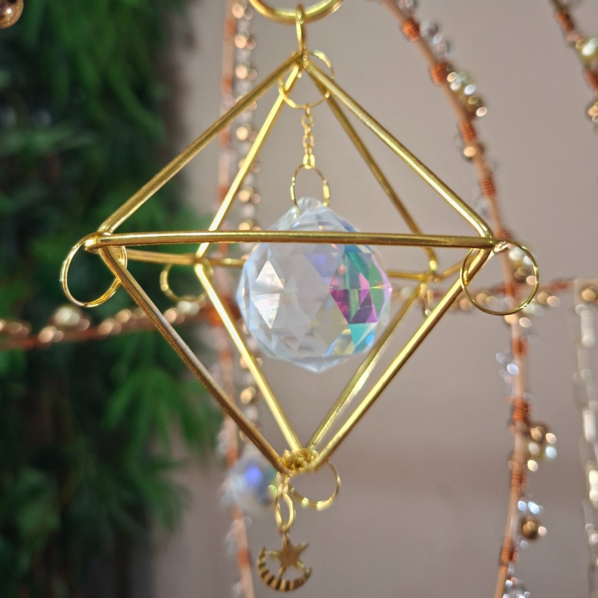 Adorno en forma de átomo hecho con 4 aros metálicos en color dorado. Este adorno está elaborado delicadamente con cuentas de cristal facetado, con cuentas redondas iridiscentes, cuentas doradas y varios dijes en cristal. Todo esto está hecho a mano con hilo de cobre 99% pureza. De él pende una cadena de aros medianos dorados sujetando una estructura en forma de 2 pirámides unidas por su base abrazando así un prisma en forma esférica facetada.