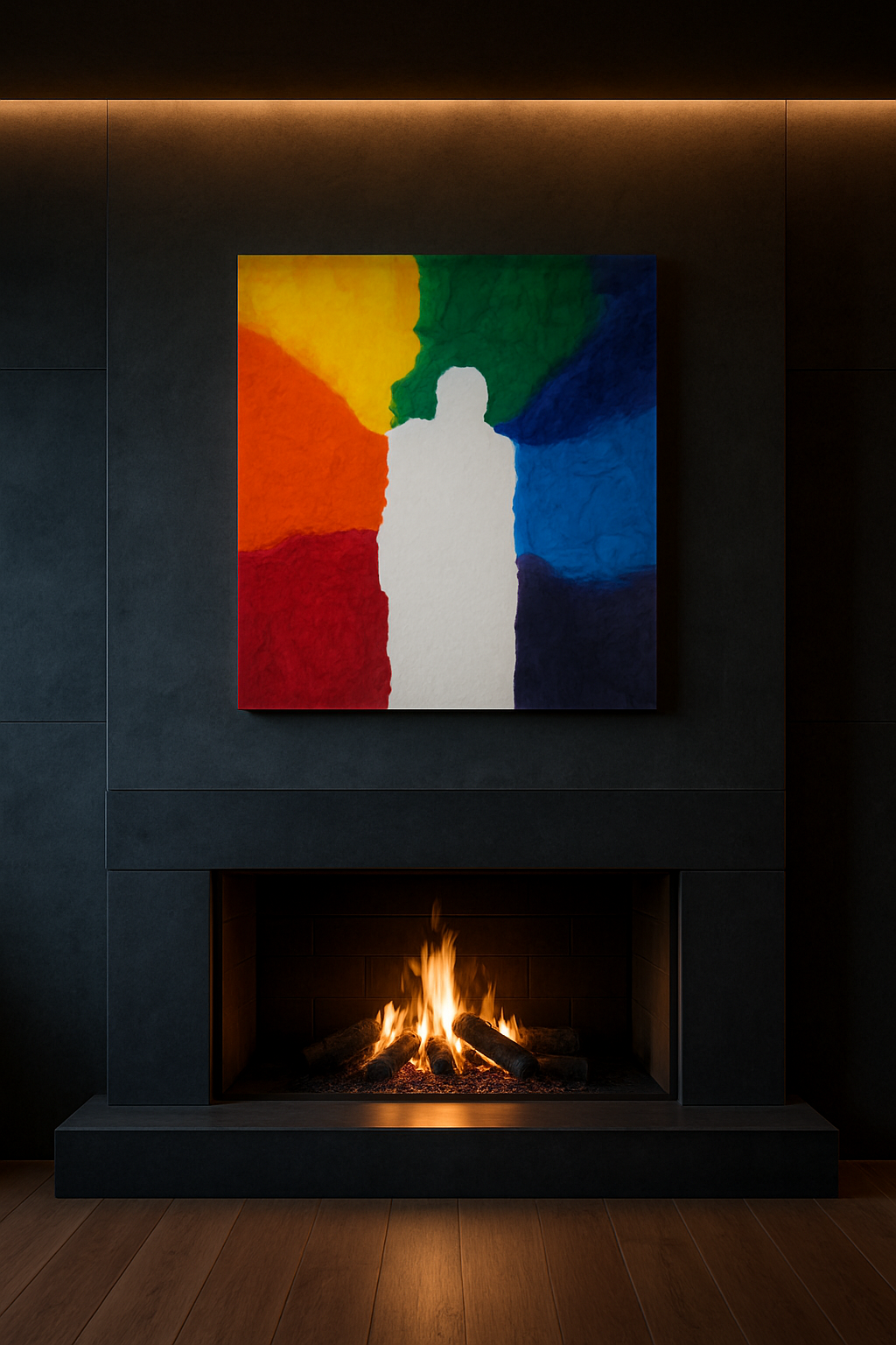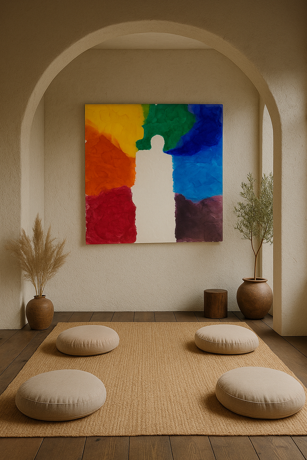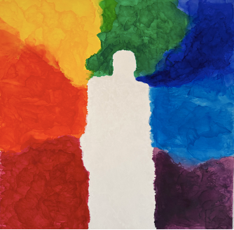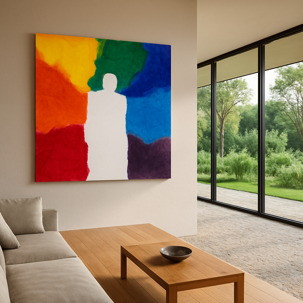 Esta obra representa la presencia plena: el sujeto se disuelve en su entorno y se convierte en canal de energía, conciencia o totalidad. El color ya no brota de él, sino que lo rodea, lo abraza, lo define desde lo colectivo y lo universal.