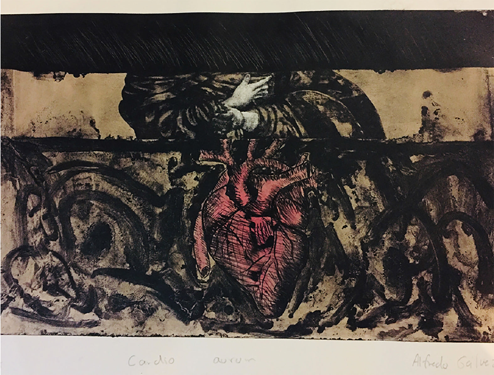 Aureum Cordis de 2019 es una planografía o sea que la matriz no tiene huecos ni relieves de manera similar a la Litografía, esta obra está basada en mi obra Manus Ruber, pero haciendo referencia a un elemento que históricamente en México tiene enorme tanto antes como después de la conquista