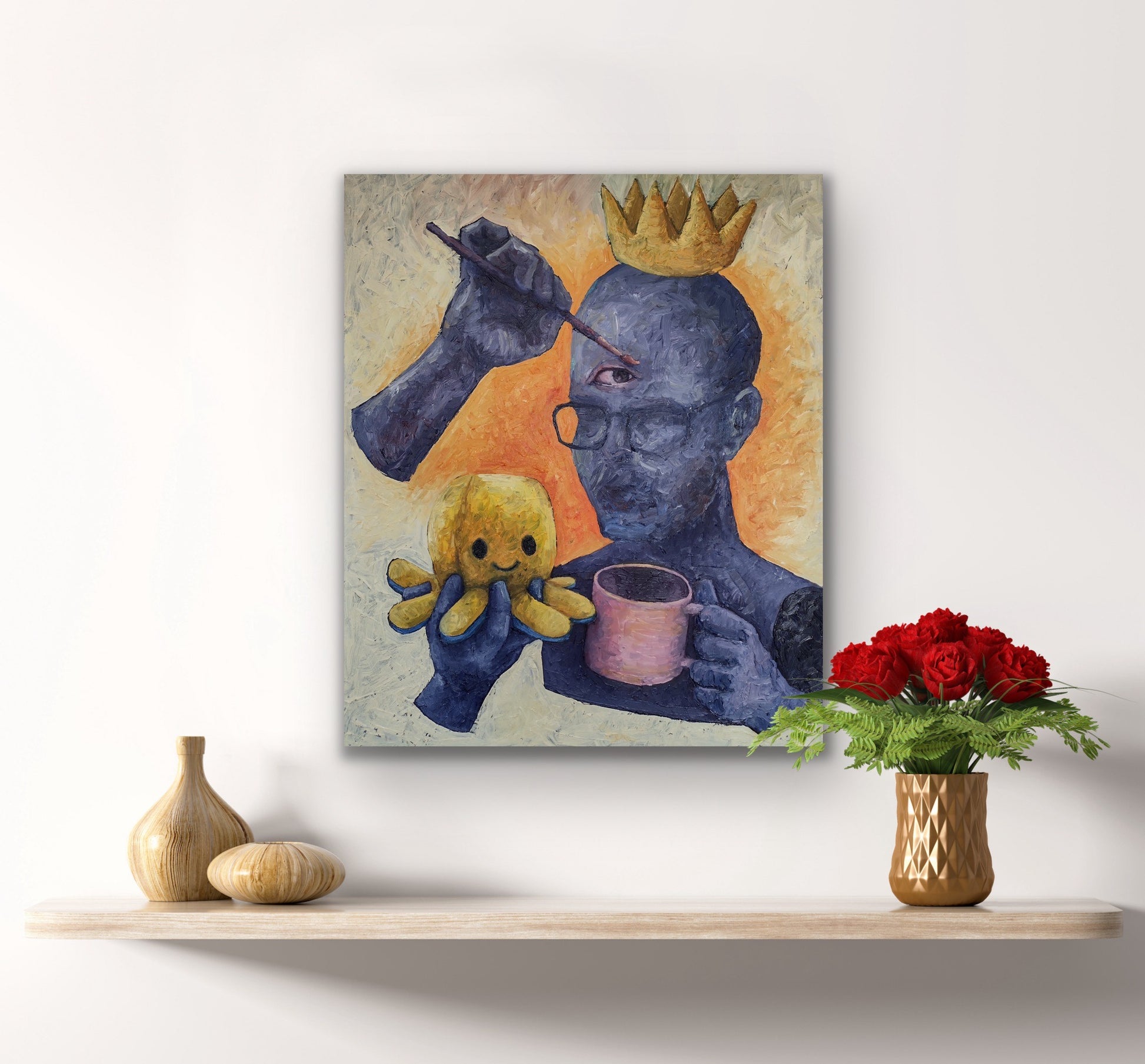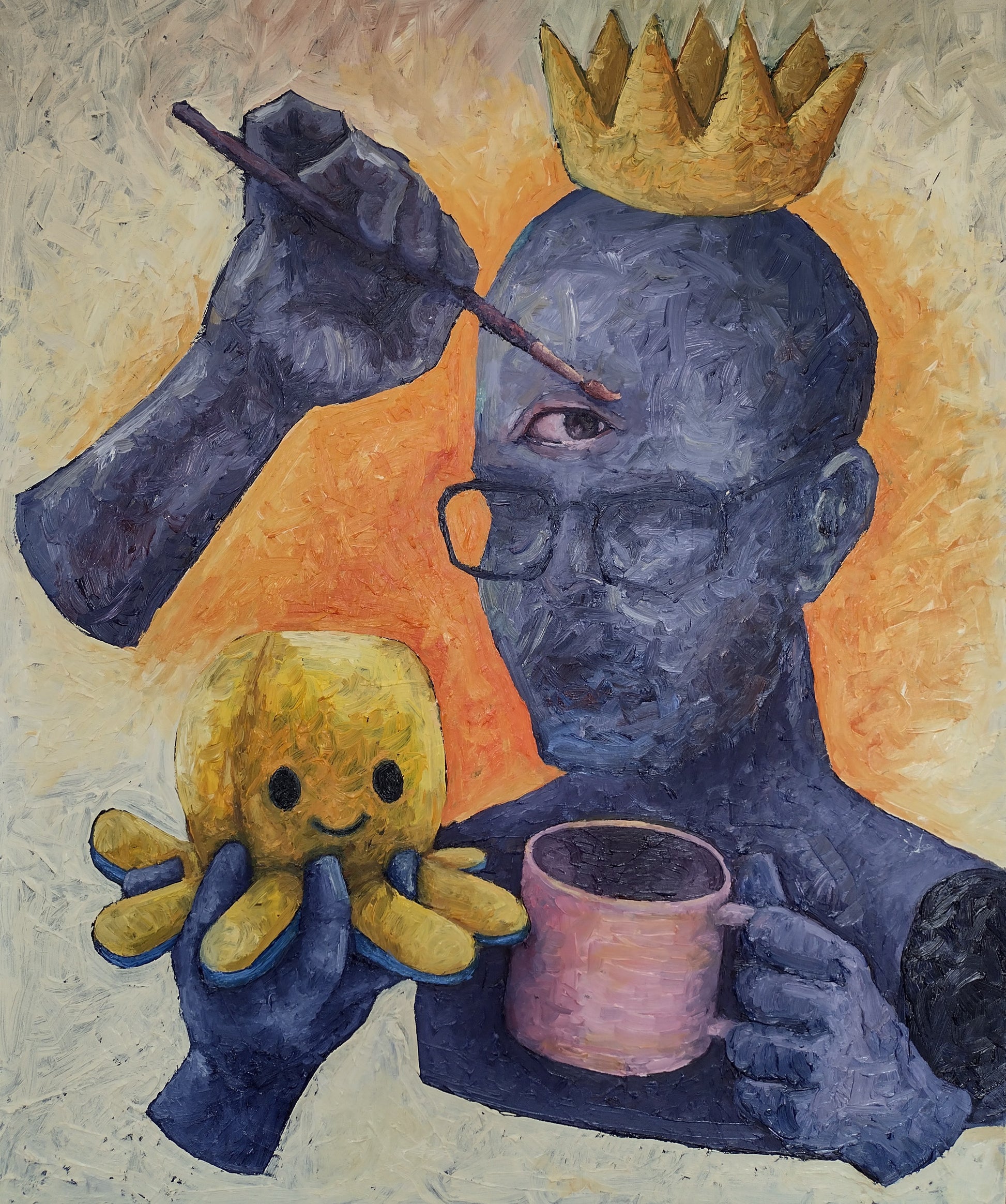 Autoretrato conceptual con elementos como el tercer ojo íntado por el retratado, un pulpo reversible, corona y café.