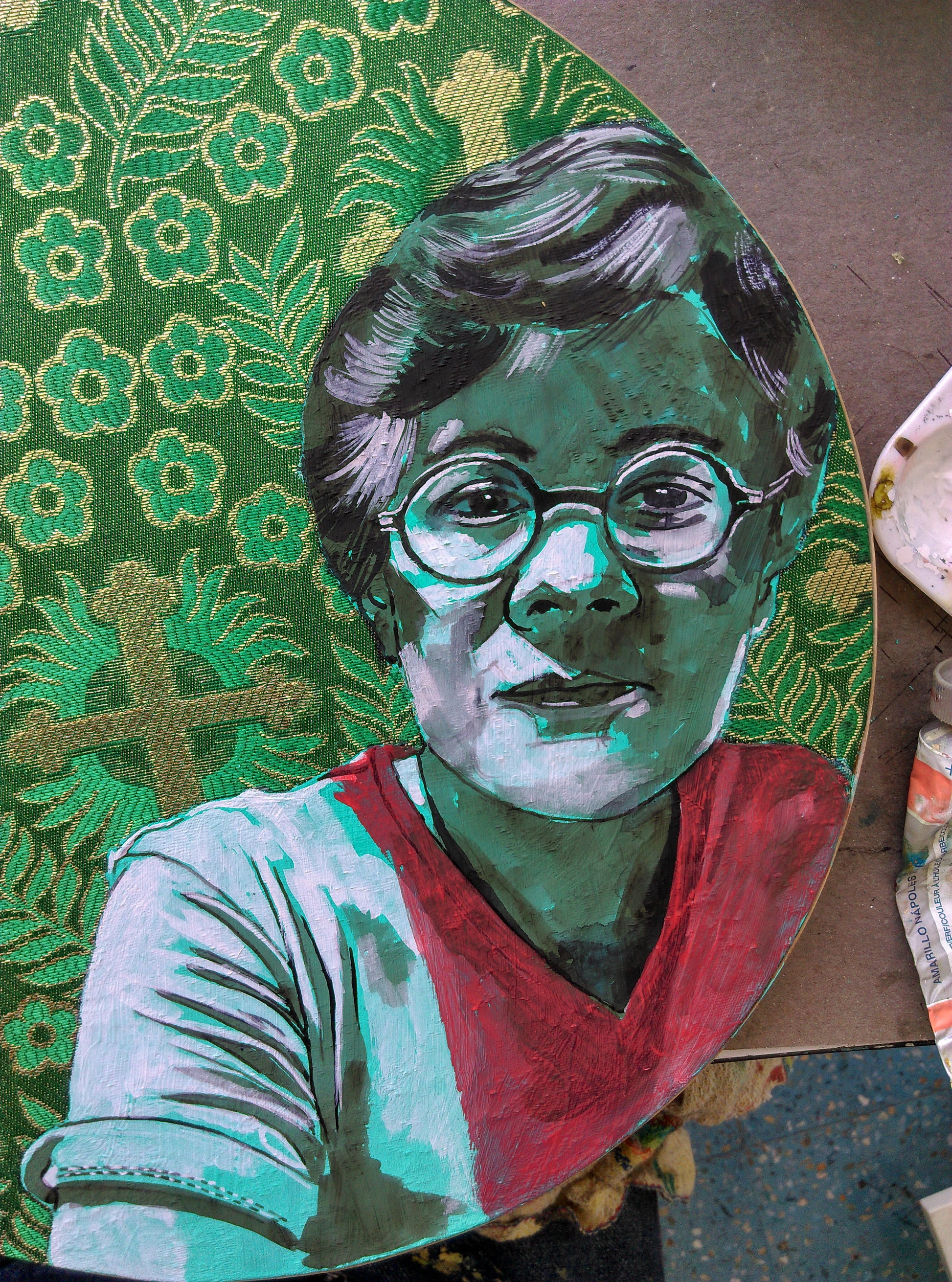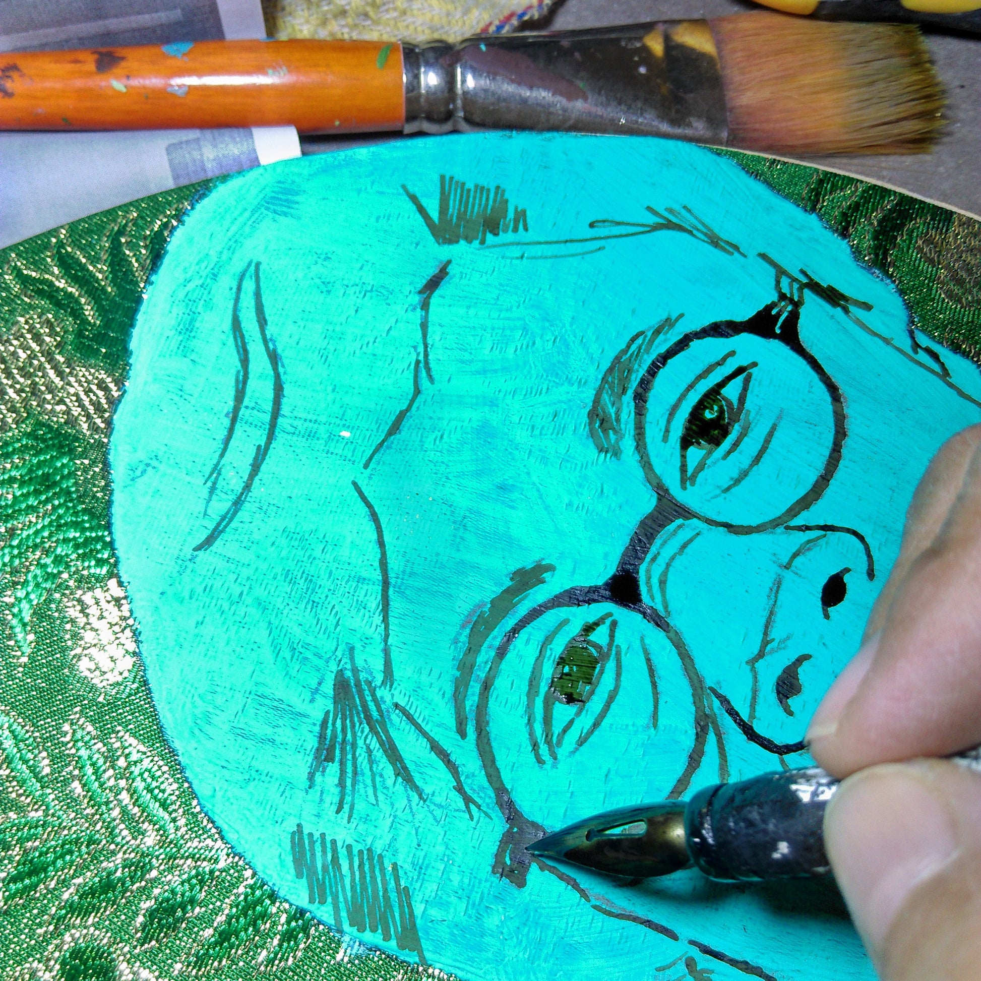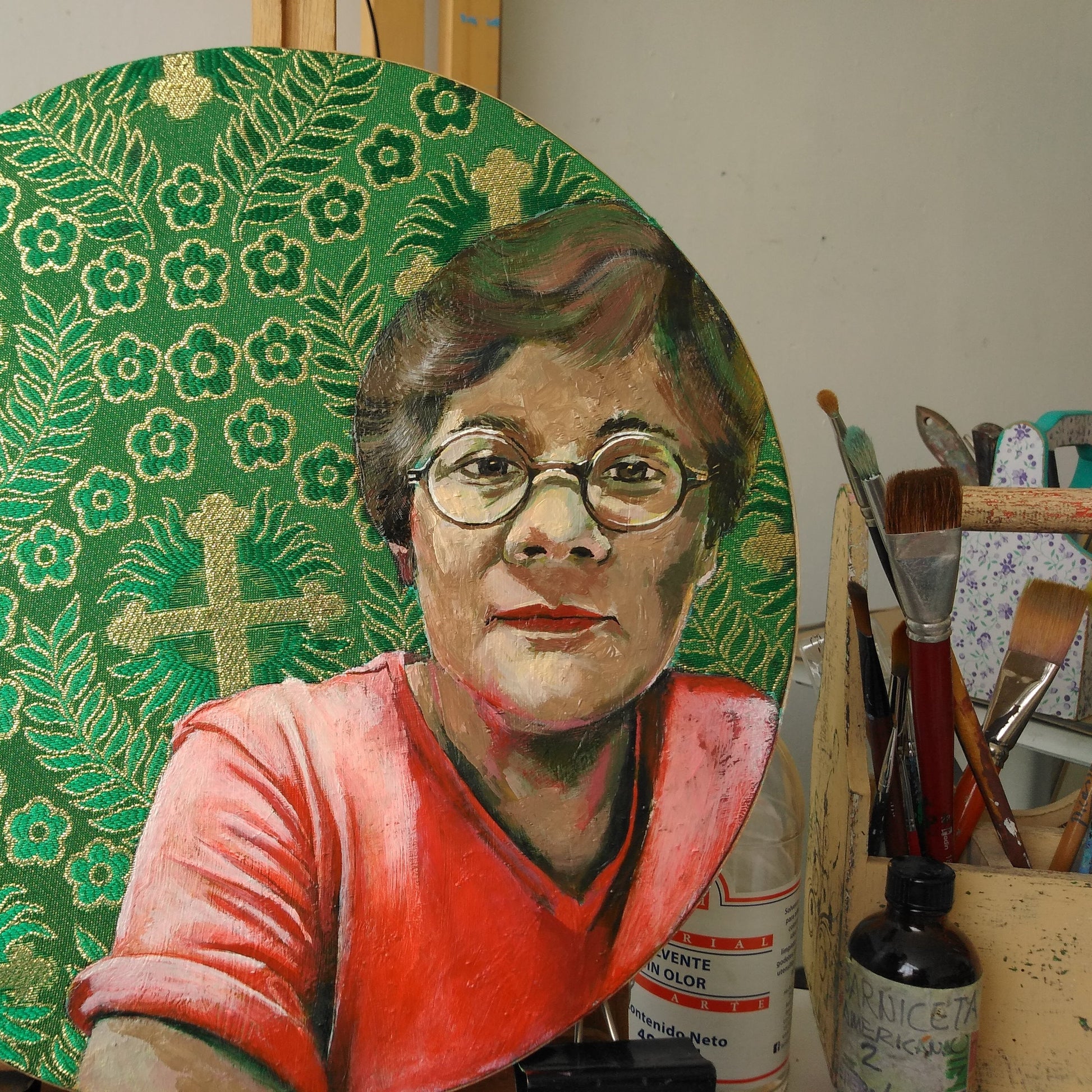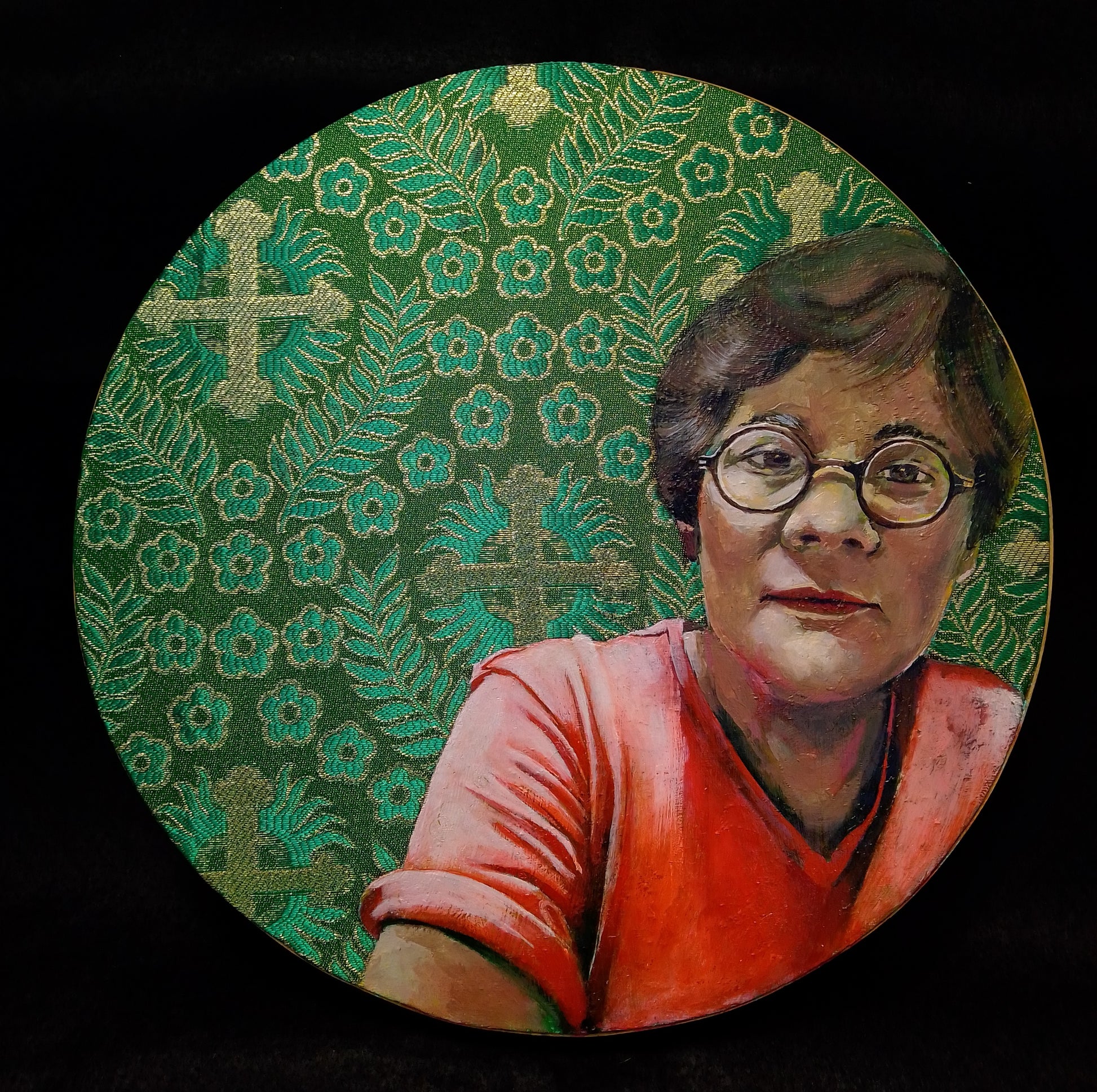 El Autorretrato en verde es una pintura al óleo presentada en un formato circular conocido como tondo. Esta forma redonda, que se aparta de la tradicional composición rectangular, enfatiza la unidad y armonía. La figura humana, colocada a la derecha de la superficie, mira serenamente al espectador con una expresión tranquila. La playera informal y la mirada directa crean una sensación de conexión. El fondo destaca por su textura verde con elementos dorados florales, ocupando la mayor parte de la pintura. La elección del tondo y el uso de colores complementarios resaltan la esencia y equilibrio del sujeto, transmitiendo la sensación de plenitud y armonía.