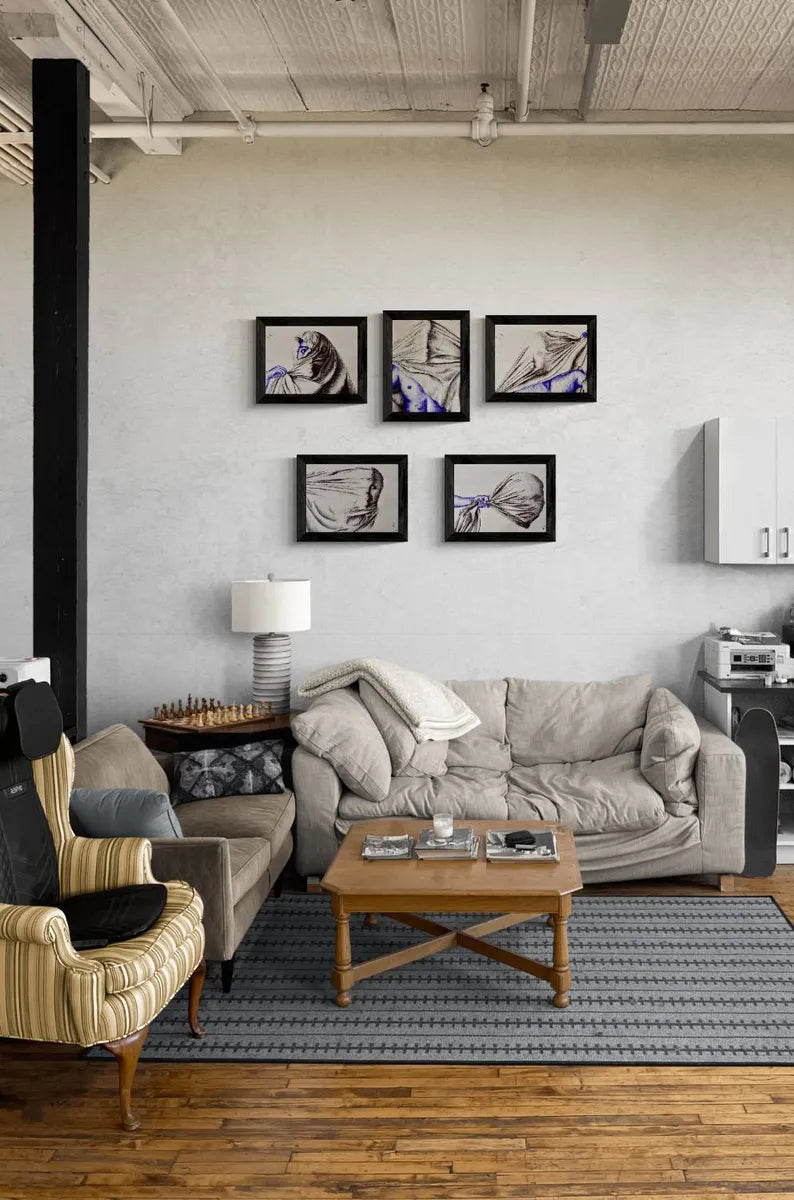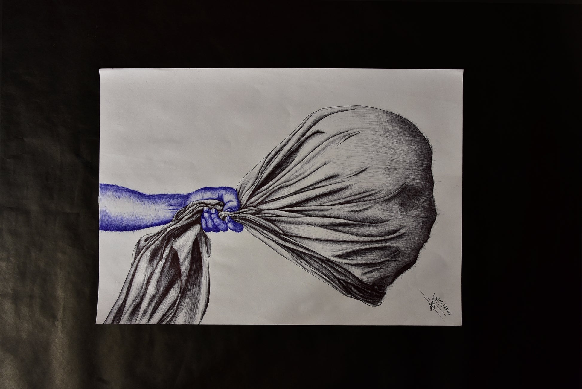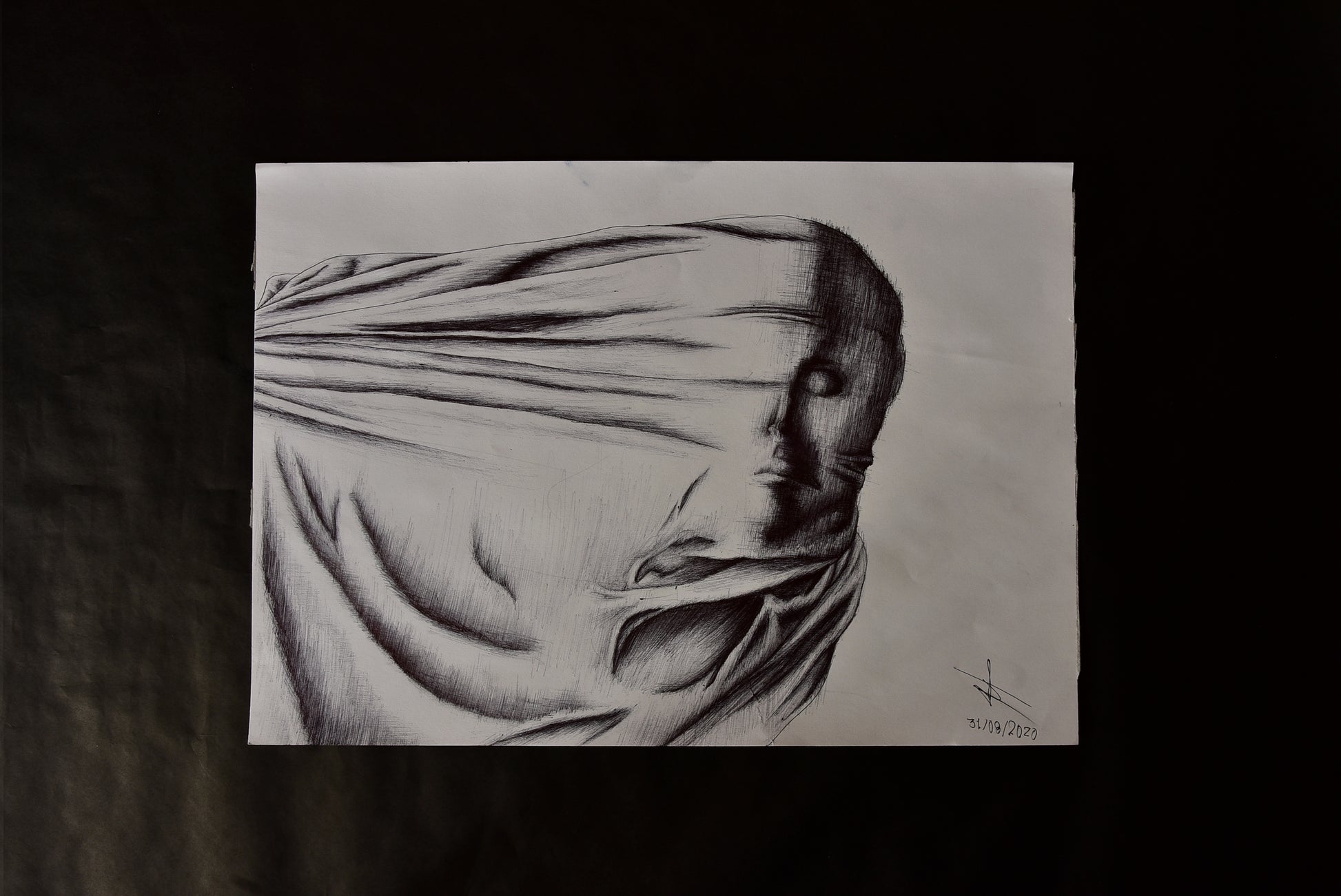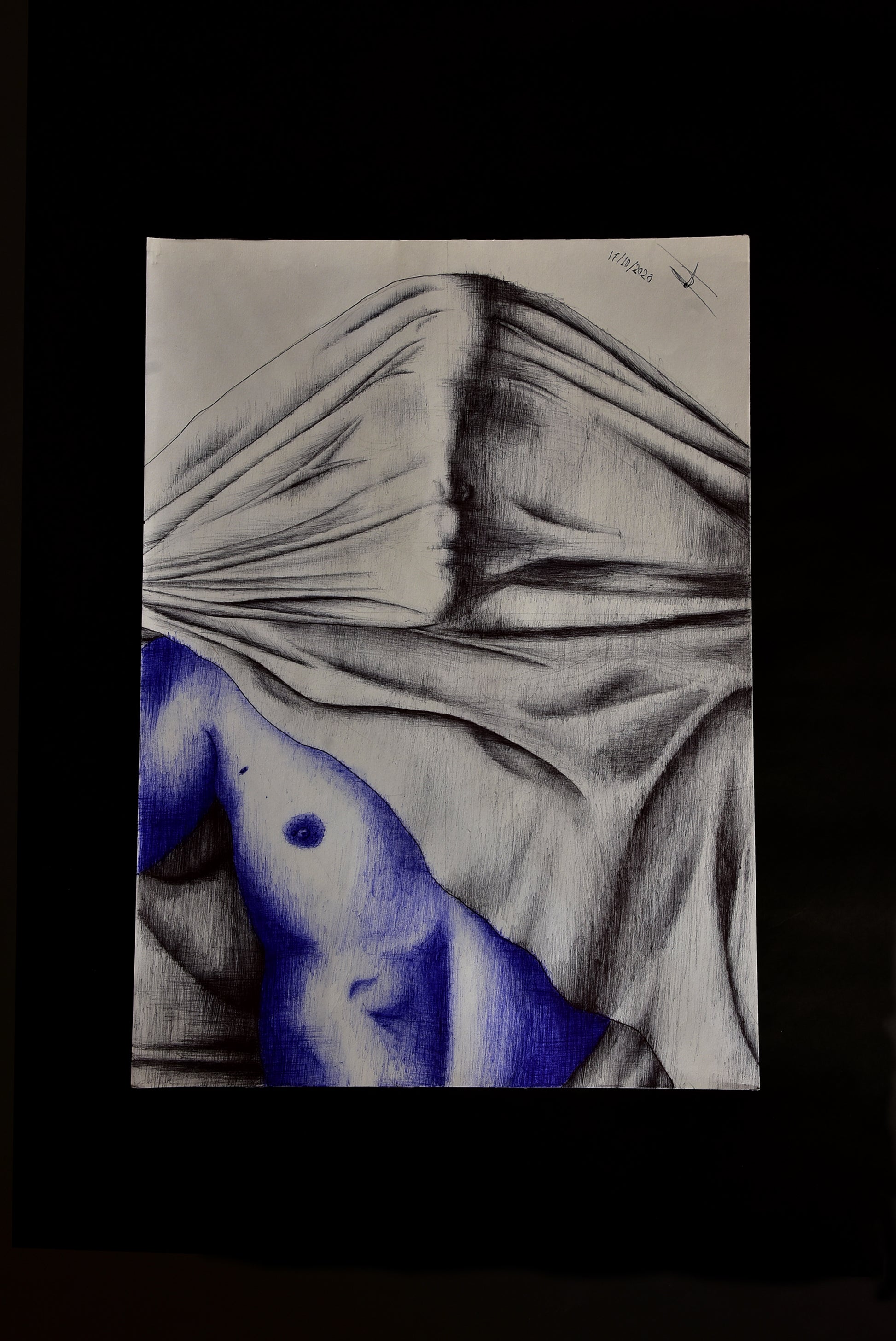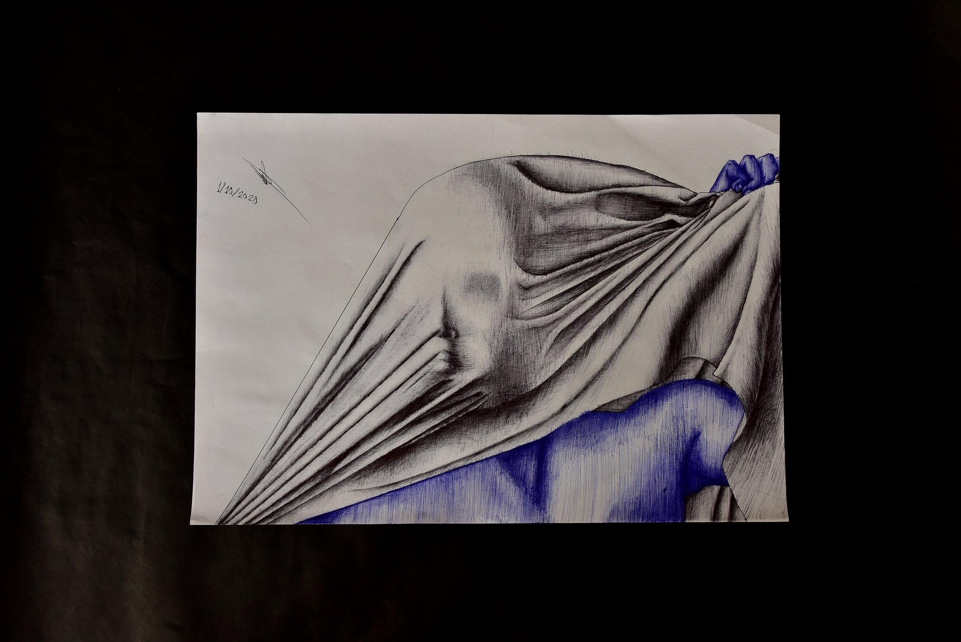 Autorretratos con sábanas es una serie que contiene 5 piezas que fueron hechas durante la cuarentena del 2020, reflejando el deterioro y desvanecimiento del individuo junto con su cordura a medida que la crisis derivada del COVID-19 se agravaba. Se utilizaron los colores de azul y negro para mayor contraste entre la tela y el modelo.