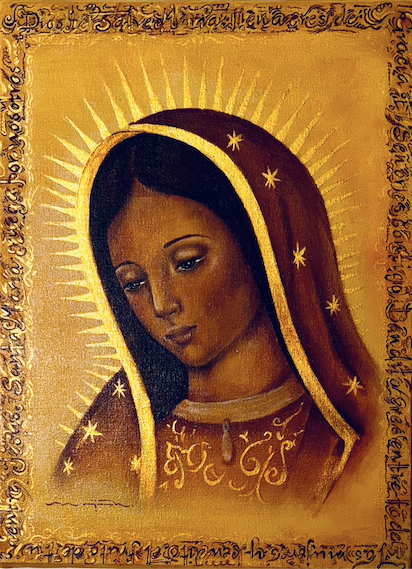 En esta obra, proyectamos la imagen de la Virgen de Guadalupe en tonos sepia y dorados como símbolo de la atemporalidad y trascendencia del color independientemente de como sea representada, sin embrago tenemos matices dorados propios de su realeza. Además está enmarcada por la oración del Ave María en una tipografía dorada no convencional, ésta es la oración con la que invocamos la protección de la Virgen María y es una expresión de amor, veneración y confianza, al contemplarla simplemente conectamos con la espiritualidad.