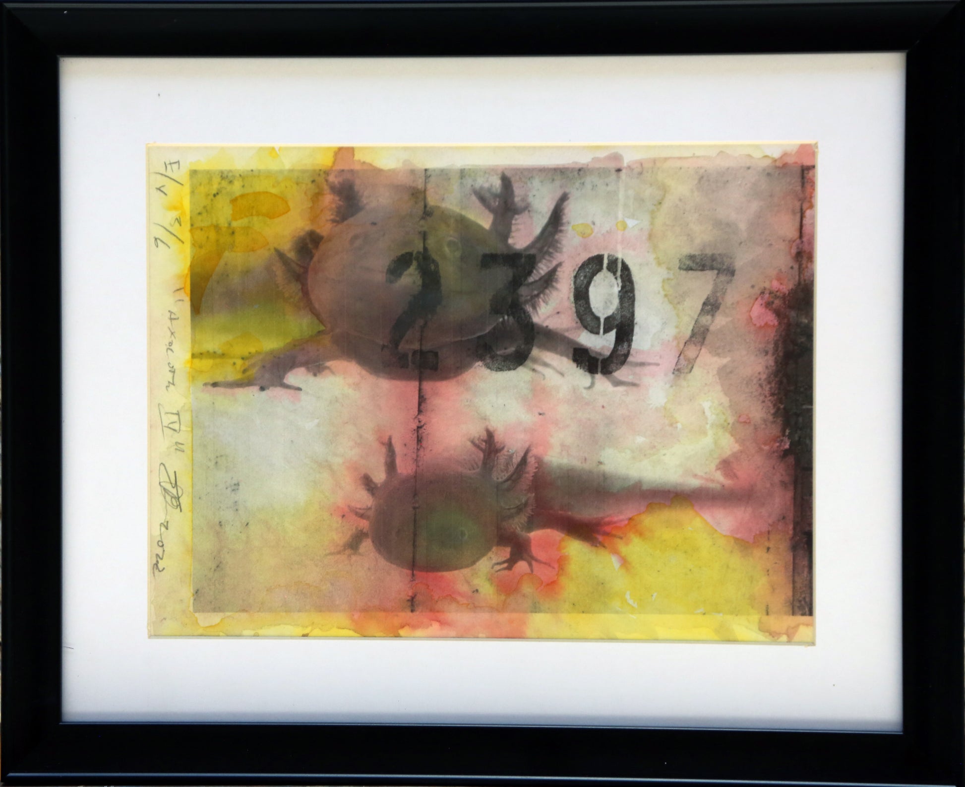 "Axolotl 4" es una serigrafía con tinta china sobre papel que forma parte de la serie "México Mágico". En esta obra, Hernández Soto continúa explorando la rica simbología del ajolote, un animal emblemático de la fauna mexicana, cargado de significado cultural y mítico.