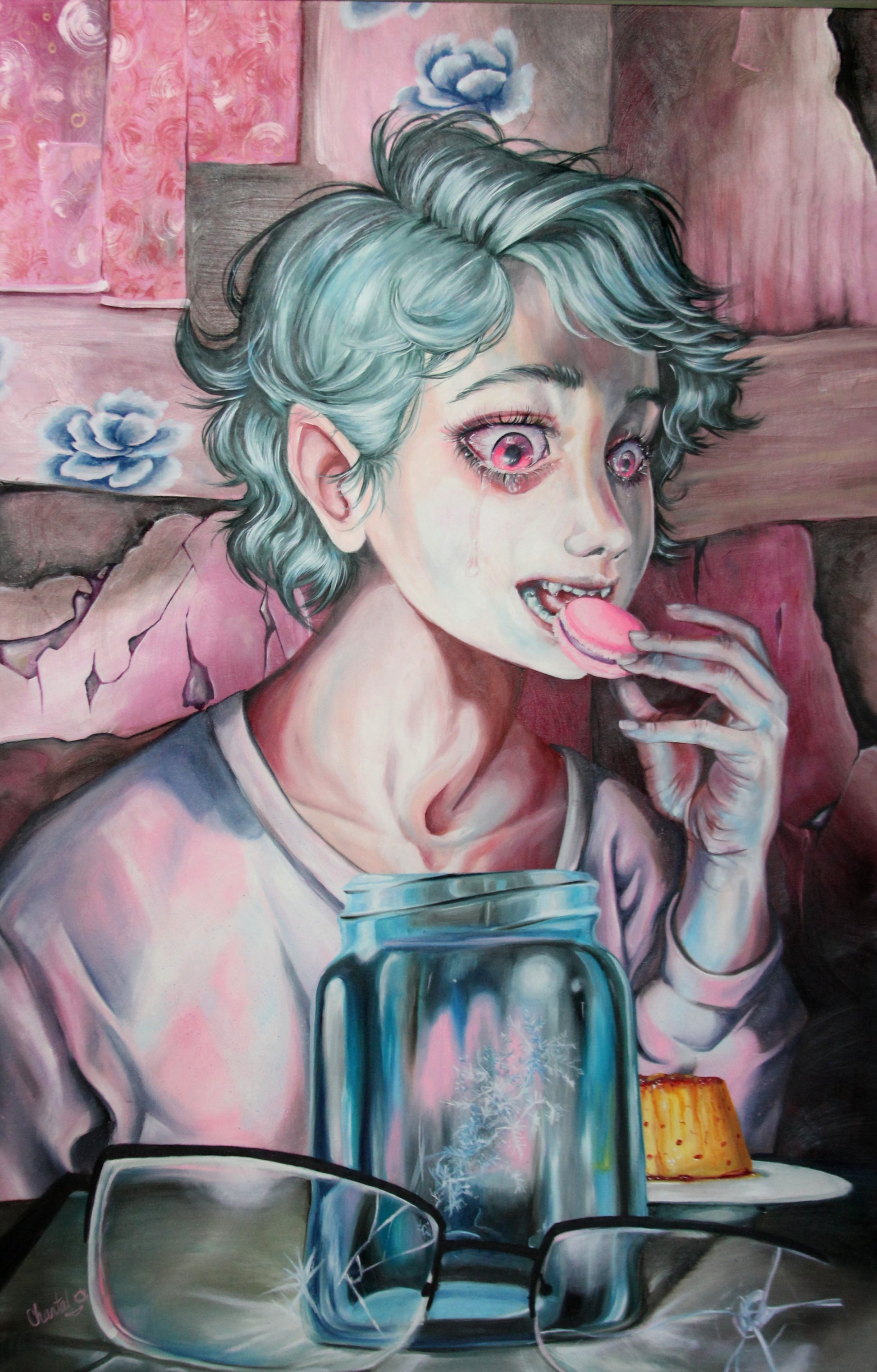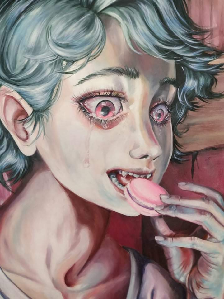 Tenemos una imagen llena de negación, con un personaje que se niega a ver lo que sucede a su alrededor a causa del miedo, en cambio, trata de endulzar su sensación con los postres, buscando algún tipo de refugio de lo que le atormente, pero aunque trate de negarlo esa sensación de frío y miedo está presente.