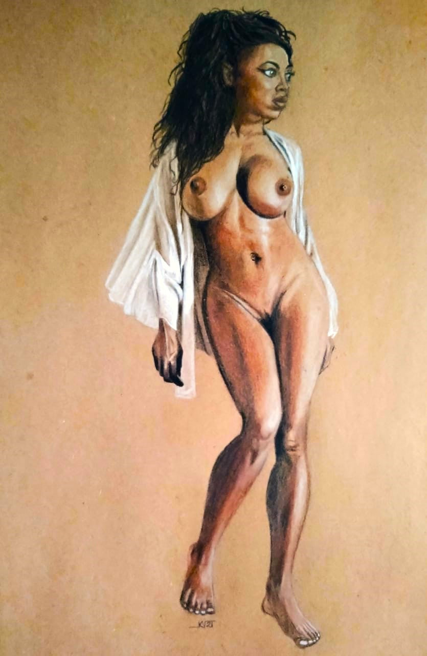Dibujo de desnudo de mujer en colores pastel y carboncillo sobre papel craft.