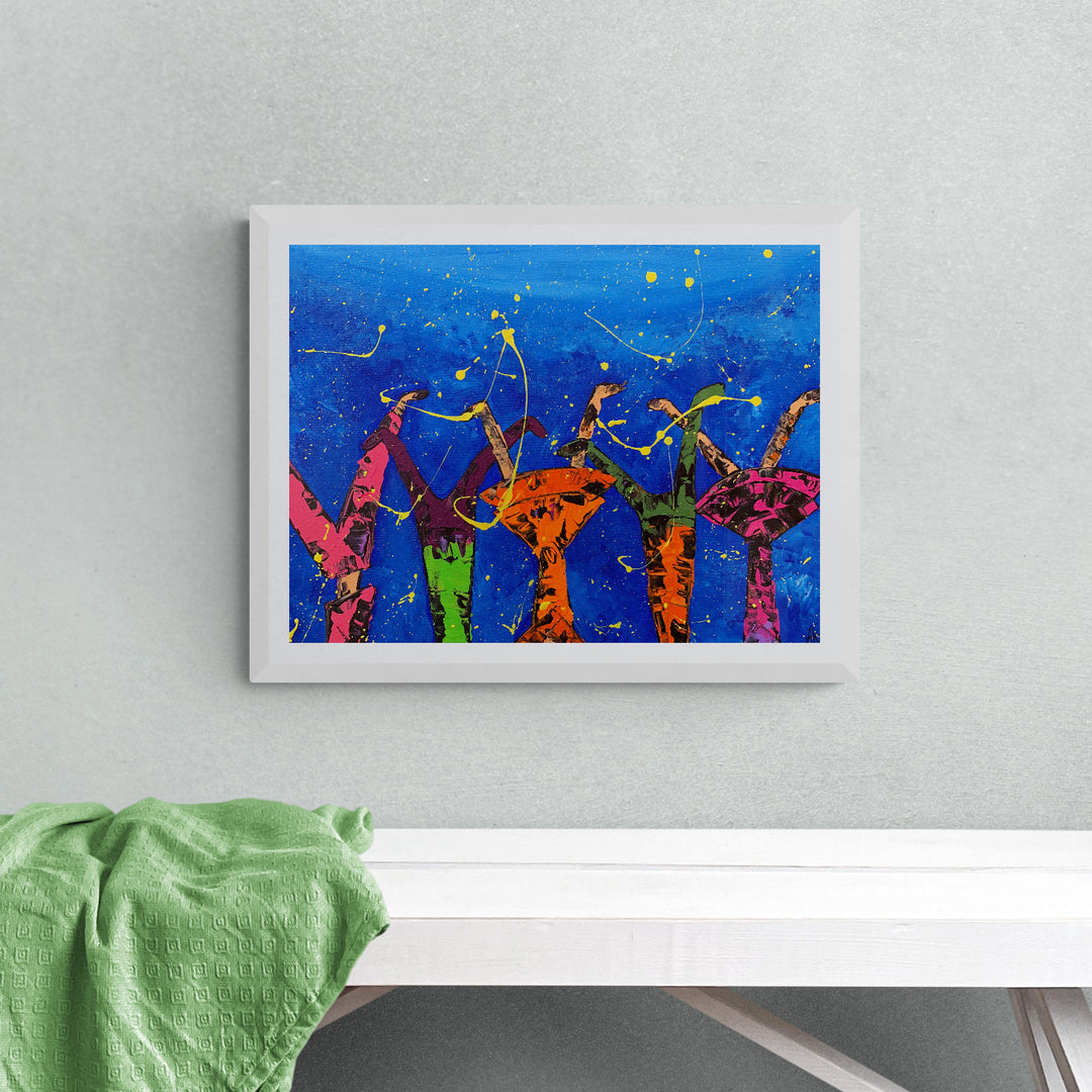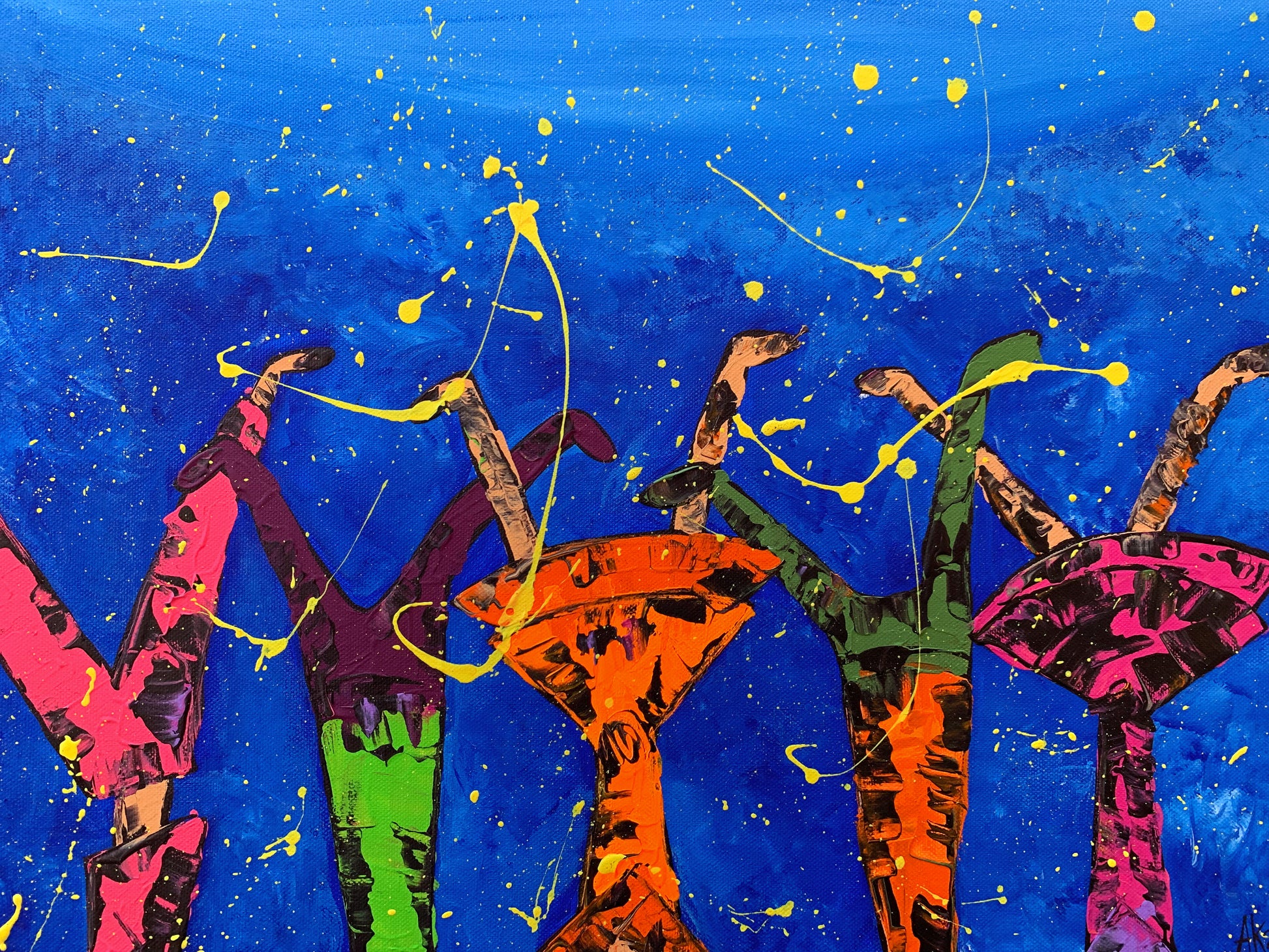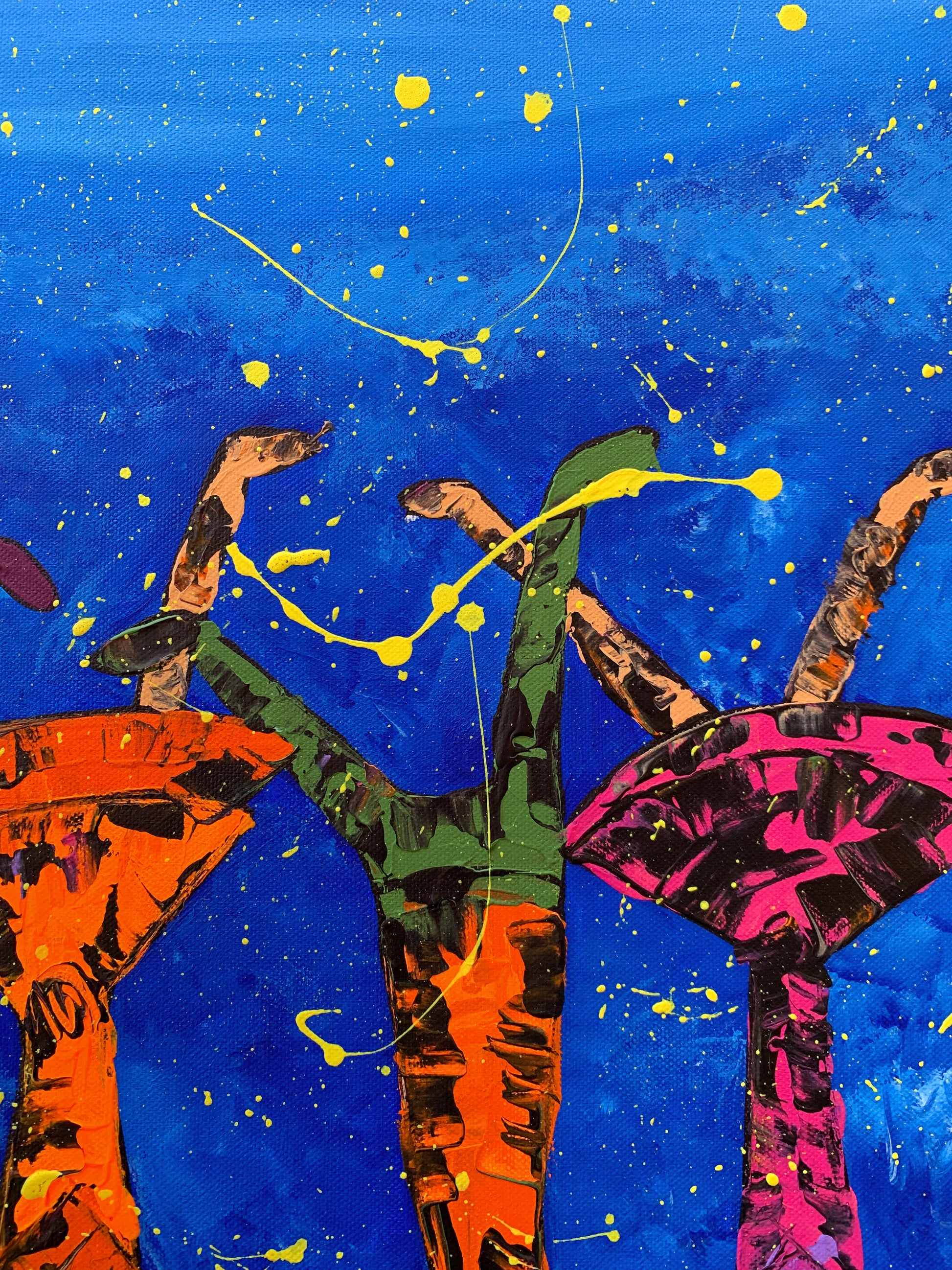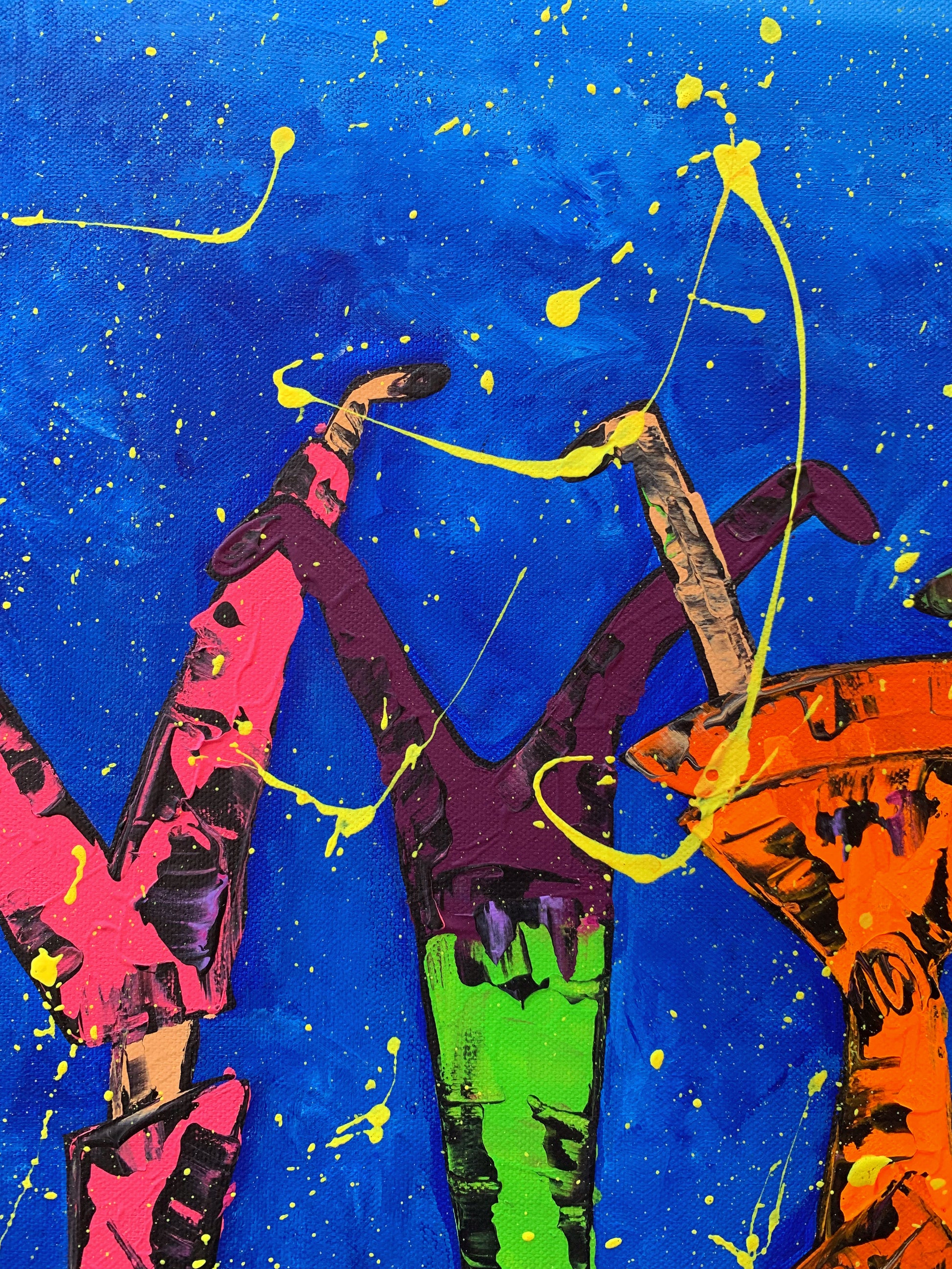 Inspirada en un episodio de la icónica caricatura: Los Supersónicos, donde todos bailan sin gravedad. La pintura captura la esencia futurista de la serie, transportándonos a un mundo donde la tecnología y la diversión se entrelazan en un espectáculo visual único. Utilizando una paleta de colores vibrantes para transmitir alegría desbordante.