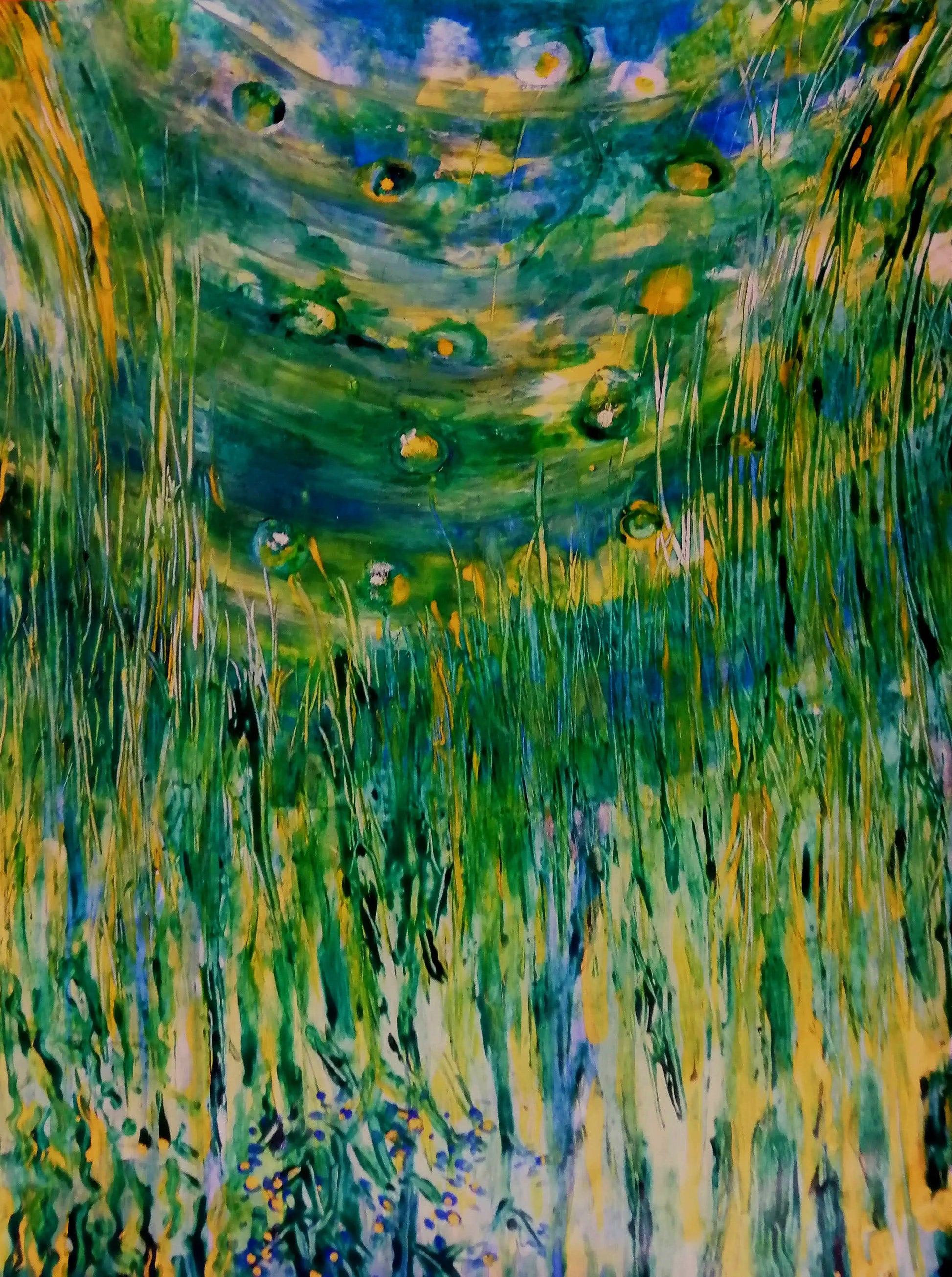 Bajo el agua, es una imagen creada a partir de la idea de que el espectador está mirando el estanque bajo la superficie del agua... El formato vertical permite invertir la pieza para observar el mismo paisaje sobre la superficie del agua.