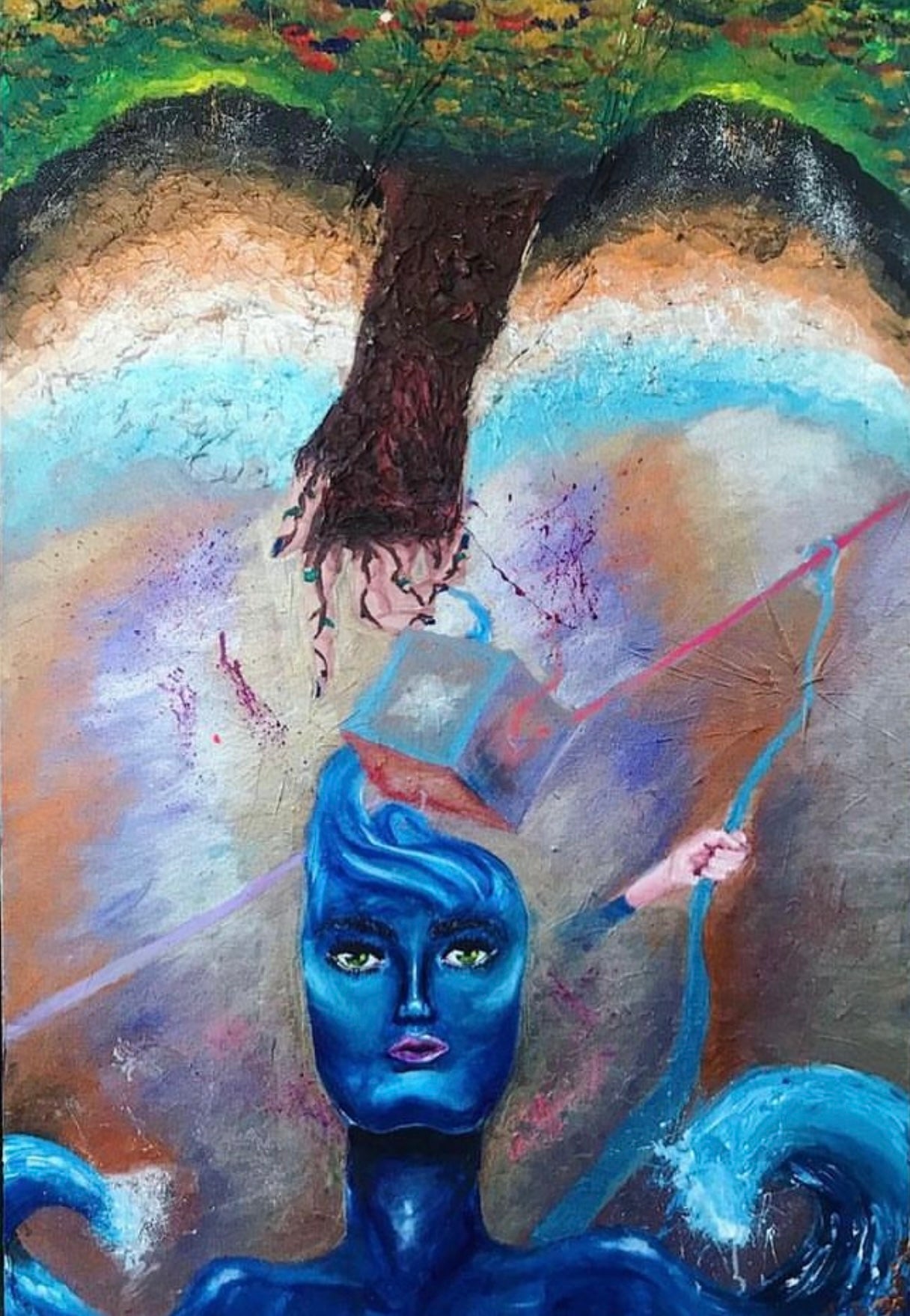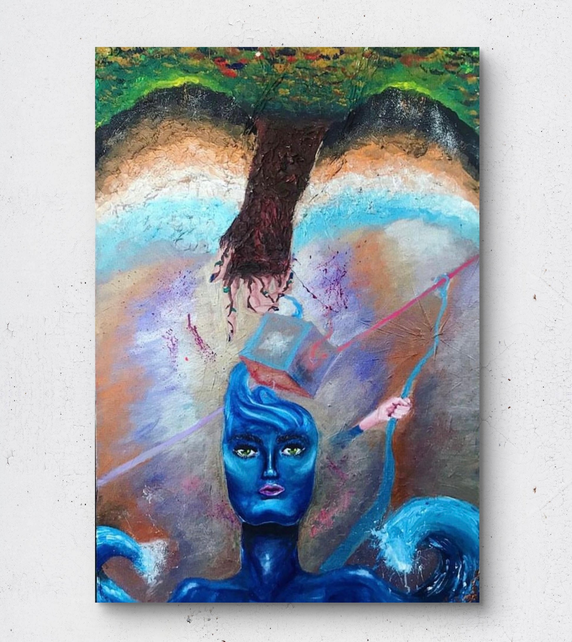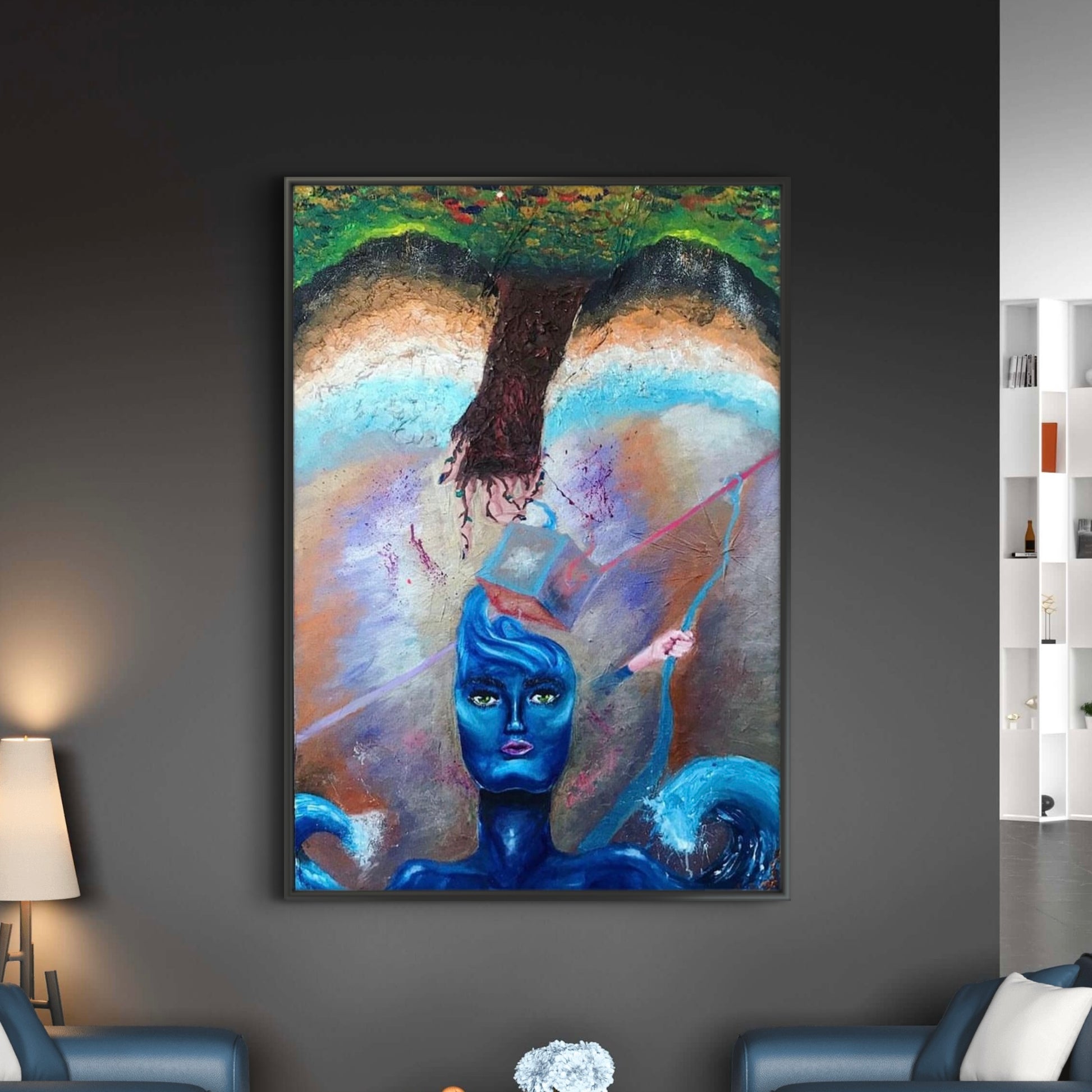 Manifiesta la relación entre los seres humanos y la naturaleza si eligieramos vivir en armonía. Es una pintura multidireccional, lo que significa que puede montarse verticalmente en cualquiera de los dos sentidos.