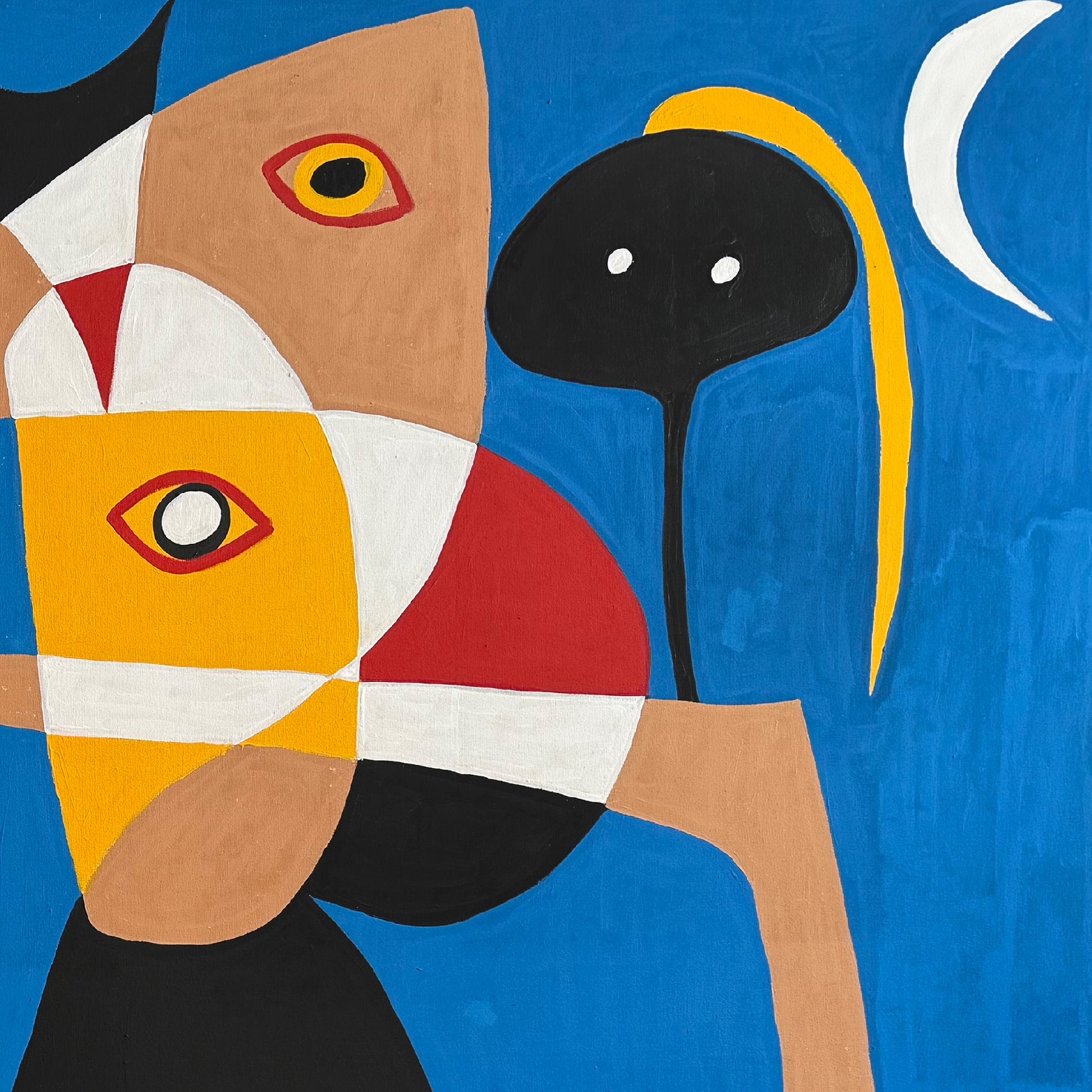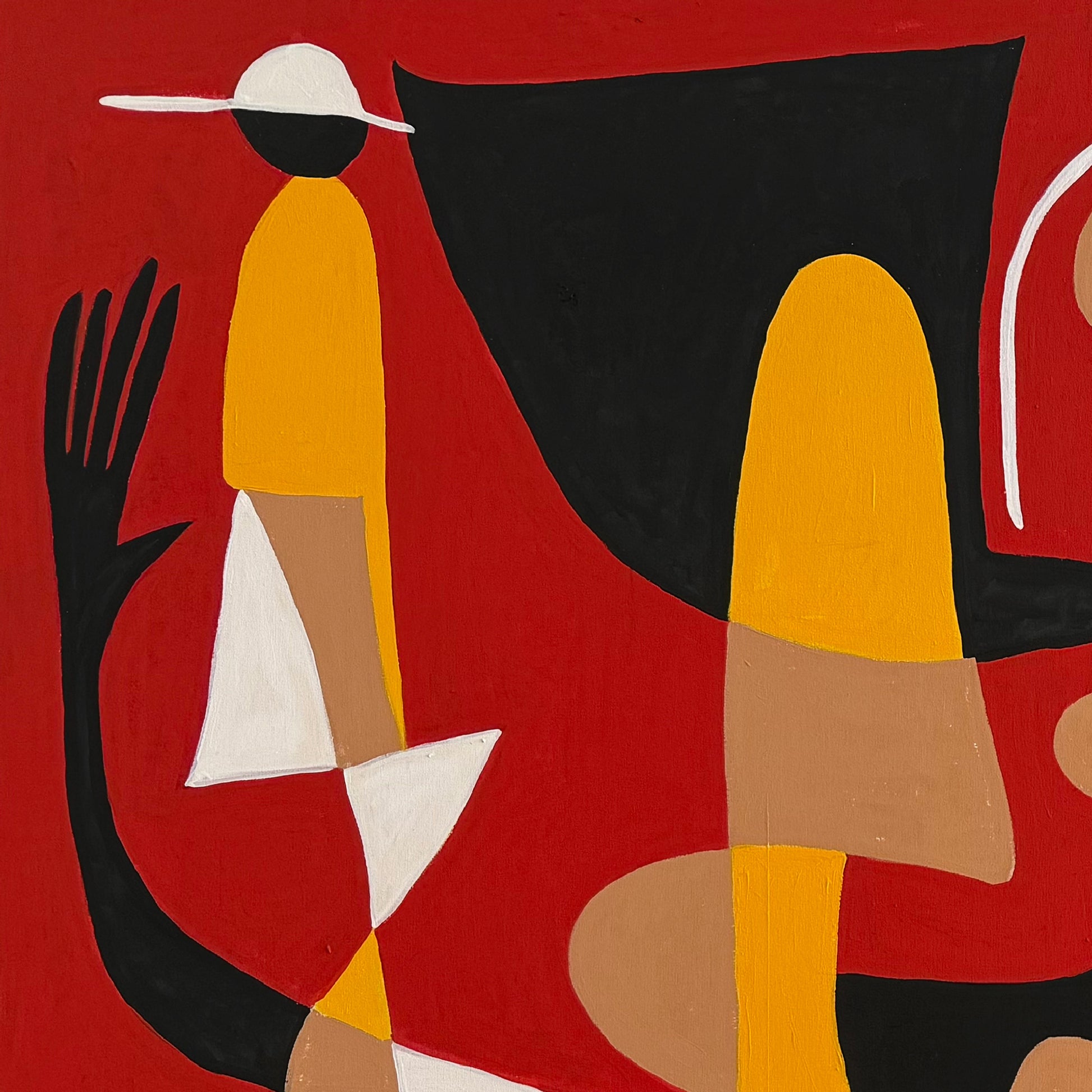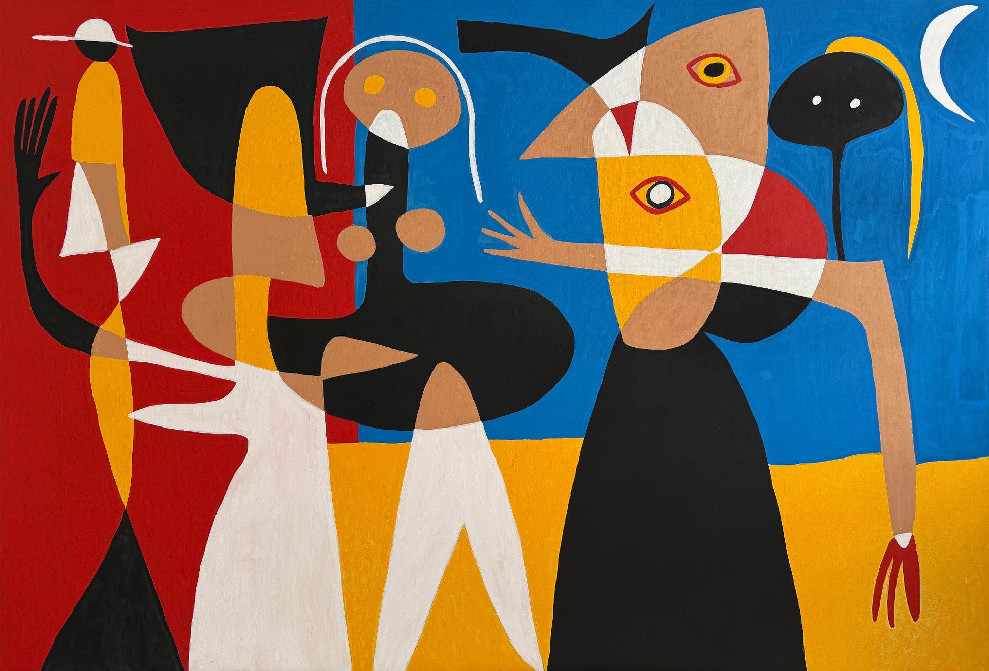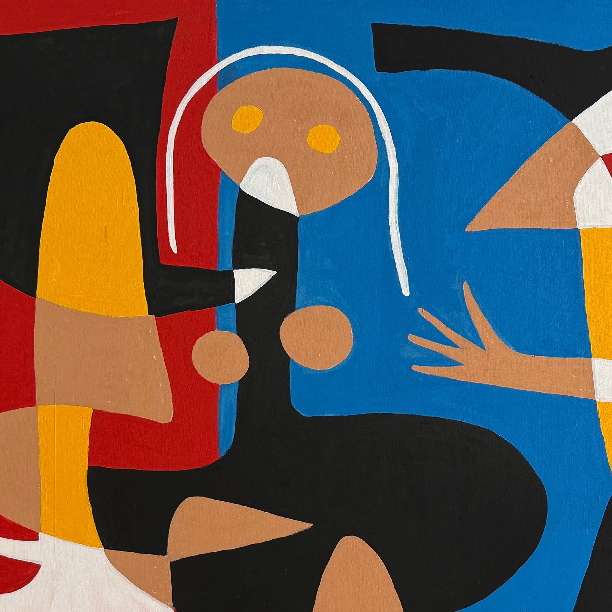La pintura se estructura a través de bloques cromáticos intensos, alternando entre geometrías rectilíneas y curvas orgánicas. Los personajes estilizados, de brazos extendidos y rostros divididos en planos de color, se proyectan como actores de una puesta en escena abstracta. El resultado es un dinamismo controlado, un equilibrio visual donde cada fragmento es indispensable para sostener la unidad del conjunto.