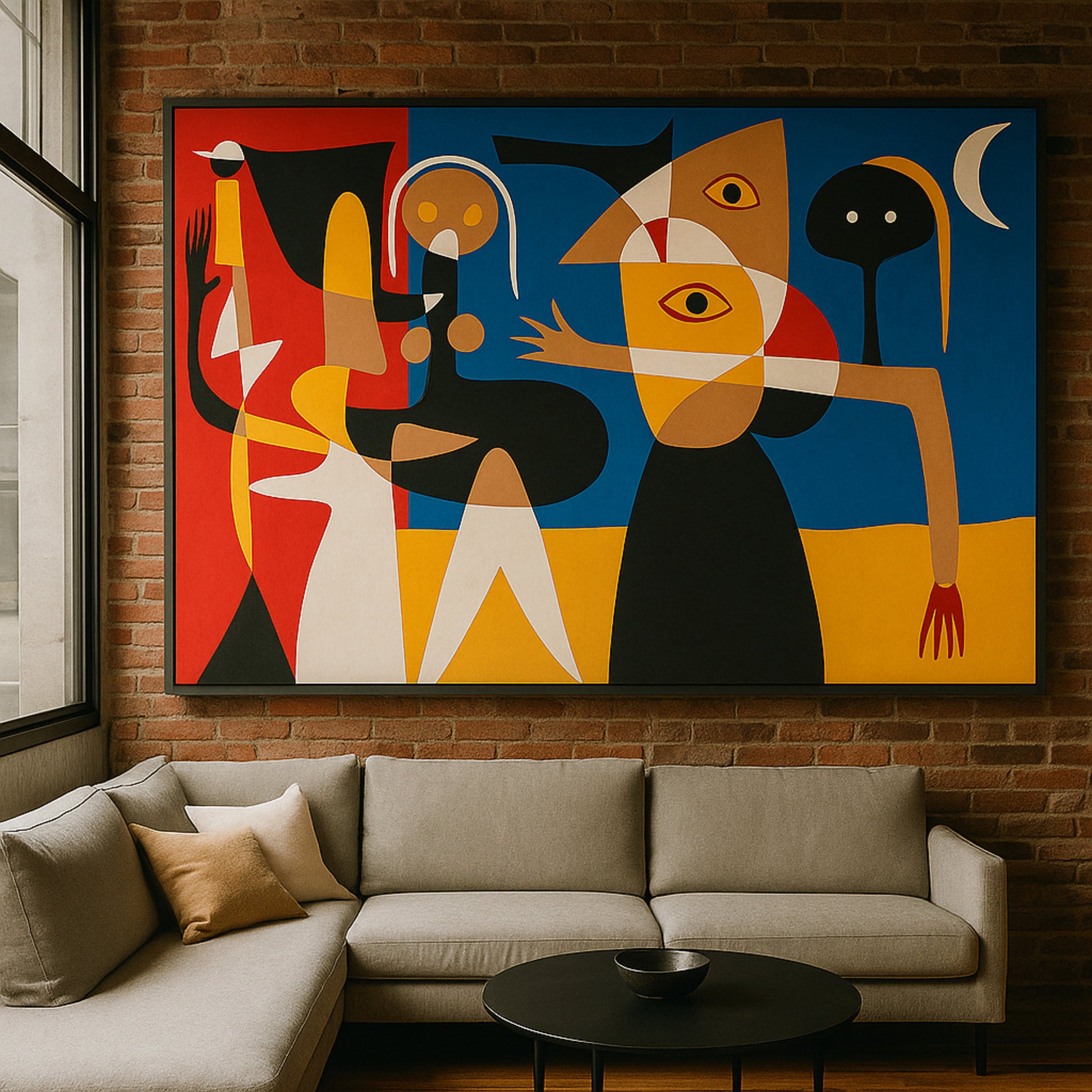 El rojo profundo otorga dramatismo, mientras el azul vibrante abre espacios de amplitud y libertad. Los acentos en amarillo y blanco iluminan la composición, y el negro estructural define contornos con solidez escultórica. La interacción entre estos tonos genera una atmósfera intensa y magnética, donde el color no solo define formas, sino que se convierte en el verdadero protagonista de la obra.