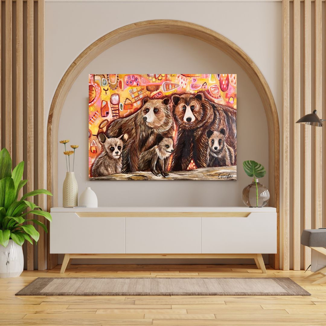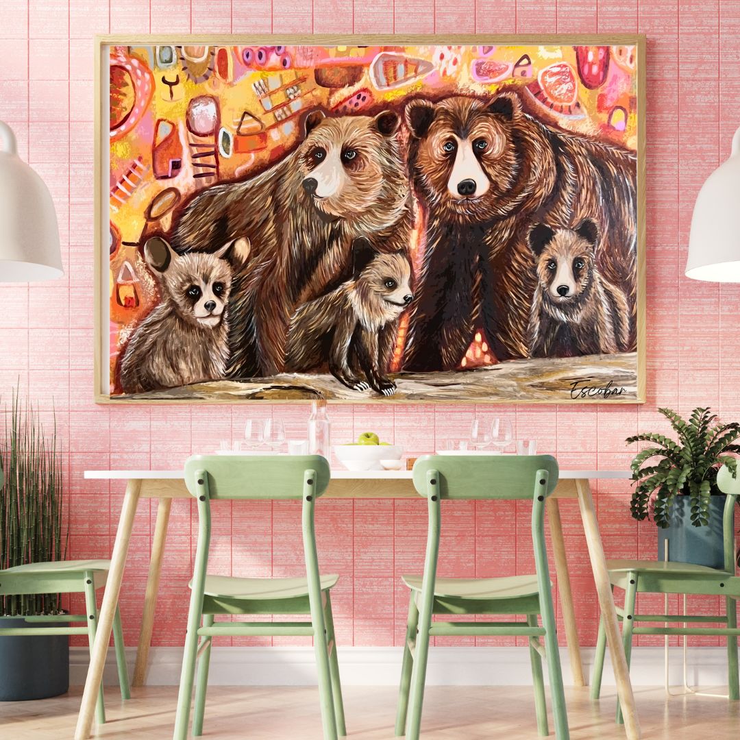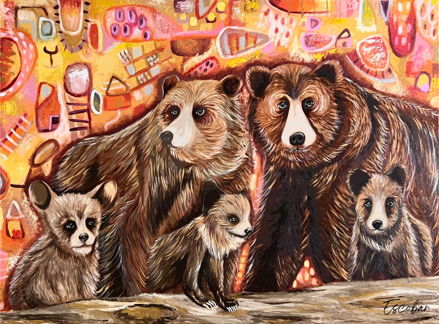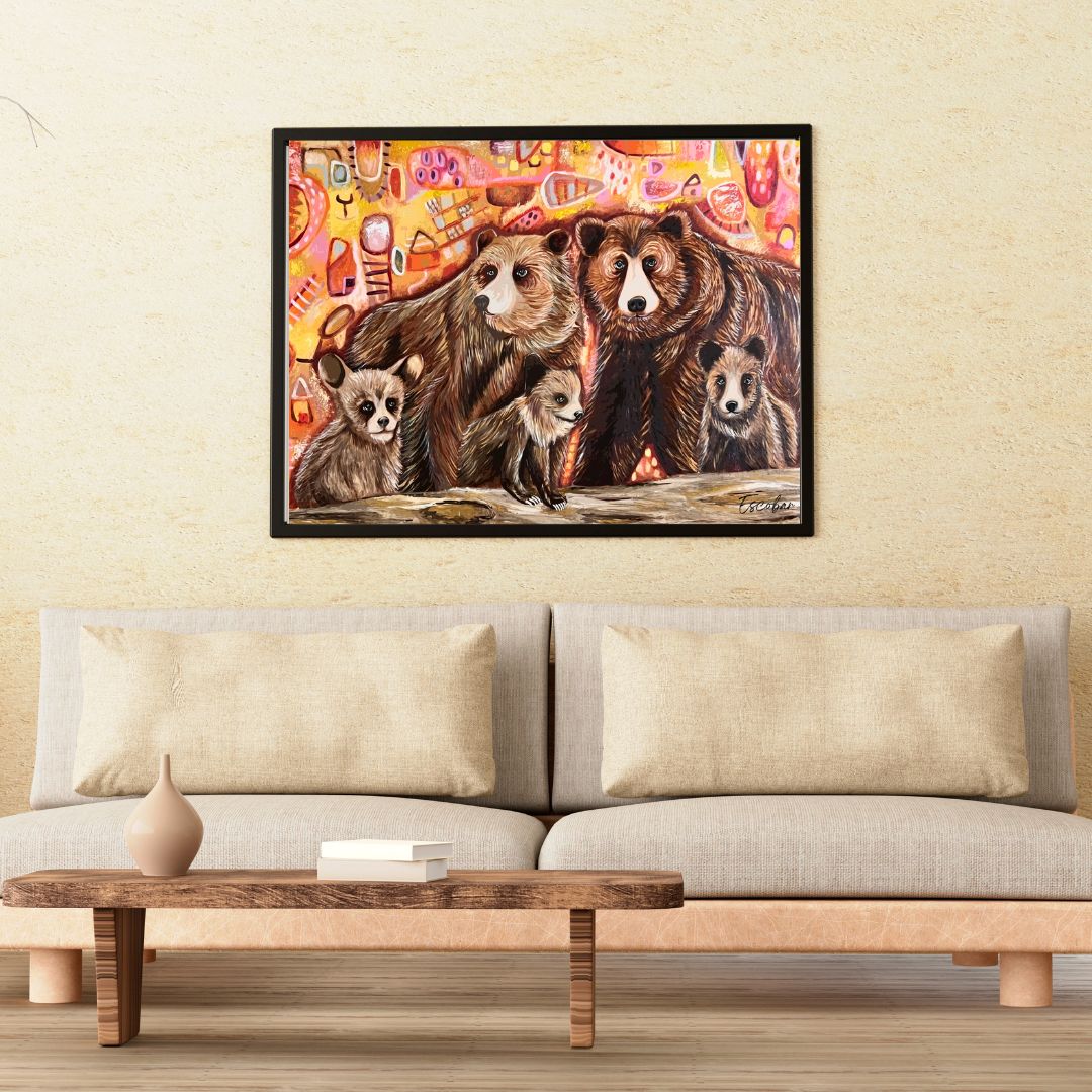 "Family Bears" Es una obre que representa a la familia, la unidad, la ternura, la mirada del jefe oso transmite limites y atención, una obra muy adecuada para la sala de la familia
