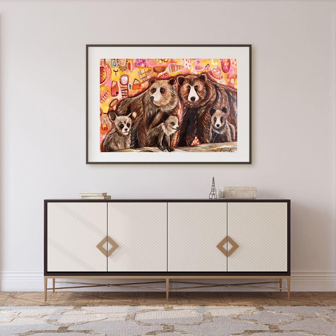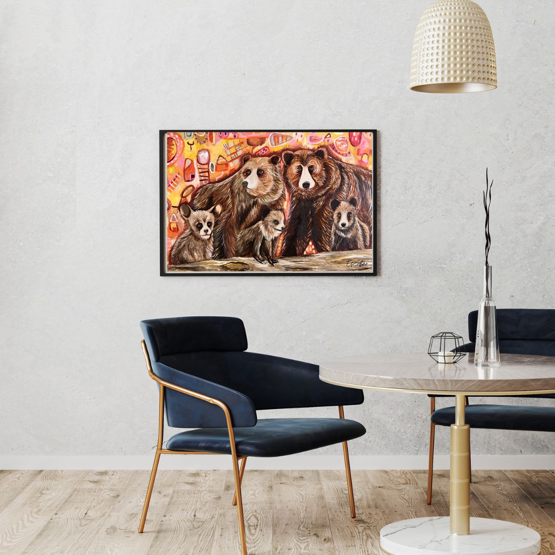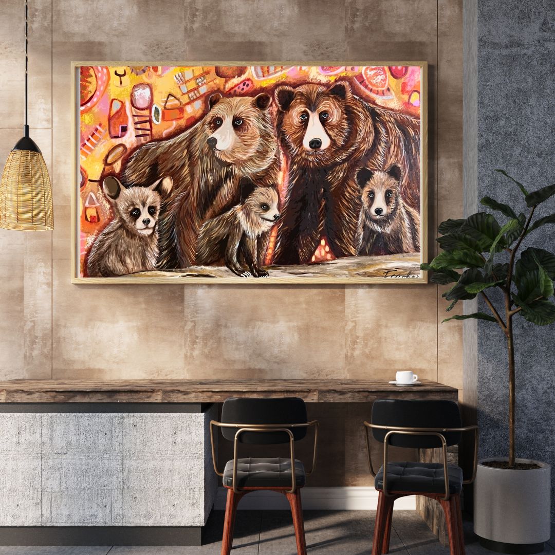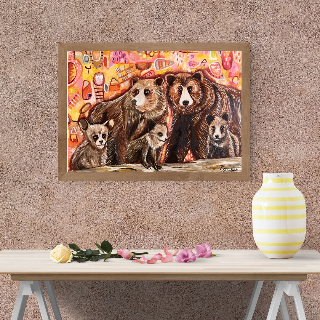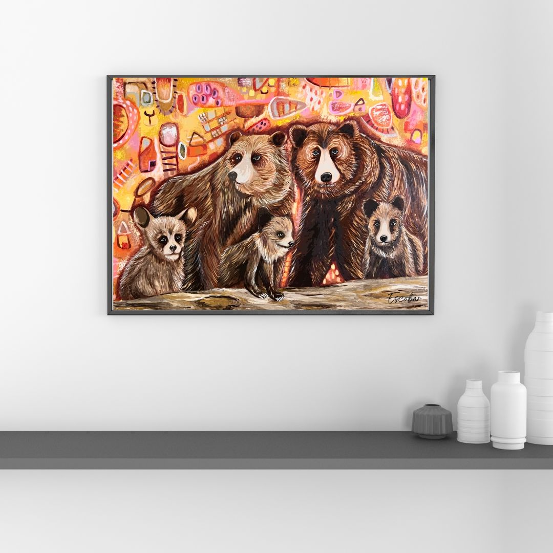 "Family Bears" Es una obre que representa a la familia, la unidad, la ternura, la mirada del jefe oso transmite limites y atención, una obra muy adecuada para la sala de la familia