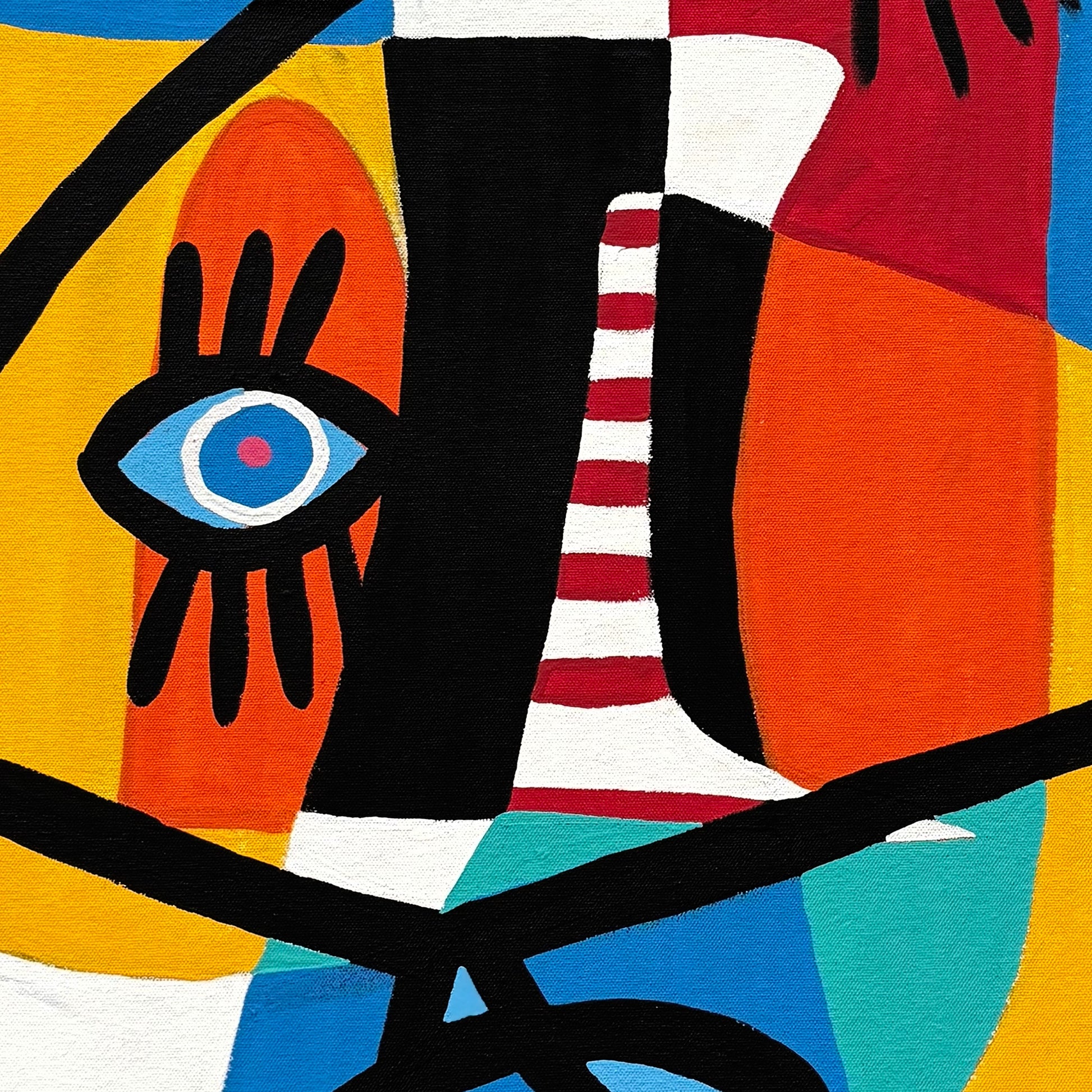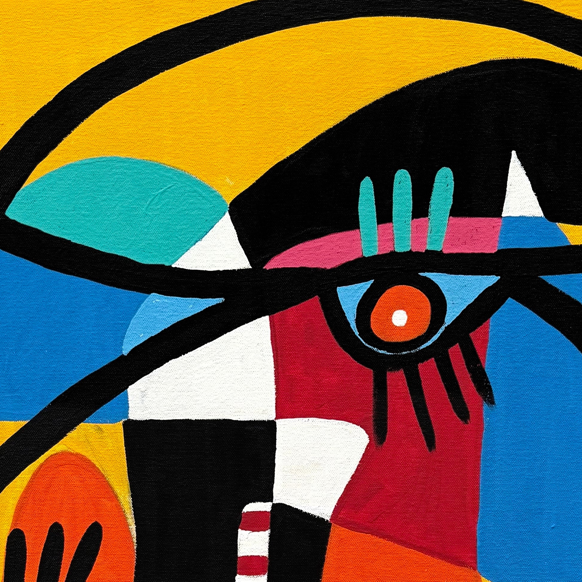 La inclusión de los ojos estilizados dentro de la figura introduce puntos de tensión visual que aportan identidad y carácter al personaje. Estos elementos gráficos fortalecen la presencia de una figura simbólica, manteniendo una narrativa abierta que se define más por la experiencia visual que por una lectura literal.