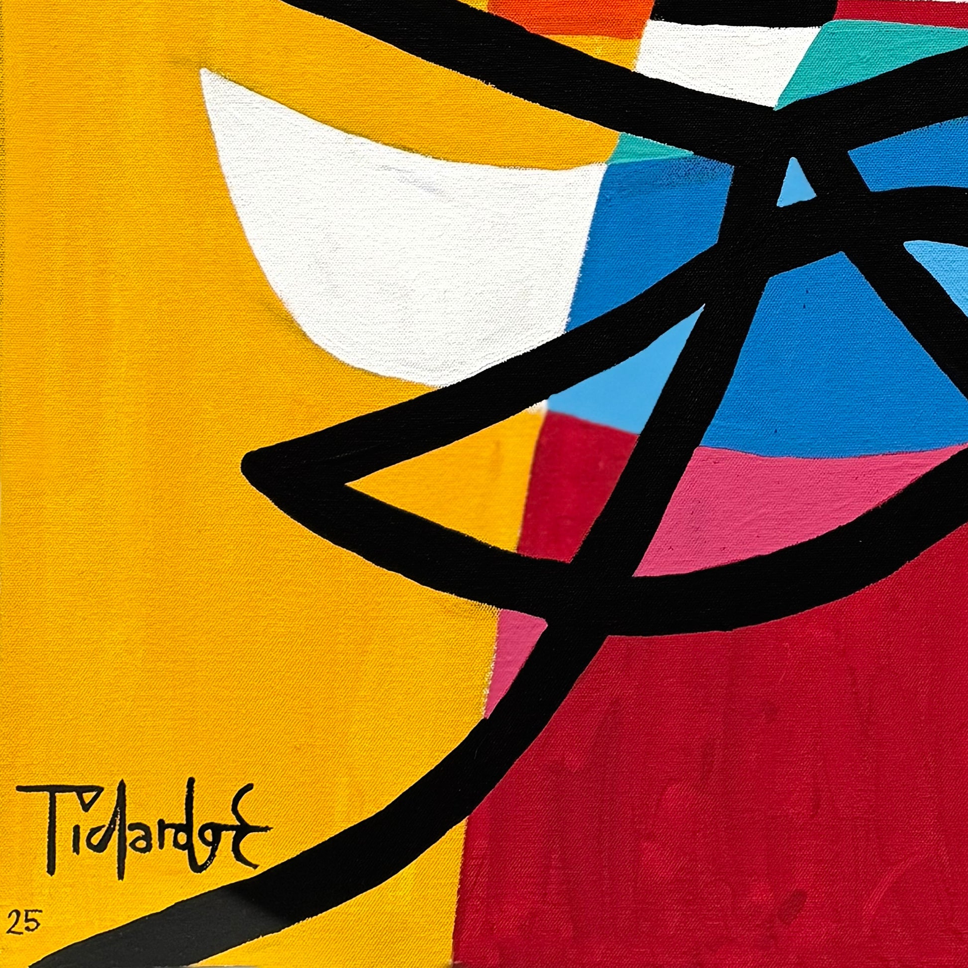 El uso de colores intensos como azul, rojo, naranja, turquesa, blanco y negro construye una imagen dinámica y equilibrada. Los bloques de color generan ritmo visual y profundidad sin recurrir a la representación realista, consolidando un lenguaje característico del arte acrílico de Enrique Pichardo.