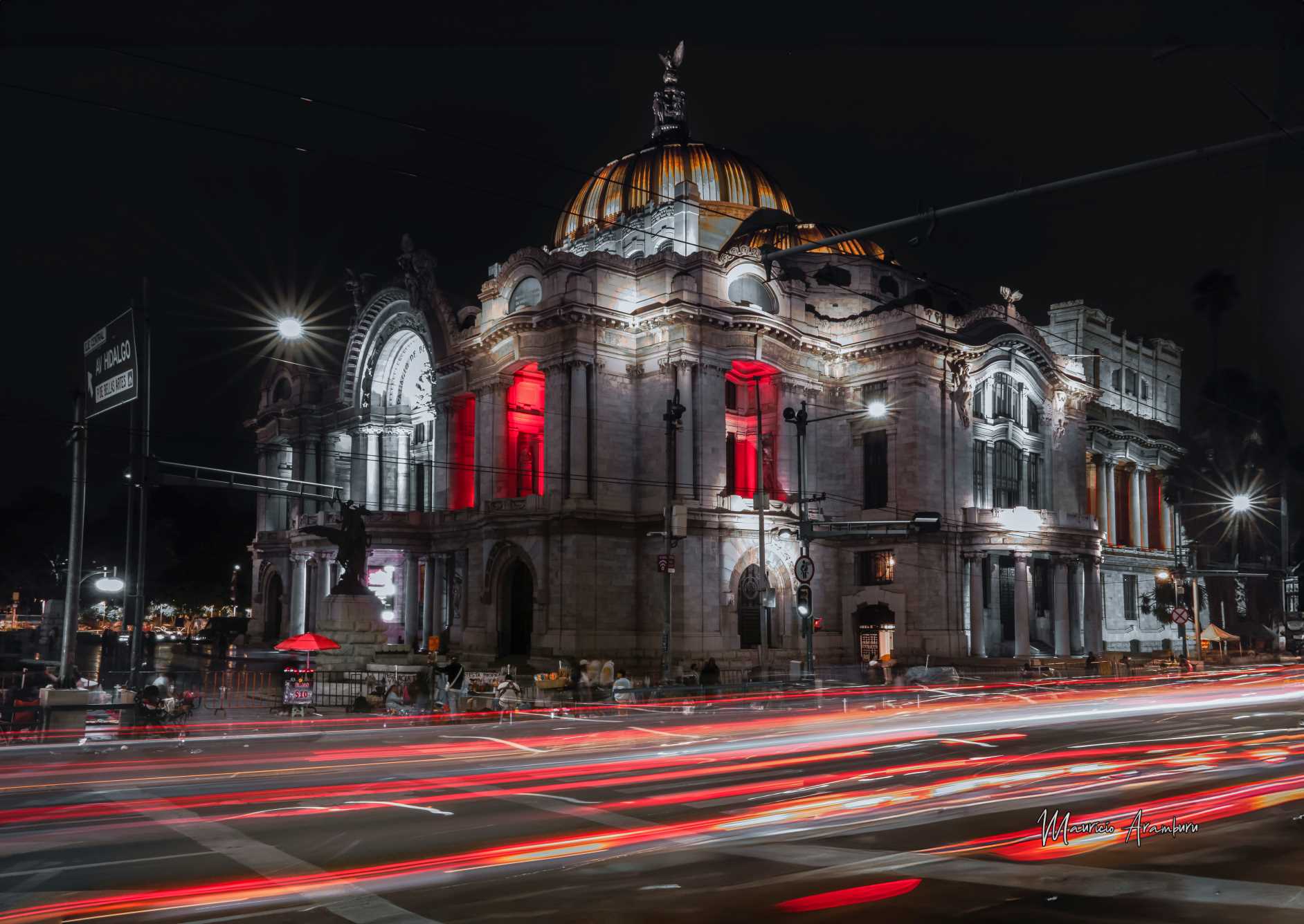 Fotografía larga exposición del Palacio de Bellas Artes desde Eje Central de noche en la CDMX