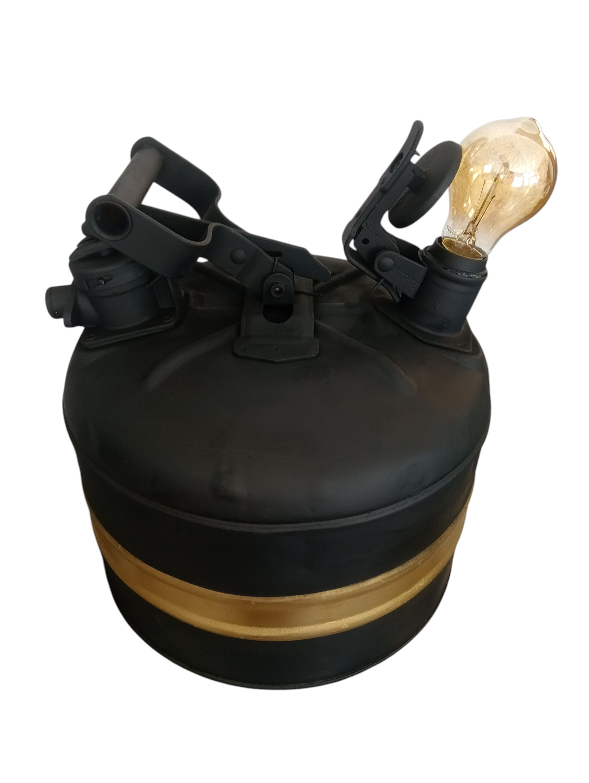 Esta pieza única forma parte de la colección de arte Upcycling de Calavera Estudio Dgo Mx. Fue creada a partir de un bidón de seguridad vintage, transformado en una lámpara de diseño industrial con acabado negro mate y detalles dorados. El foco de filamento tipo Edison resalta su estilo nostálgico y sofisticado, mientras que los mecanismos originales del bidón se integran como parte de la estética funcional. 💀♻️