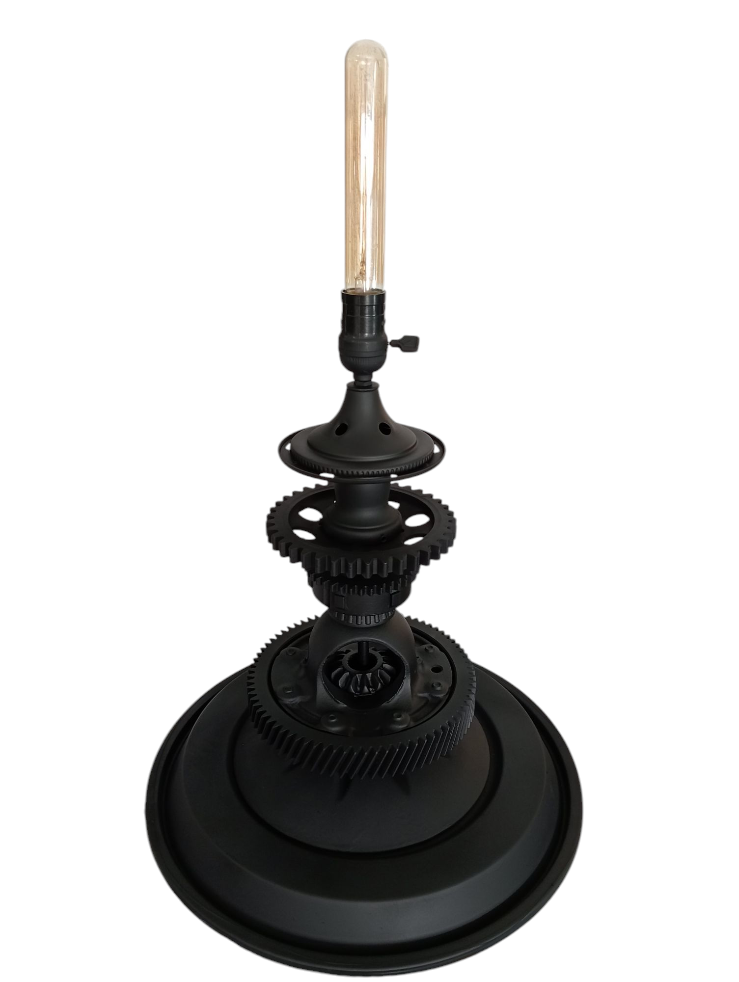 Esta lámpara escultórica surge del alma metálica de antiguos vehículos: la base es una tapa de filtro de aire de los años 80s, acompañada por un diferencial automotriz, engranes y piezas industriales recicladas. Cada elemento conserva su historia de movimiento y fuerza, ahora transformada en una obra única donde el pasado mecánico cobra vida con elegancia y carácter.