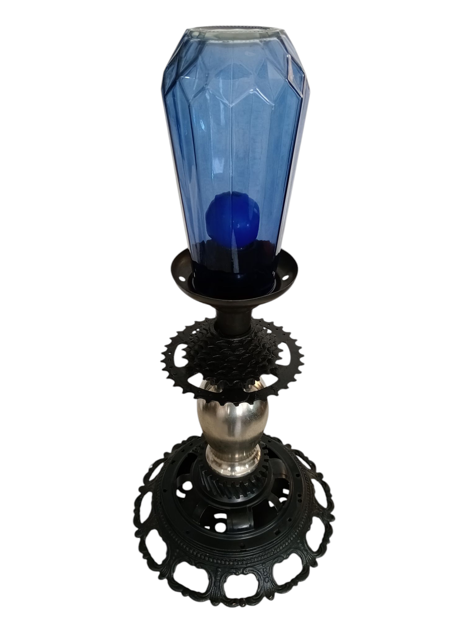 Esta lámpara única es una obra de arte reciclada que fusiona historia y creatividad. Confeccionada a partir de una base de plafón de techo, estructura de bocina, fragmentos de una lámpara vintage, una estrella de bicicleta y un florero, la pieza transforma objetos en desuso en una luminaria original y expresiva. Un homenaje al diseño sustentable con alma industrial y estética retro.