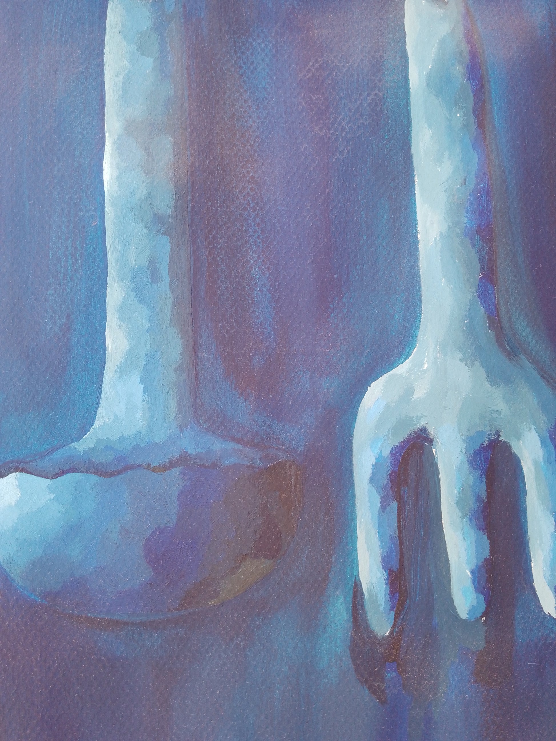 Elementos de cocina frente a un espacio simple y solitario, envueltos en un ambiente frío y tenue que contradice la atmósfera esperada en una cocina común.