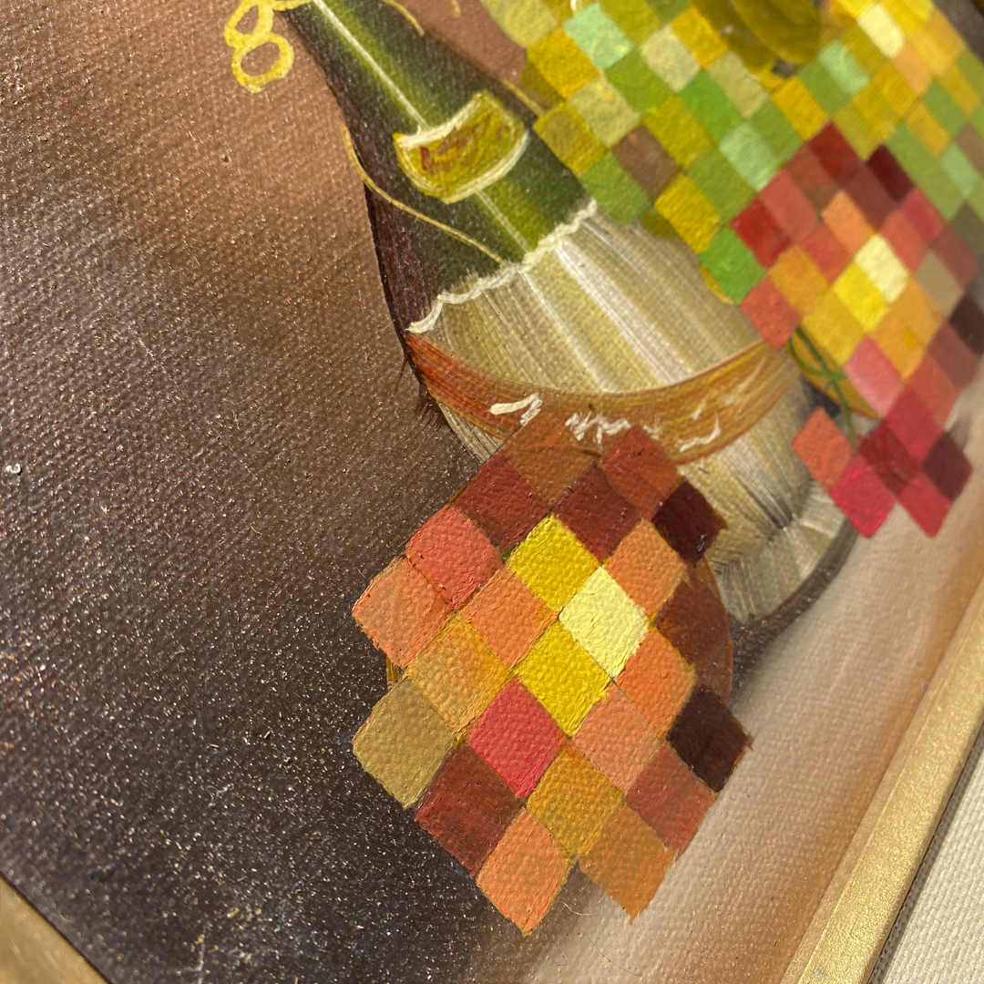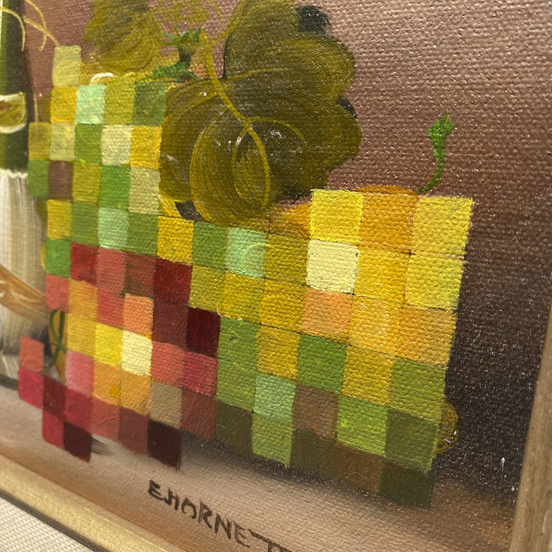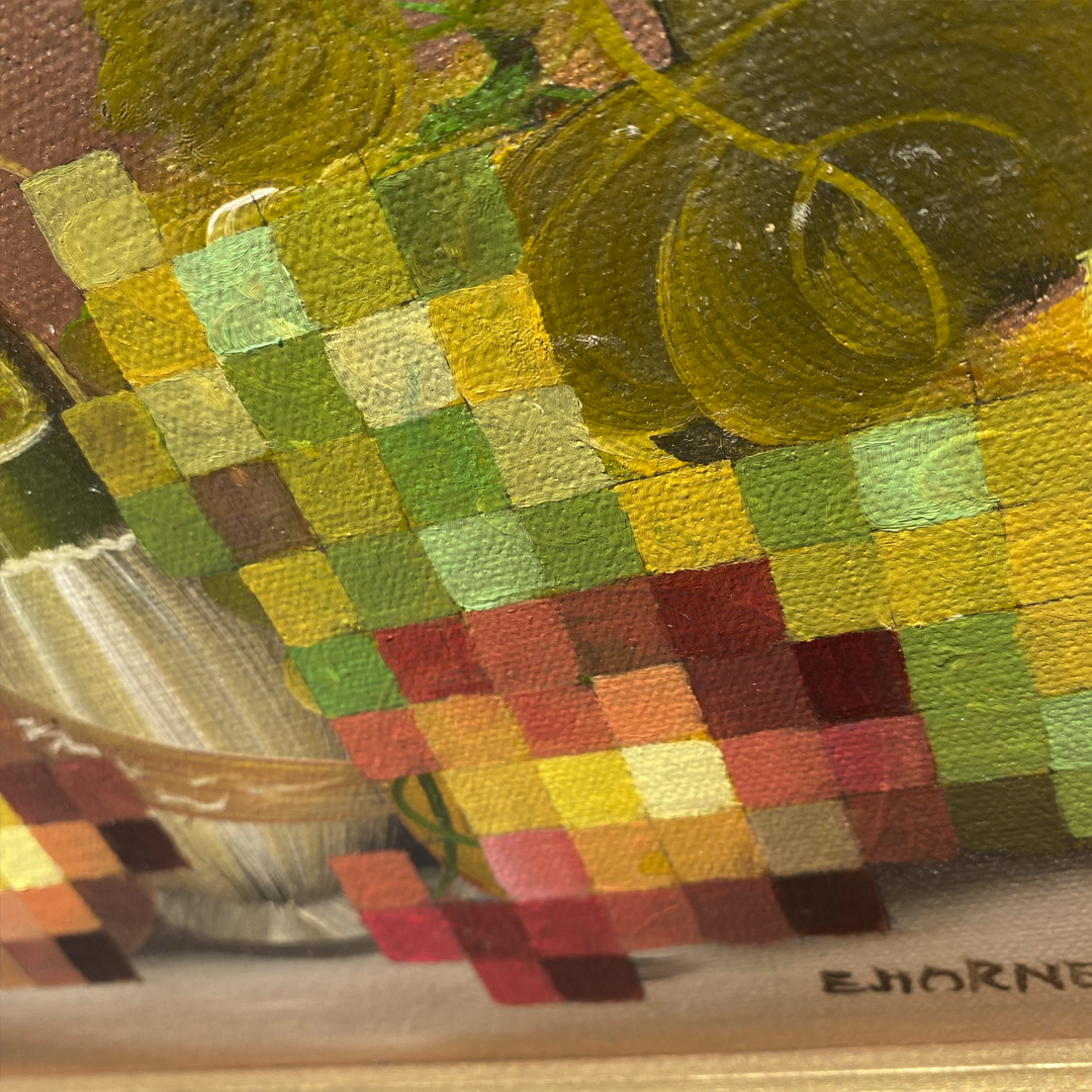 Esta obra es parte de una serie apropiacionista que interviene cuadros de tianguis de la CDMX. Muestra un bodegón, el cual ha sido intervenido al pixelear las frutas que se mostraban en este. El cuadro muestra valores de colores que ya existían en la obra original, mostrando la misma esencia de la pintura original pero son una composición y contextos diferentes.
