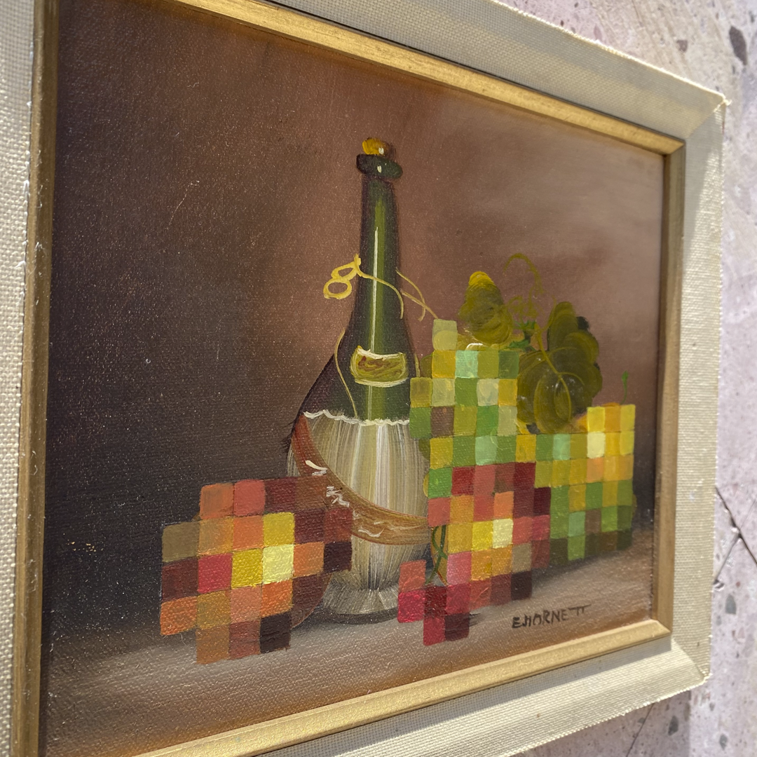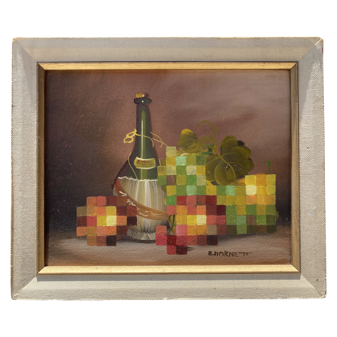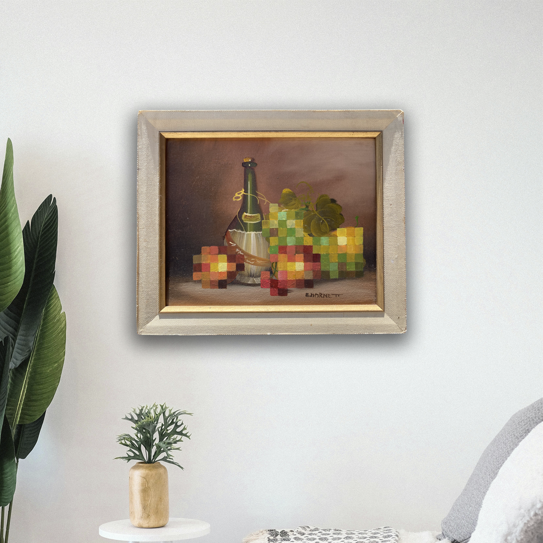 Esta obra es parte de una serie apropiacionista que interviene cuadros de tianguis de la CDMX. Muestra un bodegón, el cual ha sido intervenido al pixelear las frutas que se mostraban en este. El cuadro muestra valores de colores que ya existían en la obra original, mostrando la misma esencia de la pintura original pero son una composición y contextos diferentes.