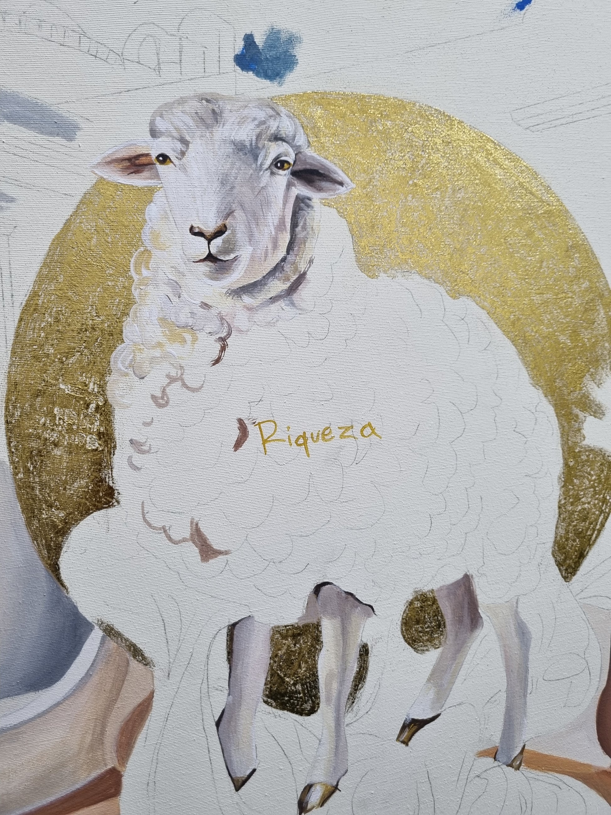 la pintura invita al espectador a conectar con la idea de que la verdadera abundancia proviene de un estado de fluidez y equilibrio, donde lo material y lo espiritual se fusionan en un solo latido.
