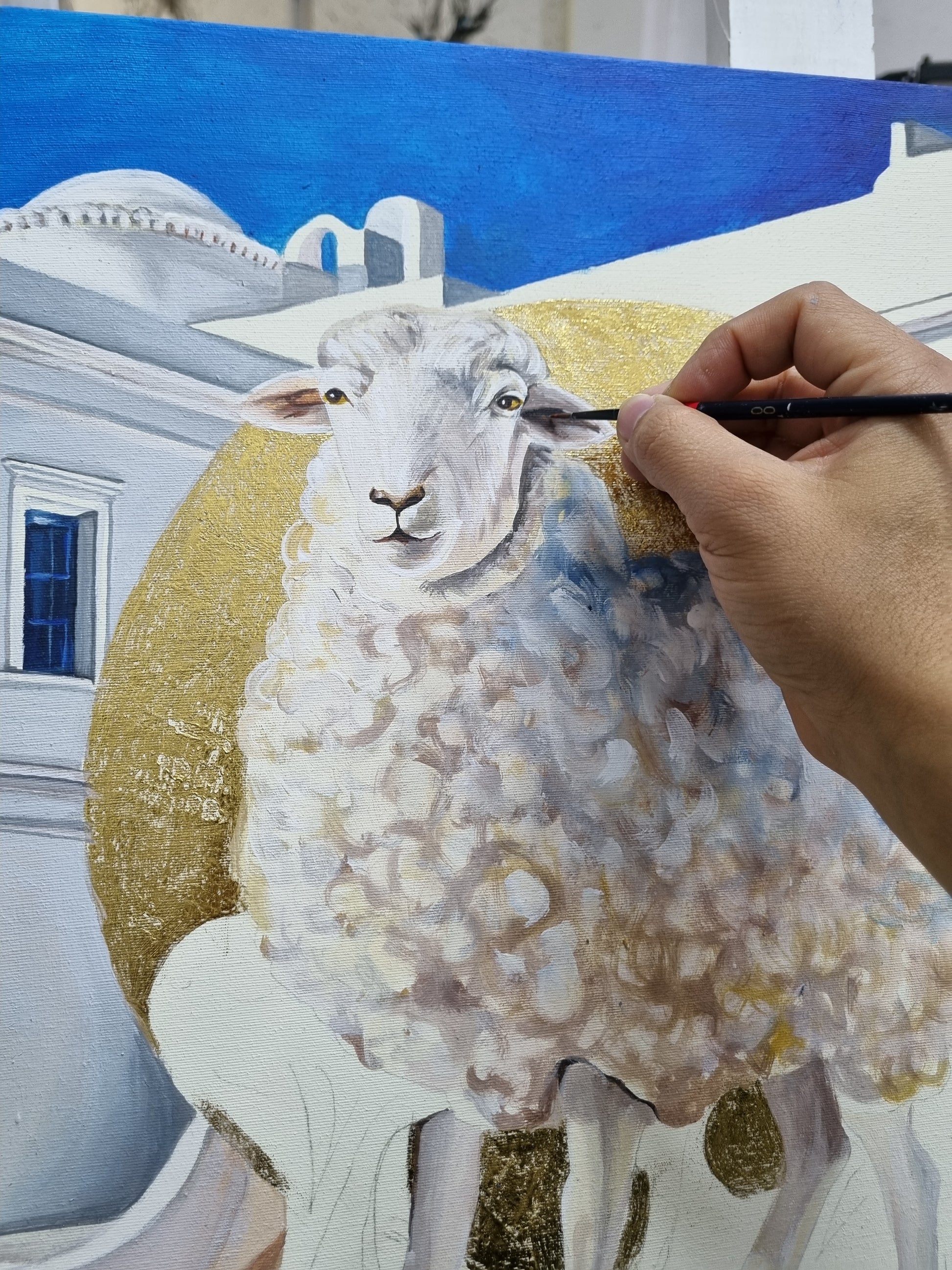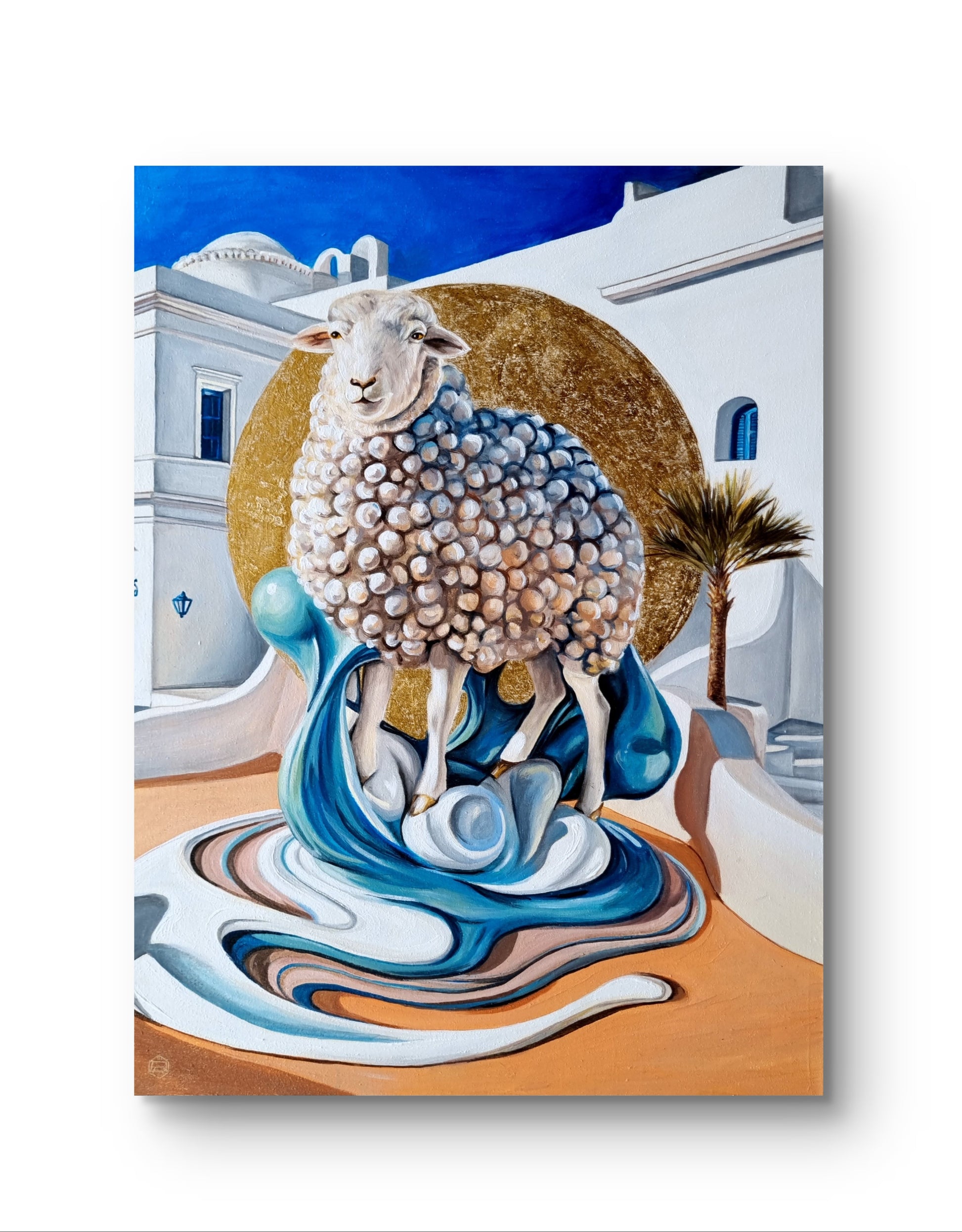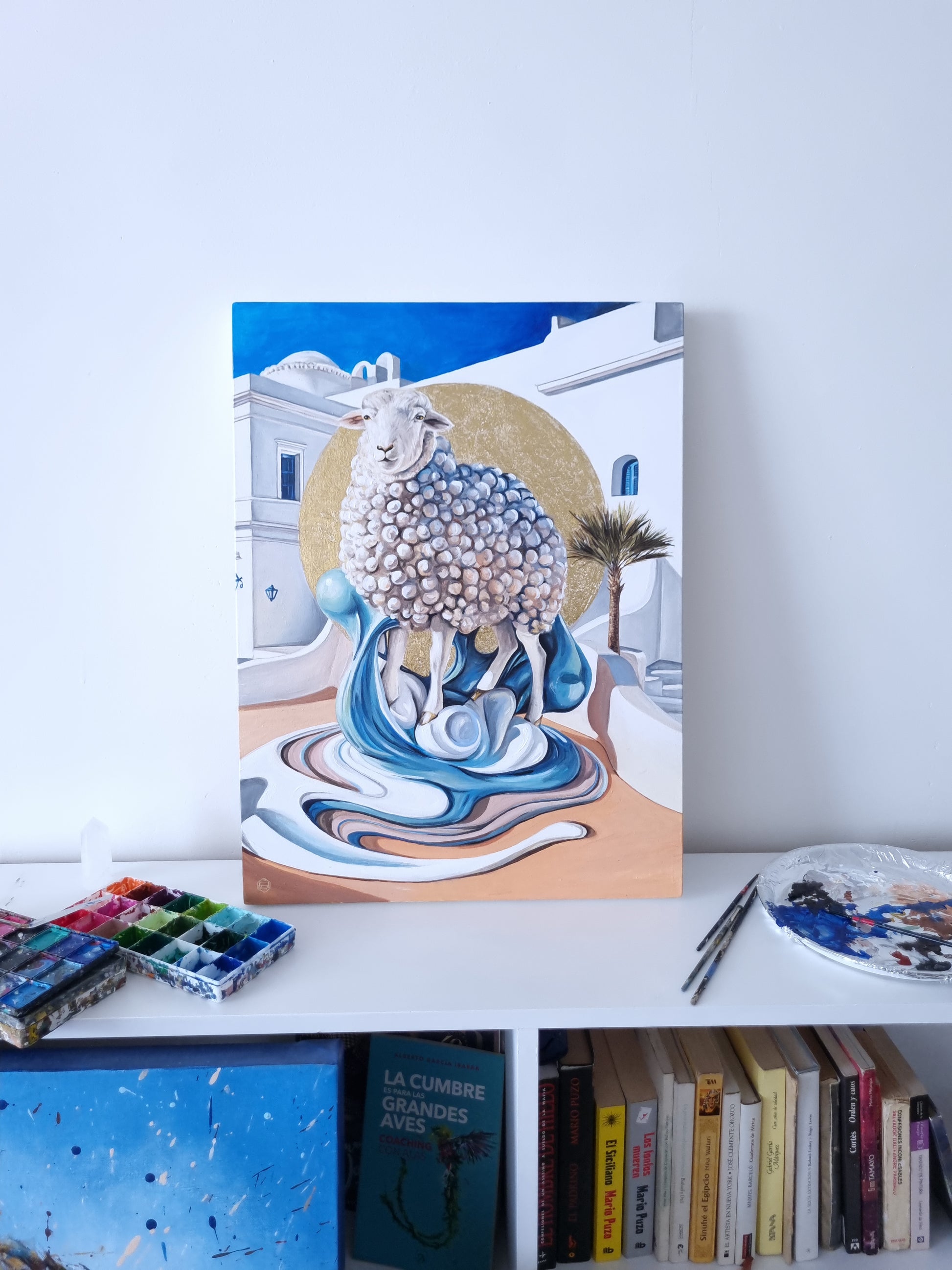 En esta pintura, un borrego se alza en el centro del lienzo, envuelto en una atmósfera mediterránea de blancos puros y azules profundos.