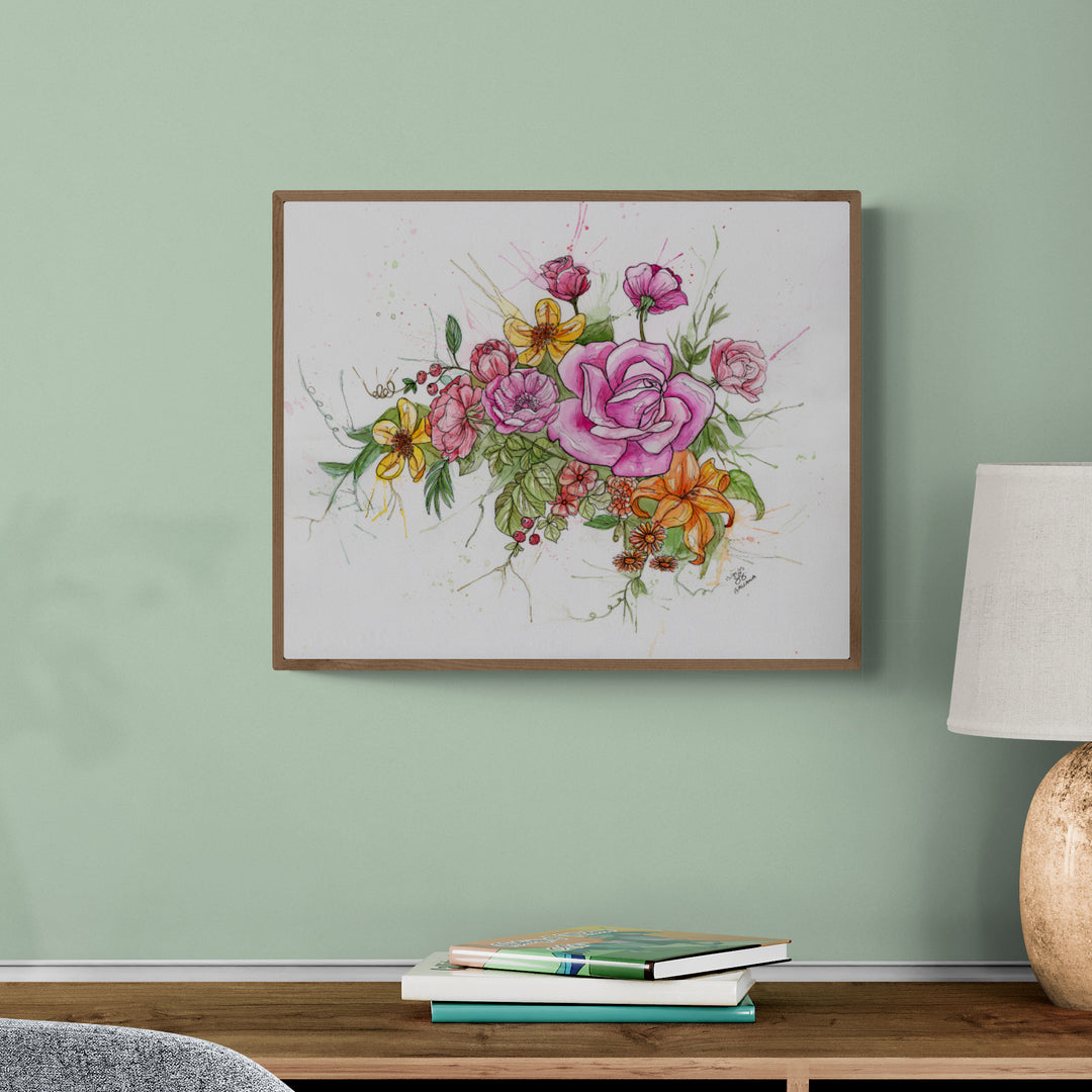 Esta pieza es una acuarela con tinta que busca reflejar la frescura de un bouquet de flores a través de las manchas libres y el color brillante de tonos, mezclado con el control que ofrece la línea para poder apreciar mejor lo orgánico de las formas.