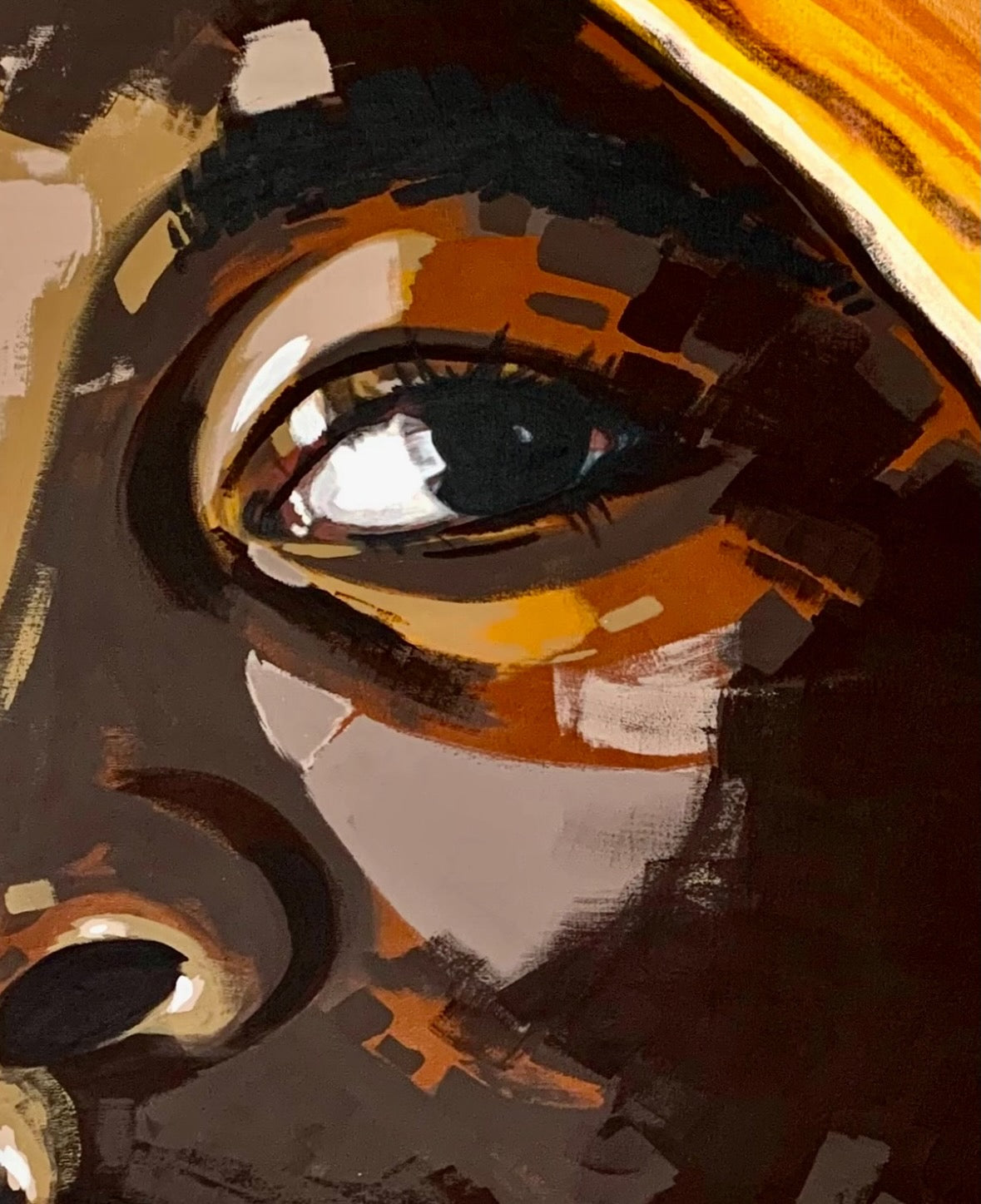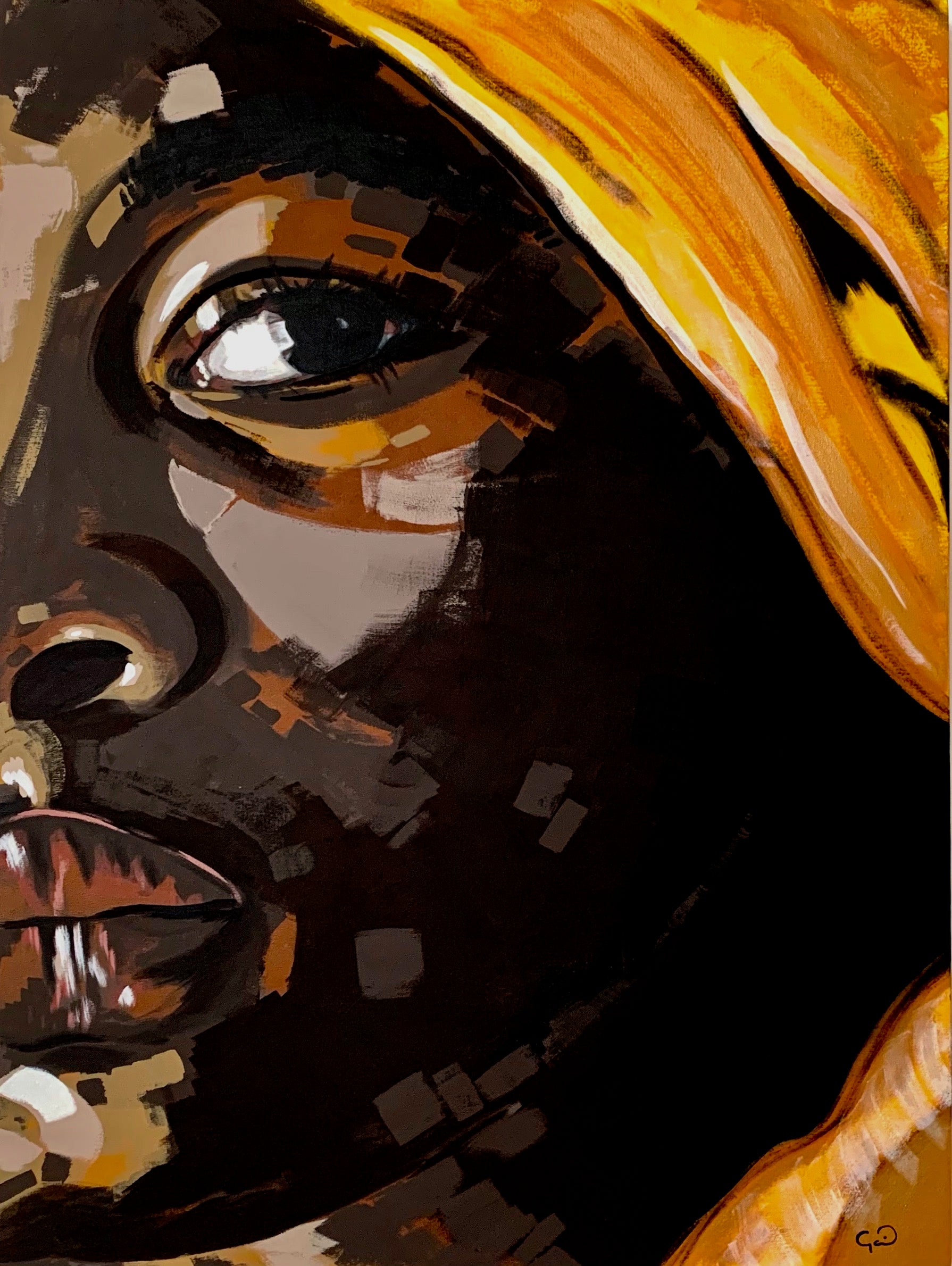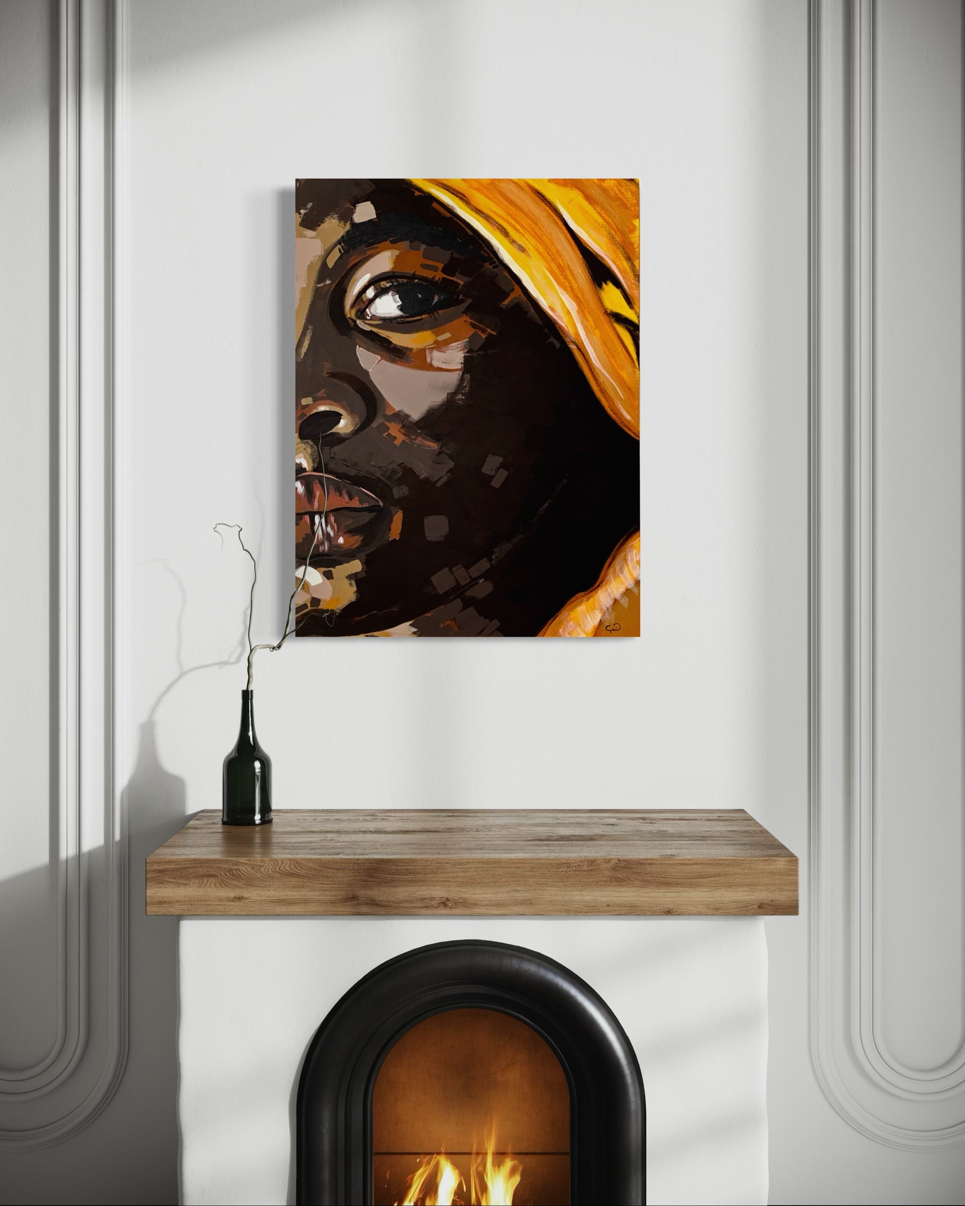La paleta cromática, dominada por tonos oscuros que se entrelazan con amarillos vibrantes, crea un contraste expresivo que intensifica la dualidad femenina: fuerza y ternura, fuego y calma. Cada trazo construye un lenguaje visual en el que el gesto se convierte en símbolo de valentía y resiliencia.