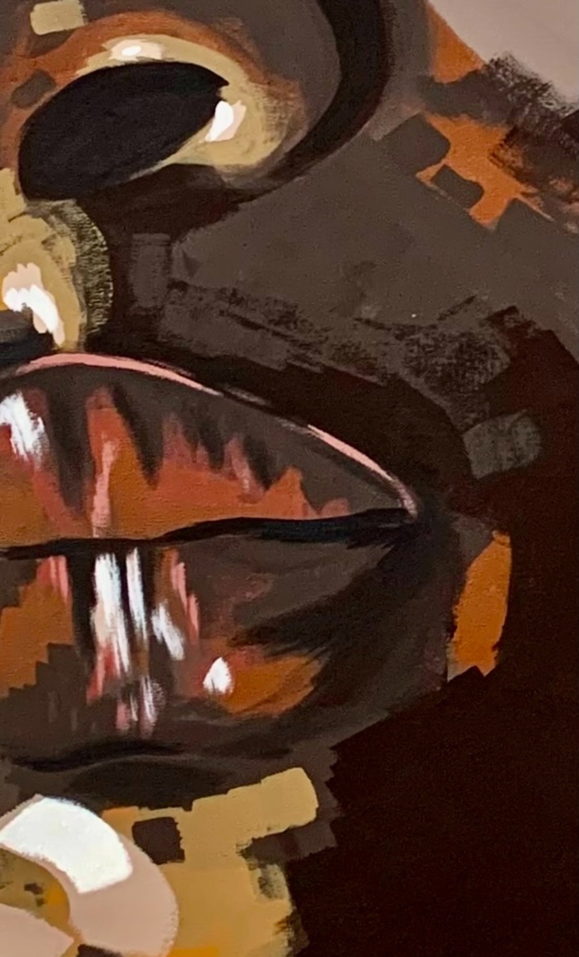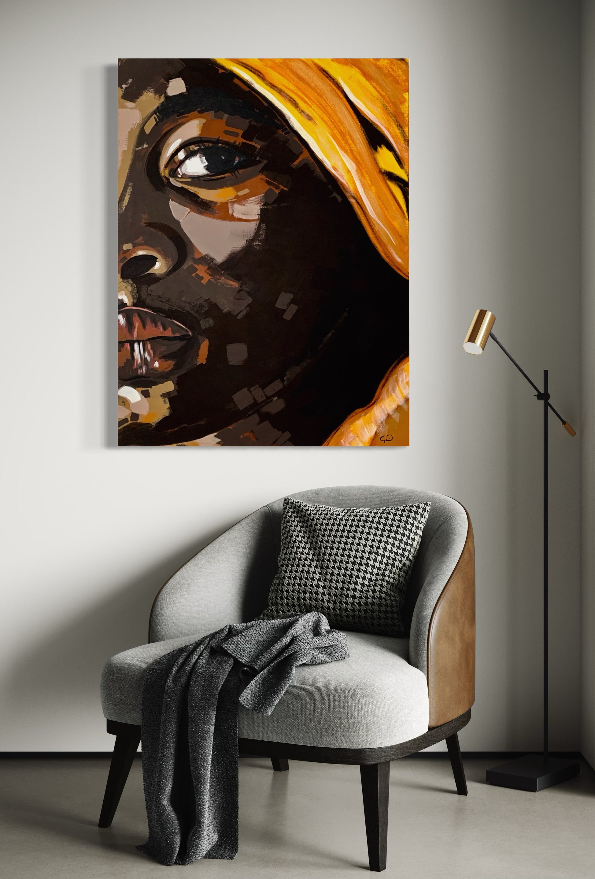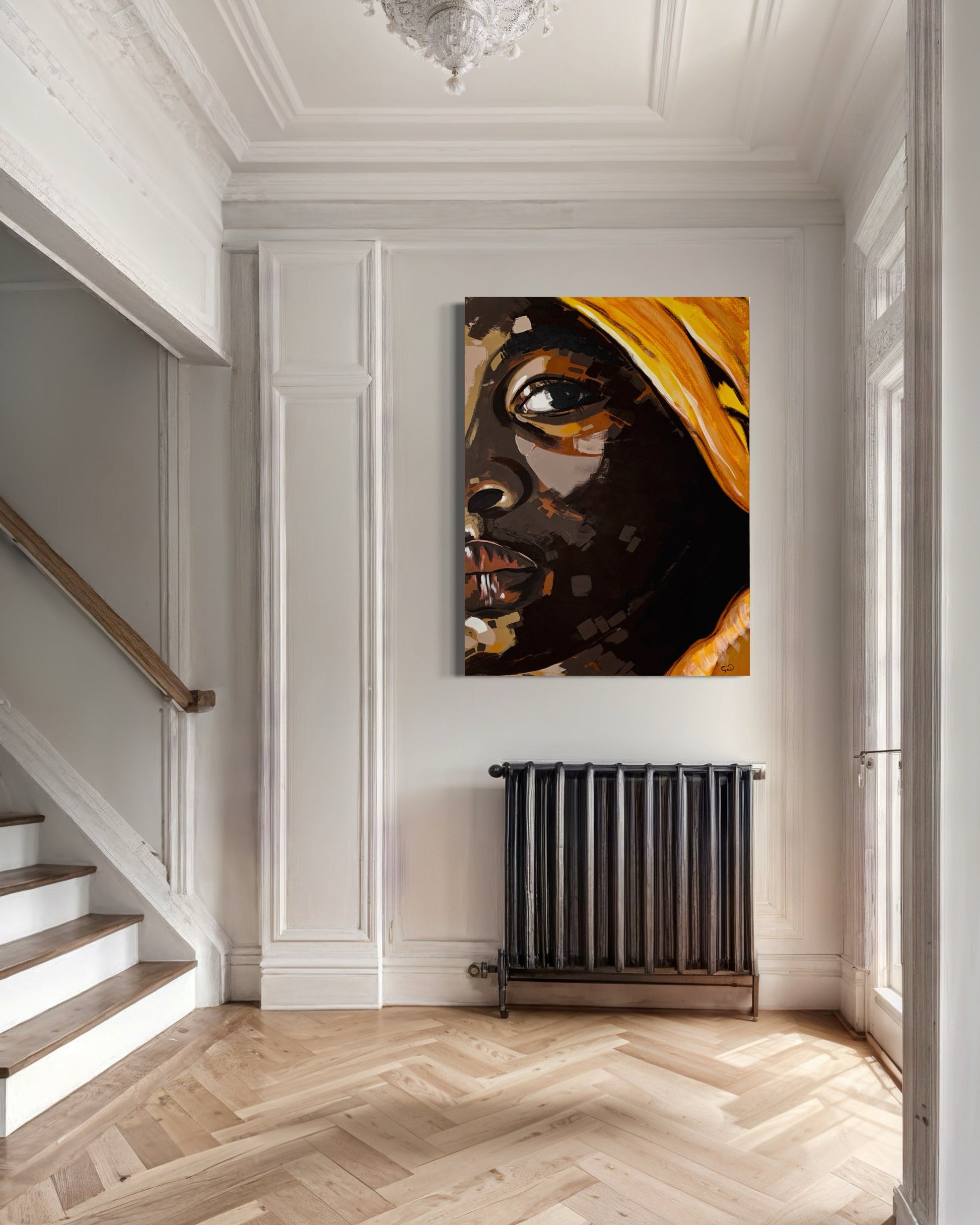 La paleta cromática, dominada por tonos oscuros que se entrelazan con amarillos vibrantes, crea un contraste expresivo que intensifica la dualidad femenina: fuerza y ternura, fuego y calma. Cada trazo construye un lenguaje visual en el que el gesto se convierte en símbolo de valentía y resiliencia.