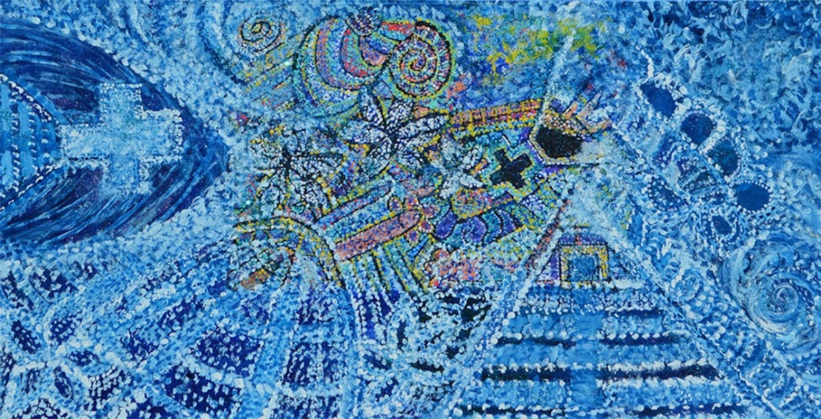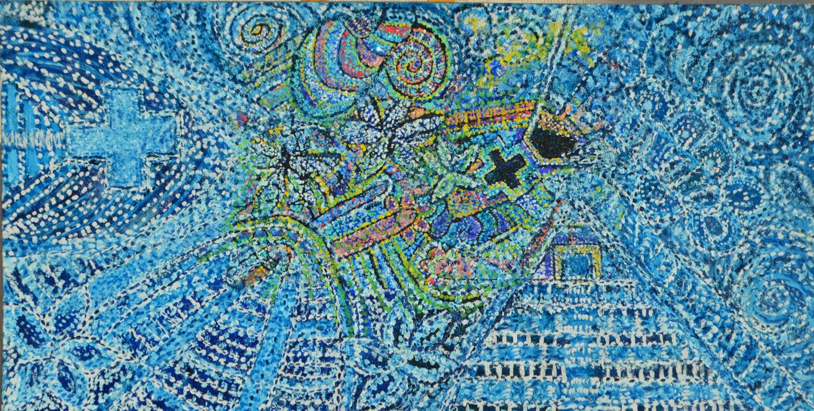 Esta obra ofrece una exploración visual de los recuerdos de vidas paralelas, utilizando la técnica del puntillismo para crear un efecto profundo y multidimensional. El enfoque principal de la pintura es revelar la complejidad de las dimensiones internas a través de símbolos y una paleta de tonos azules con un toque de brillantina.