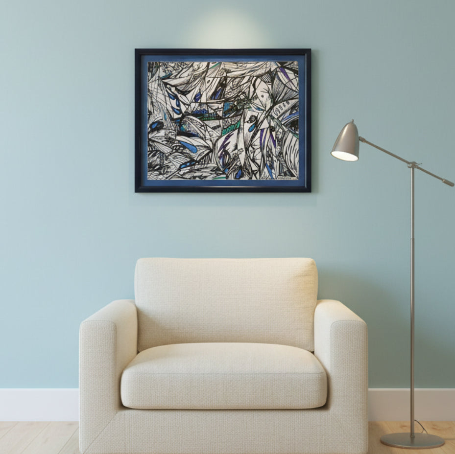 El dinamismo se genera por la superposición y fragmentación de formas orgánicas y geométricas, creando una sensación de movimiento perpetuo. La introducción de acentos de azul cobalto, violeta y verde esmeralda rompe la monocromía, inyectando tensión y profundidad emocional a la composición. Se aprecian sutiles inscripciones textuales que sugieren una narrativa interna o un diálogo subconsciente, invitando al espectador a descifrar su propio significado en el caos organizado. Marco de madera negra con paspartú azul y vidrio antirreflejante.
