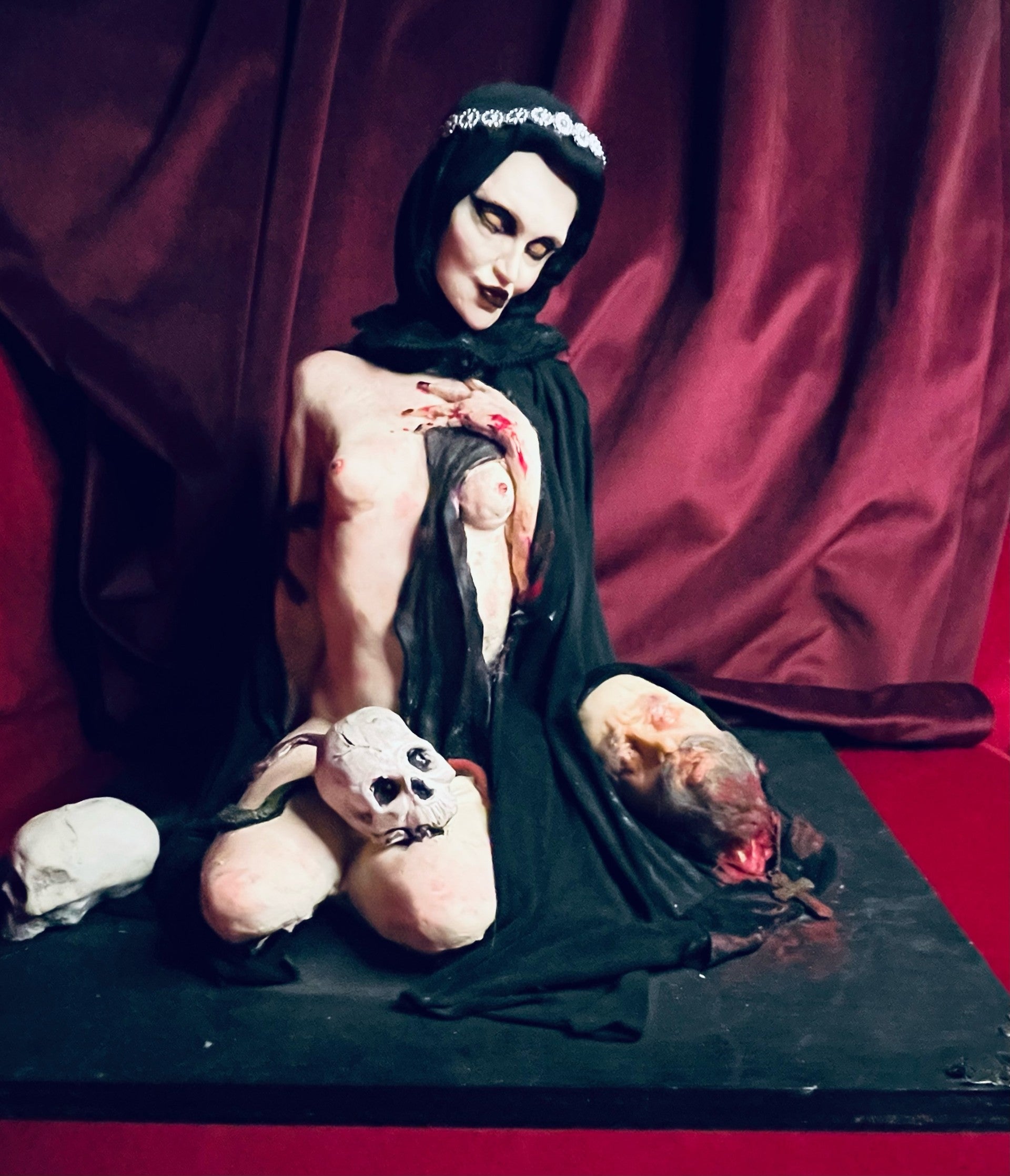 "Bruja", pieza inspirada en el folclor europeo. Ella es hermosa y encanta a los hombres. La bruja ha encontrado en su siguiente víctima a un monje que termina a sus pies, decapitado. A través del tiempo ella sensual y poderosa resguarda a sus víctimas. La decapitación es el principal símbolo de su poder.