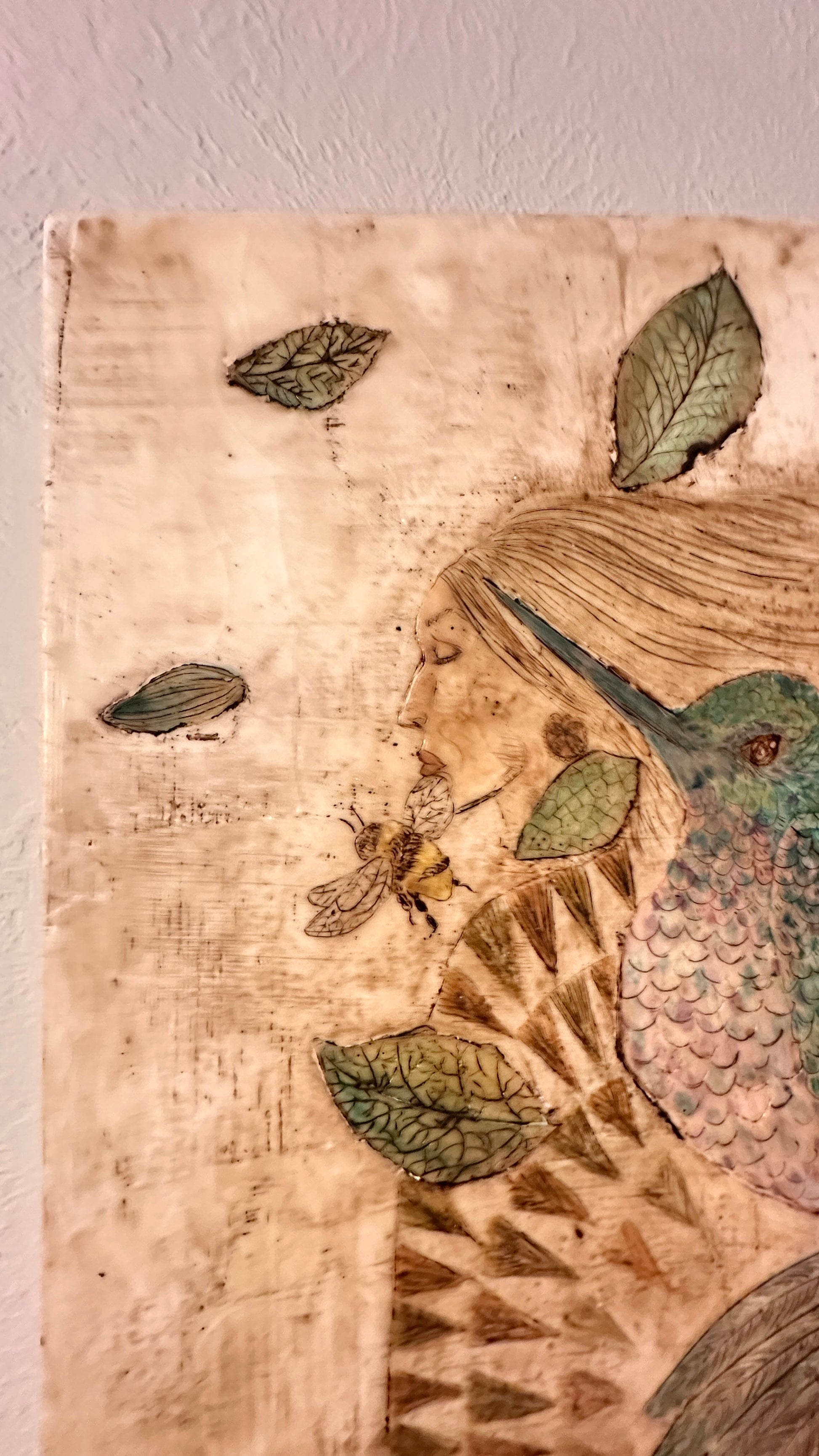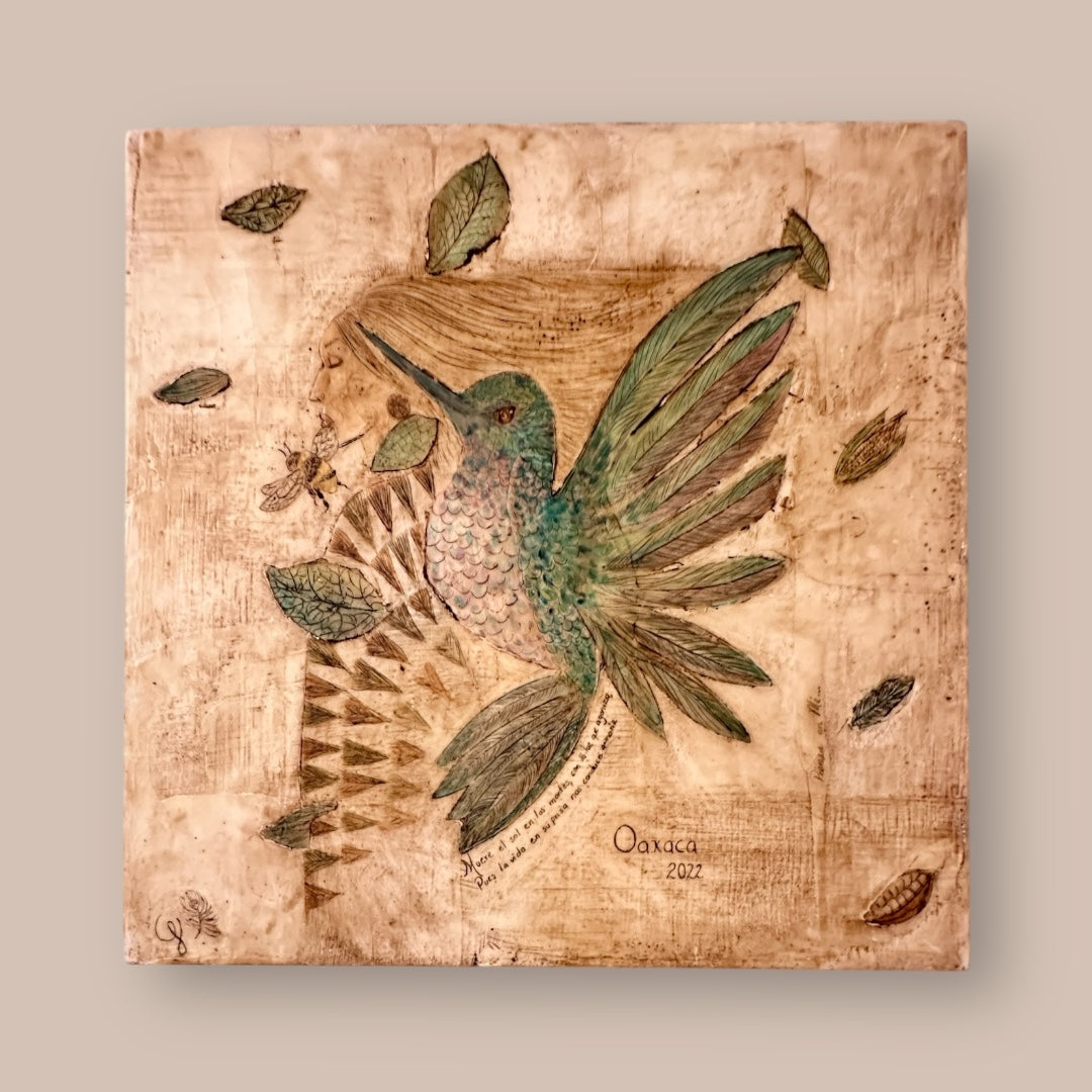 Al centro hay un colibrí, que es una remembranza a un poema del poeta náhuatl Natalio Hernández, el cual se traduce algo así: “Mañana, cuando yo muera, volveré en la forma de un colibrí. Mujer, Al mirar hacia el sol, sonríe con alegría. Existiré junto a nuestro padre, buena luz te enviaré.”