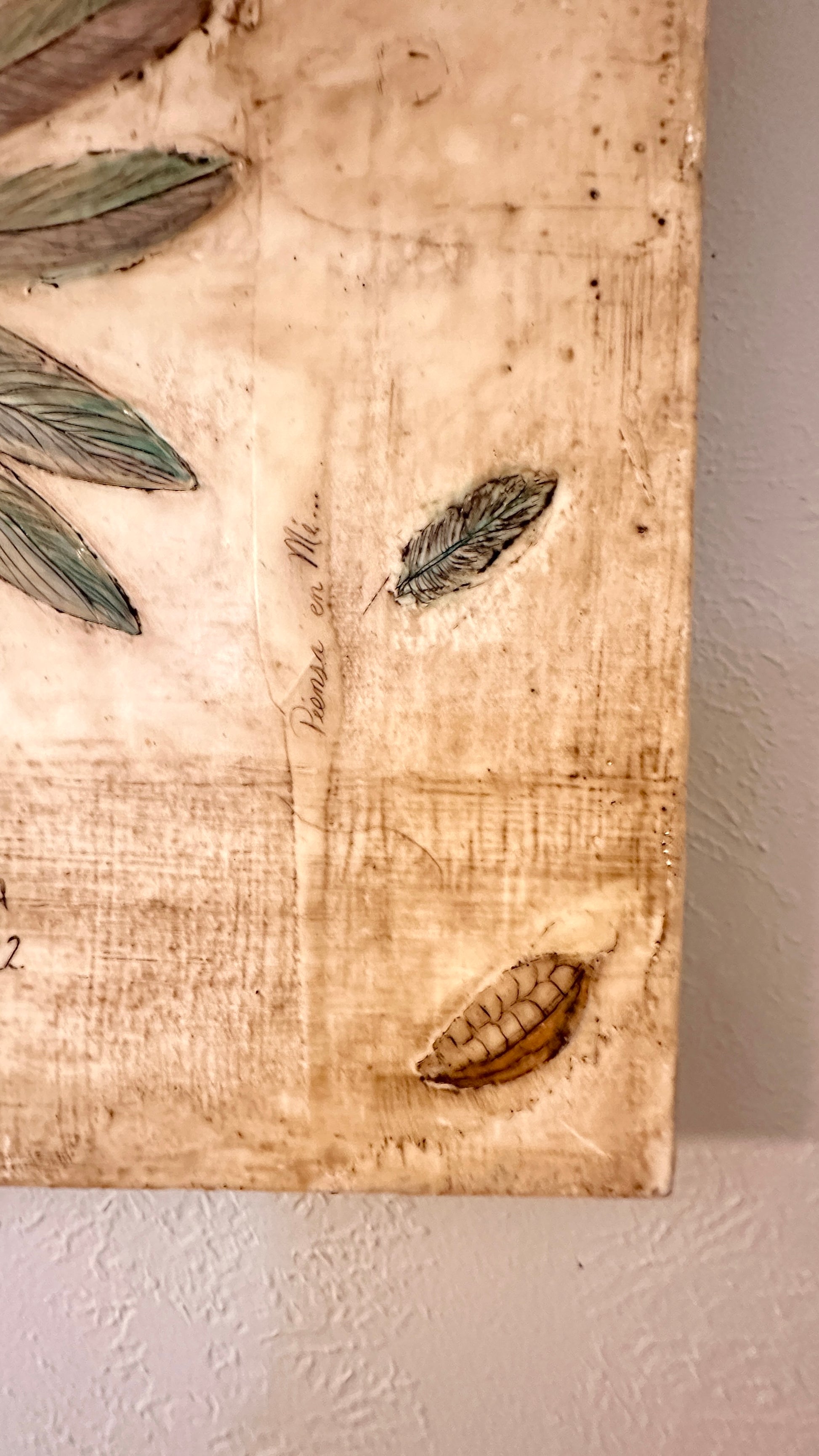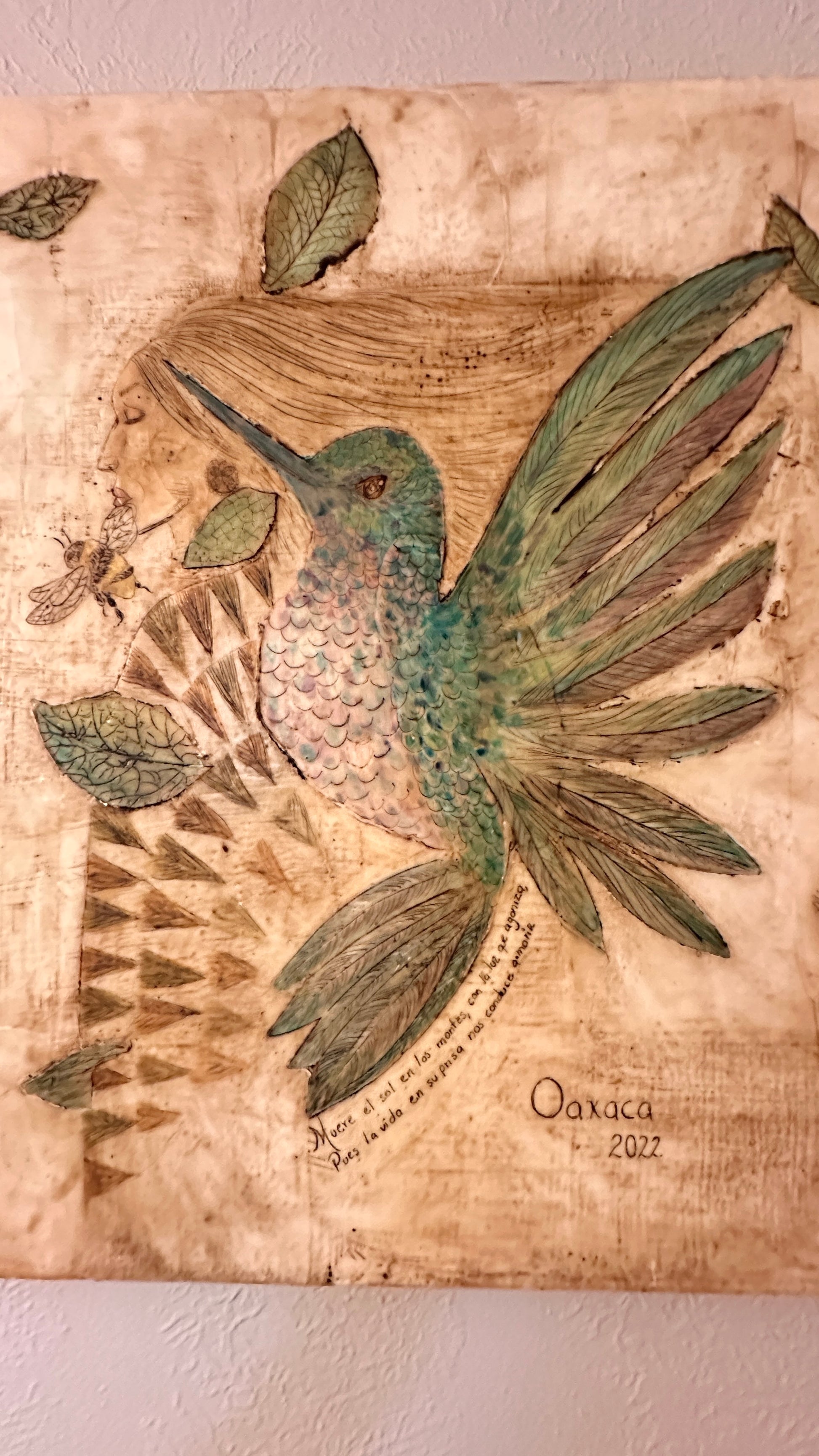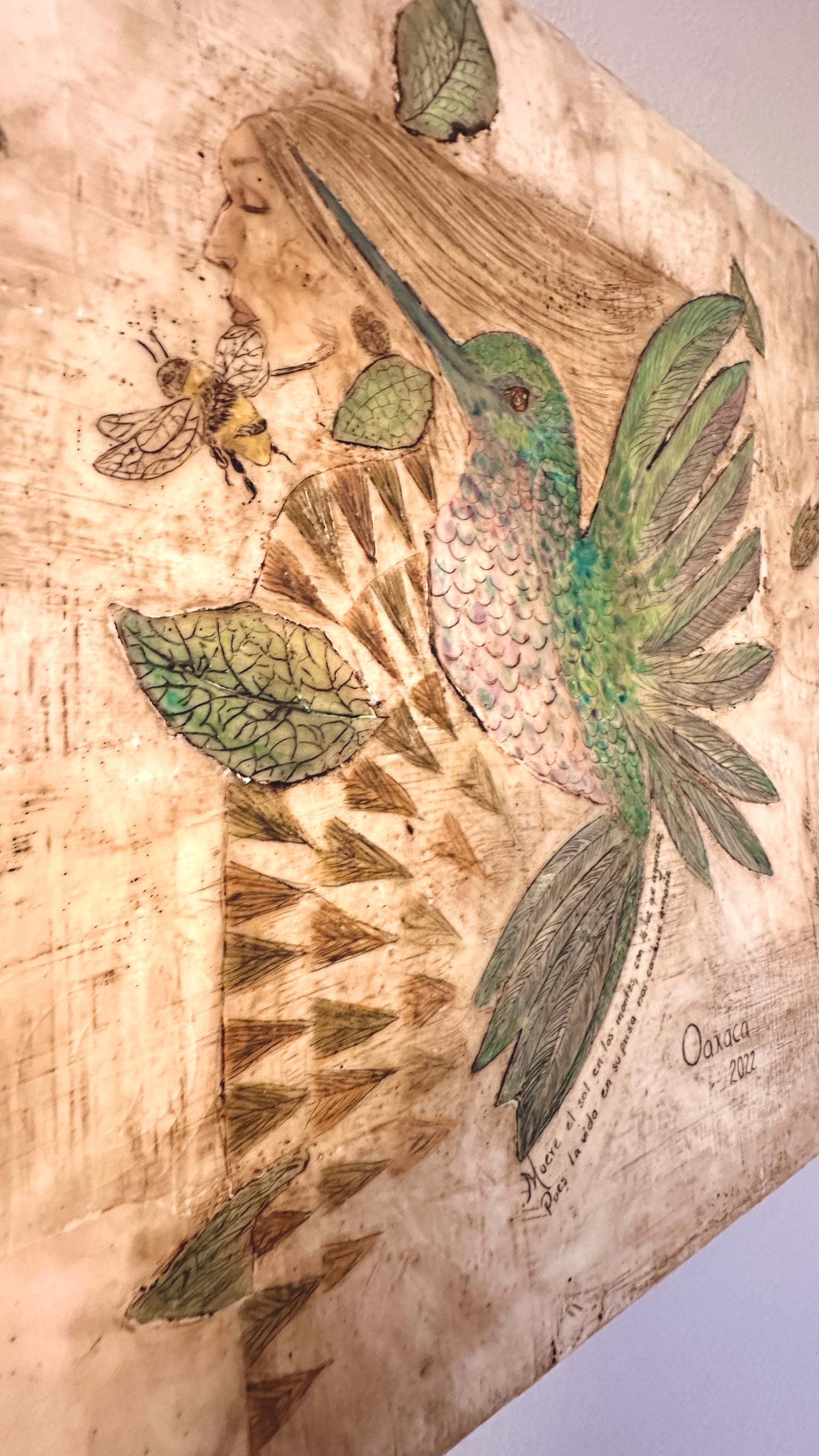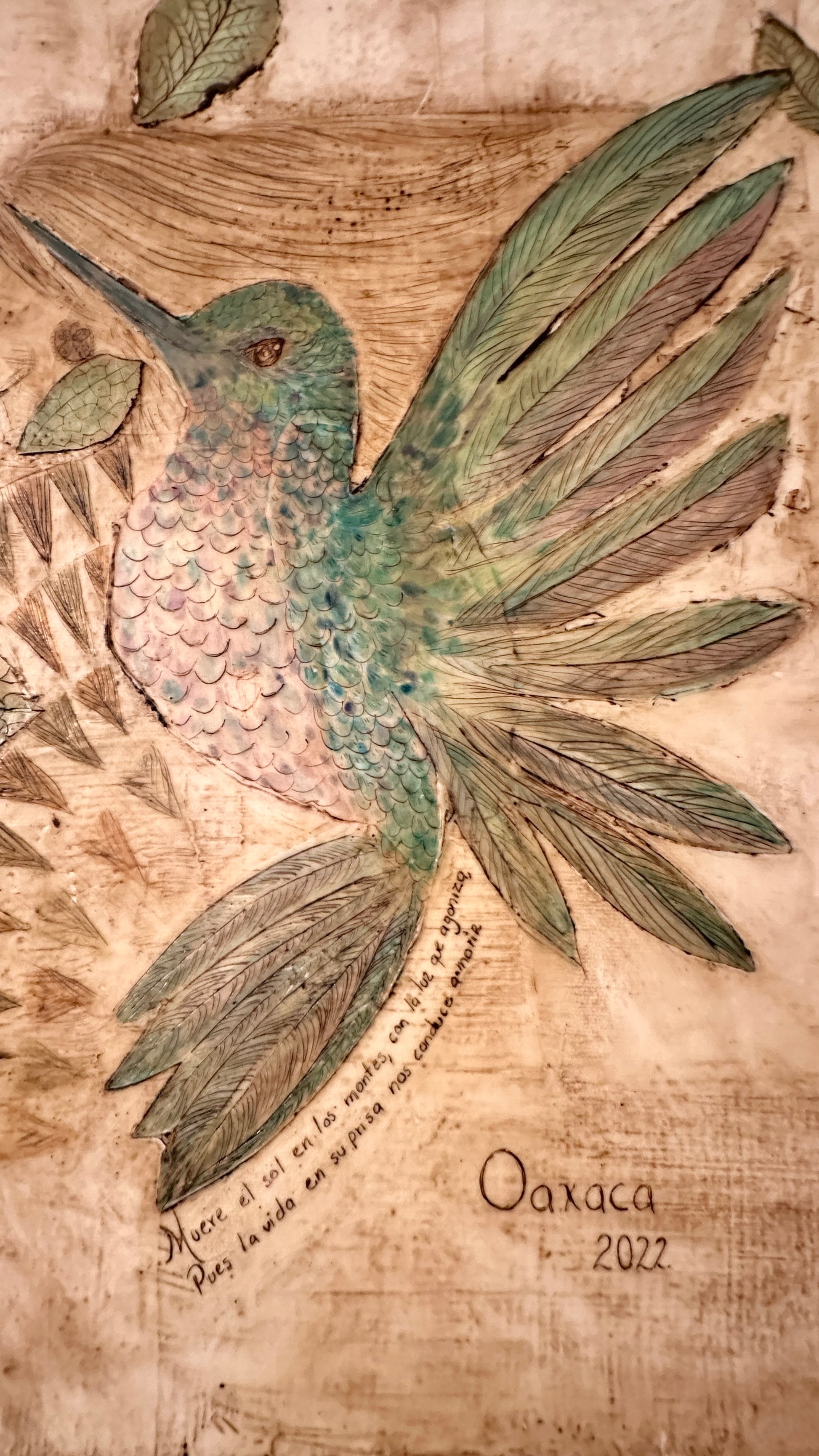 Es una pieza profundamente emocional realizada en Oaxaca y durante mi estadía en este lugar, el himno oaxaqueño “Dios nunca muere” se convirtió en un eco constante que resonaba en cada rincón: en la radio, en las calles, en los talleres y en los hogares. Lo que me llevó a incluir unos versos de la canción en la obra: “Muere el sol en los montes con la luz que agoniza, pues la vida en su prisa nos conduce a morir”, palabras que evocan lo efímera que es la vida.