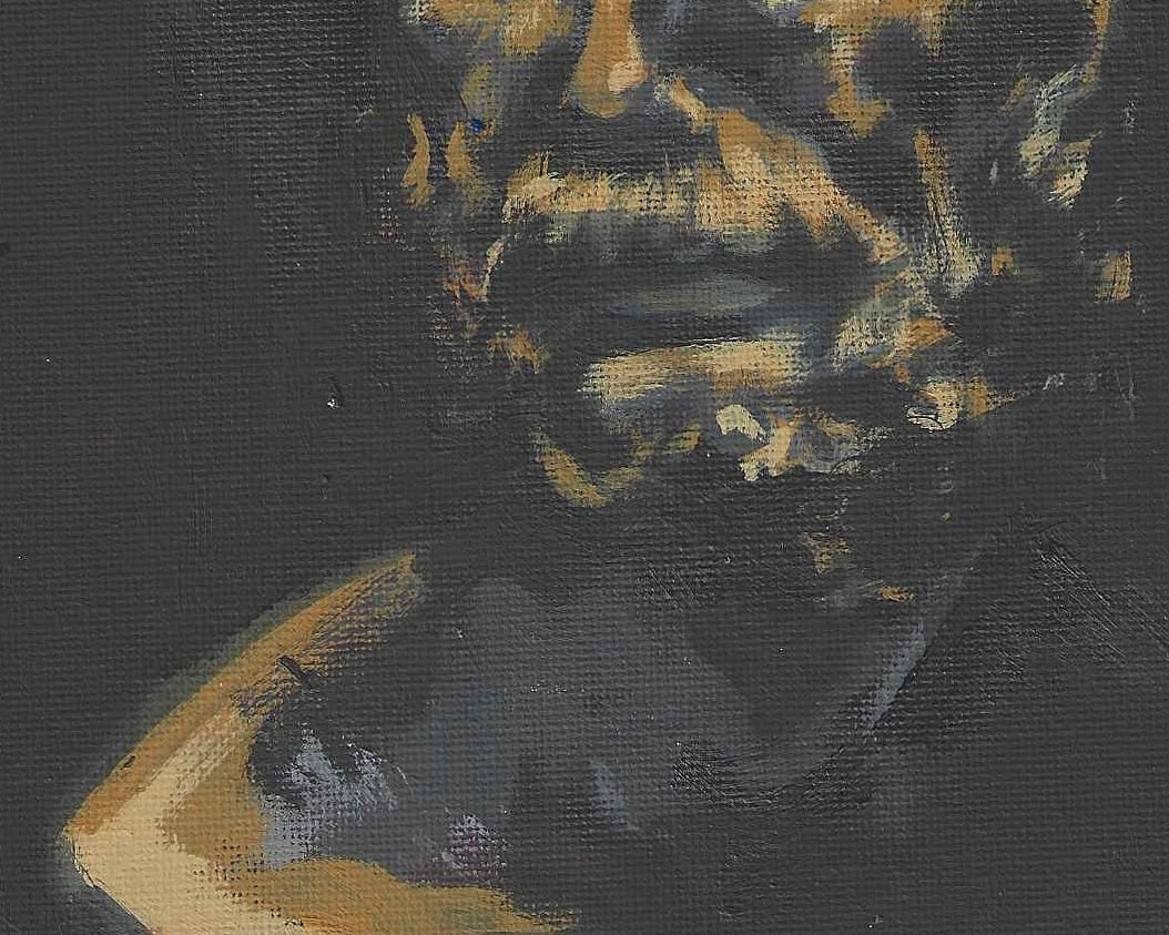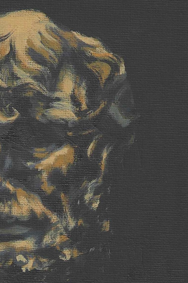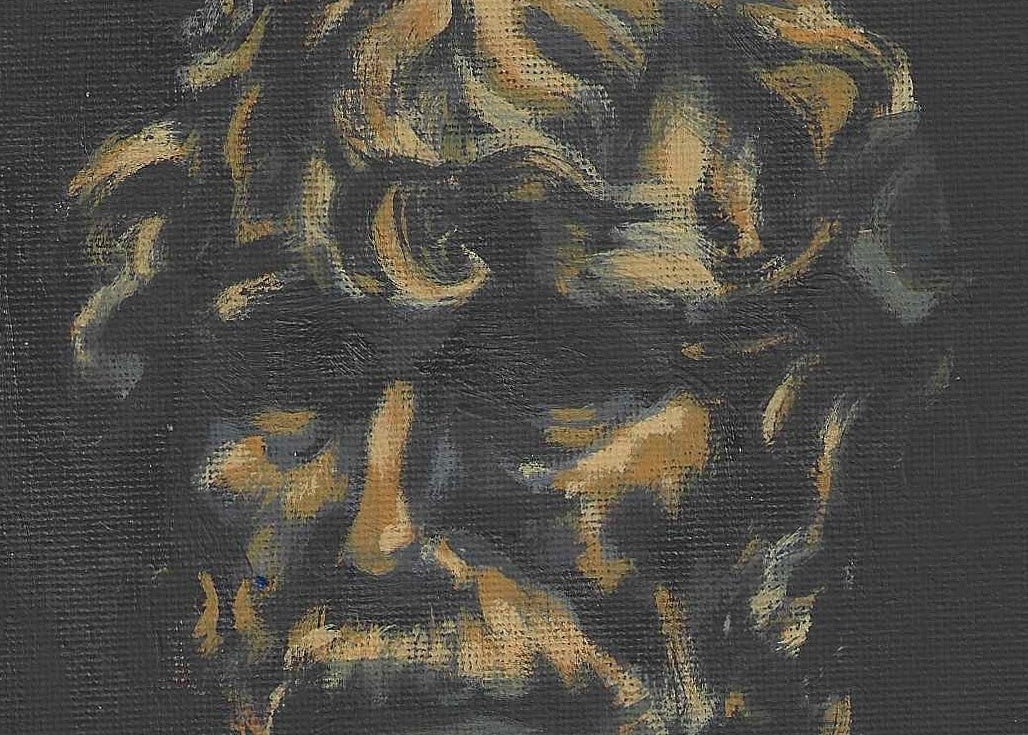 El filósofo estoico mira al horizonte, surgiendo desde la oscuridad.
