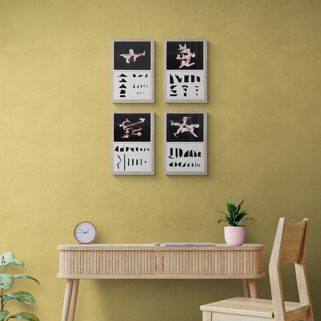 Después, partiendo de este orden, los fragmentos fueron unidos en las composiciones mediante una línea roja que seguía el criterio de clasificación previa. Esto dio como resultado un tipo imprevisto de visualidad en las composiciones iniciales.