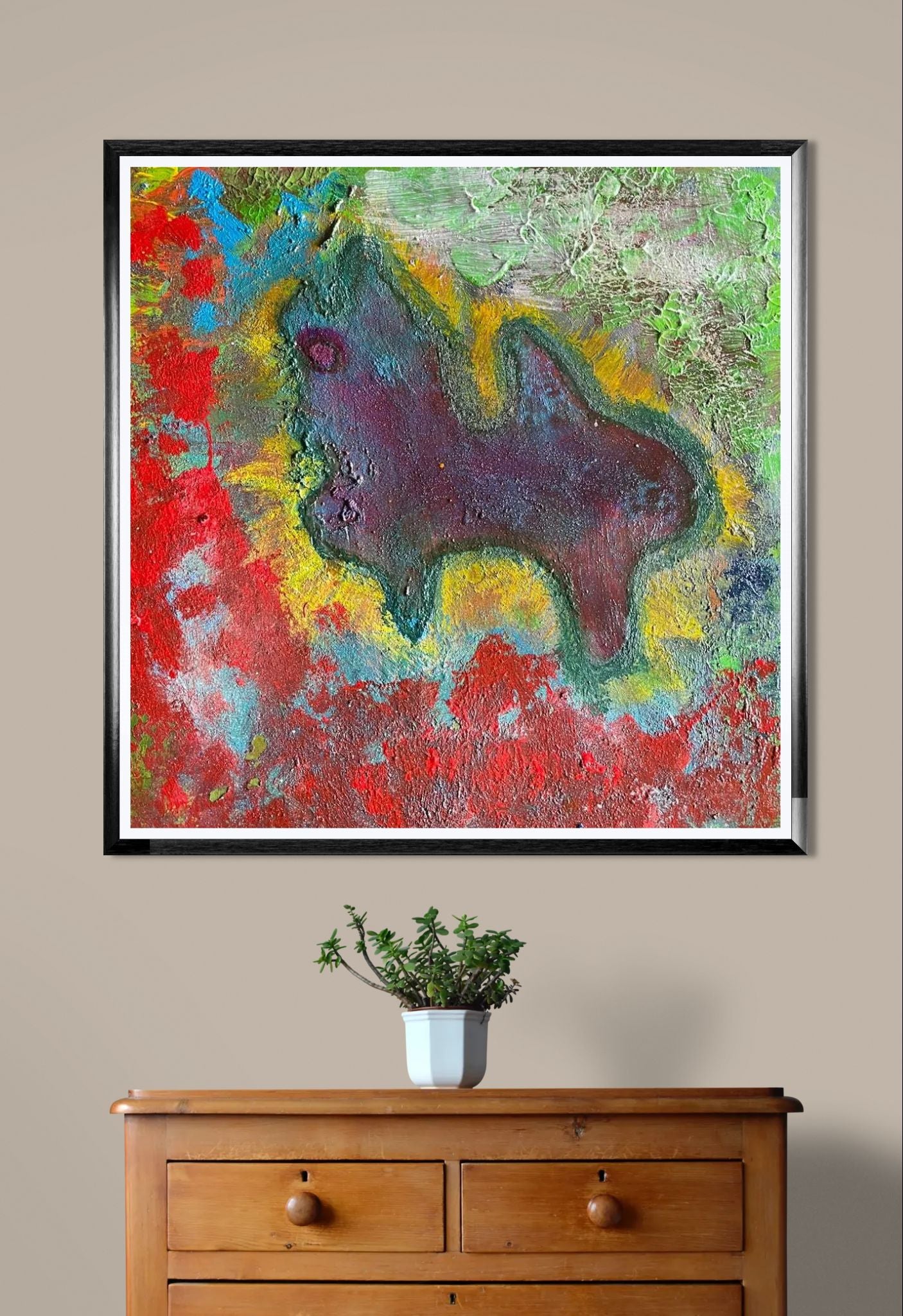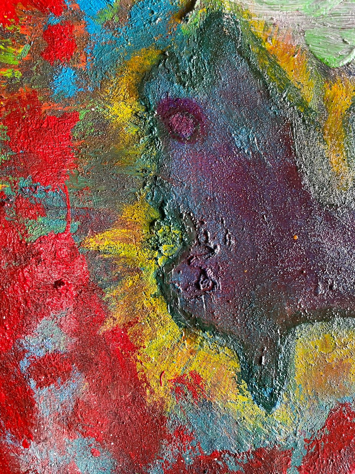 Obra vibrante y texturizada en la que un motivo central —una silueta abstracta con forma de caballito— emerge entre capas de color intensas y contrastantes. La composición sugiere movimiento y dinamismo, evocando el espíritu lúdico y festivo de una feria.