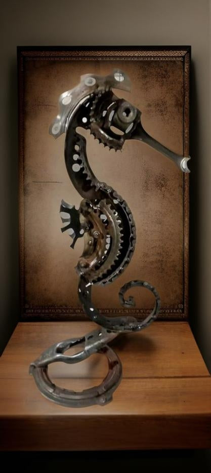 Debido a que el caballito de mar es un animal único y especial, a inspirado al artista logrando captar su belleza por sus características especiales. Obra realizada con chatarra buscando darle una nueva oportunidad a lo que para muchos se puede considerar como objetos sin sentido.