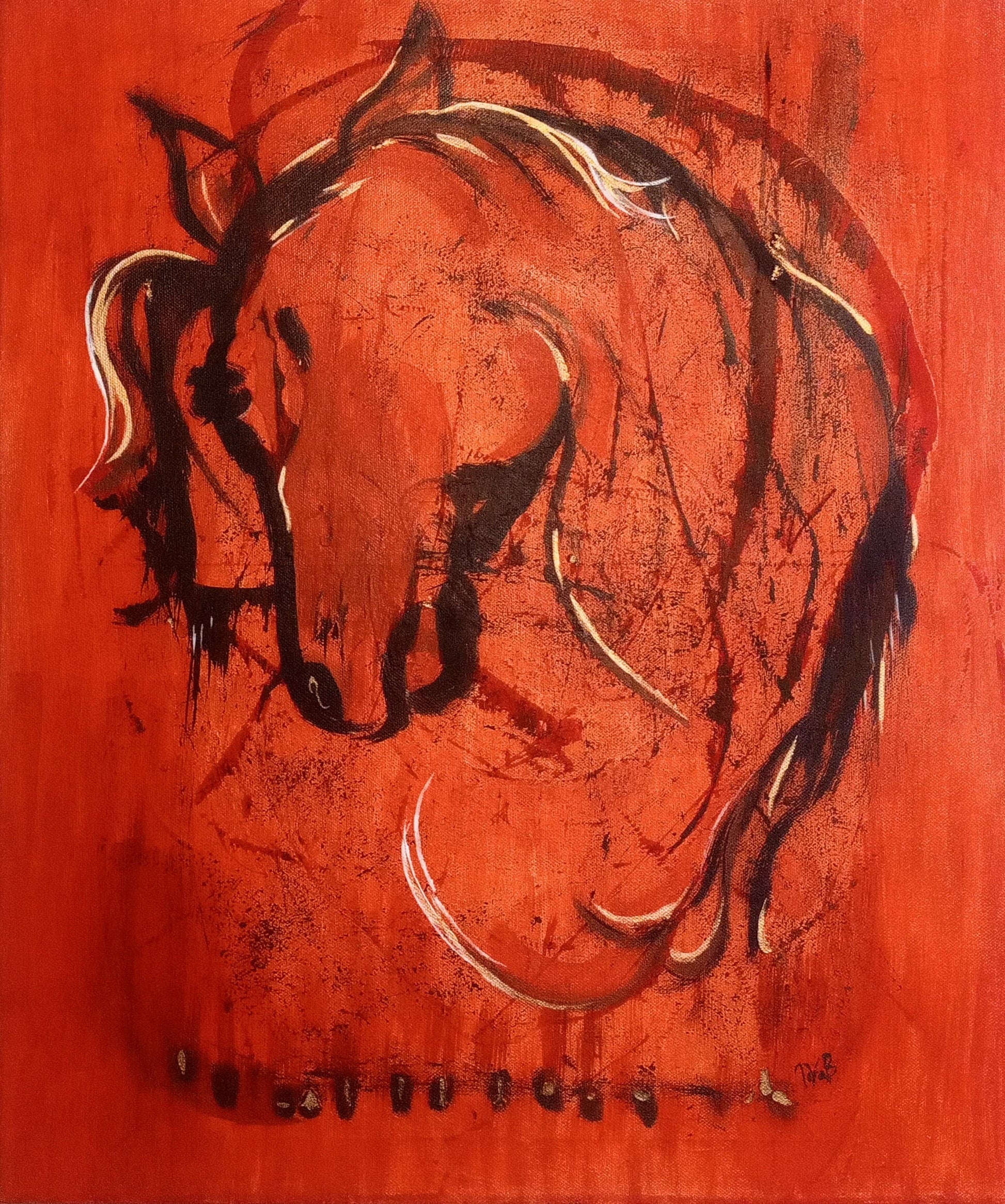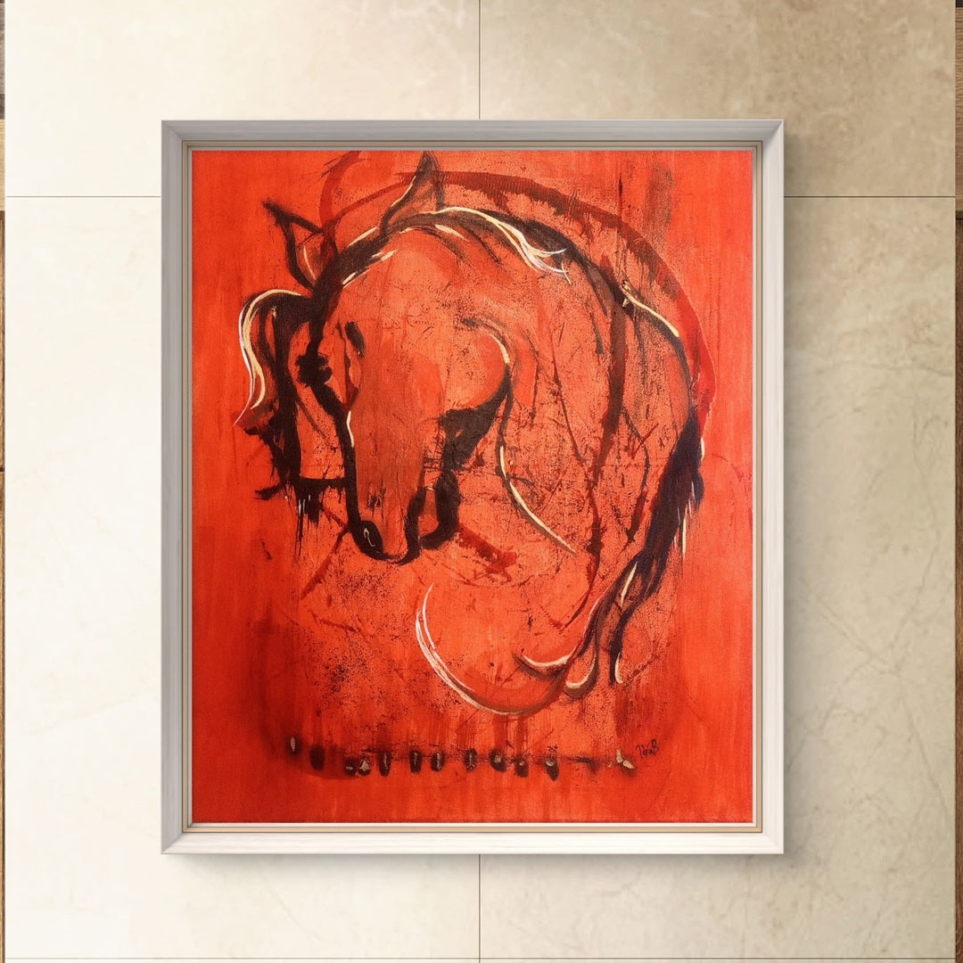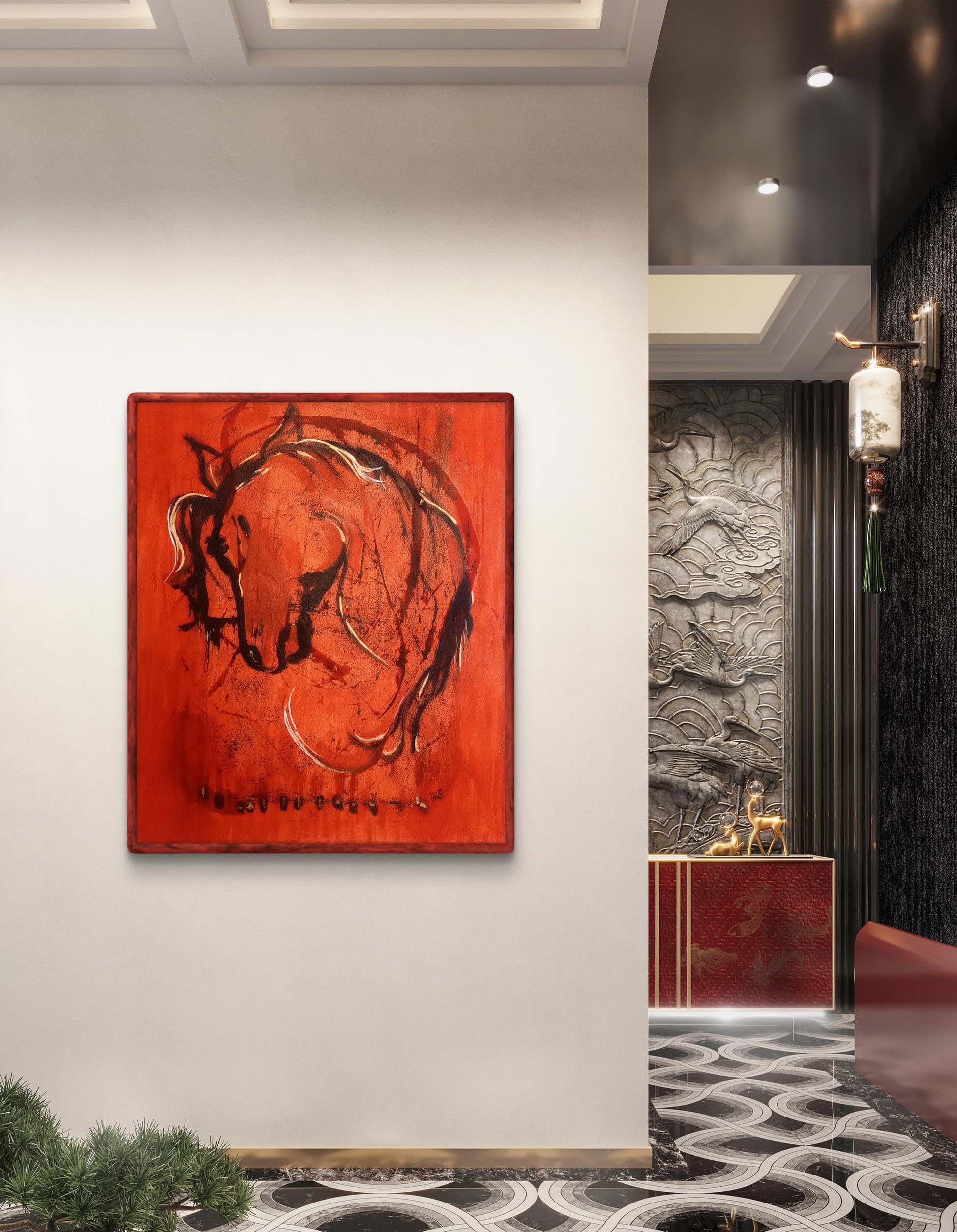 Composición pictórica figurativa en fondo rojizo, pinceladas negras y doradas, con algo de textura. Evoca energía y fuerza con los tonos vivos mientras el caballo demuestra poder y autoridad.