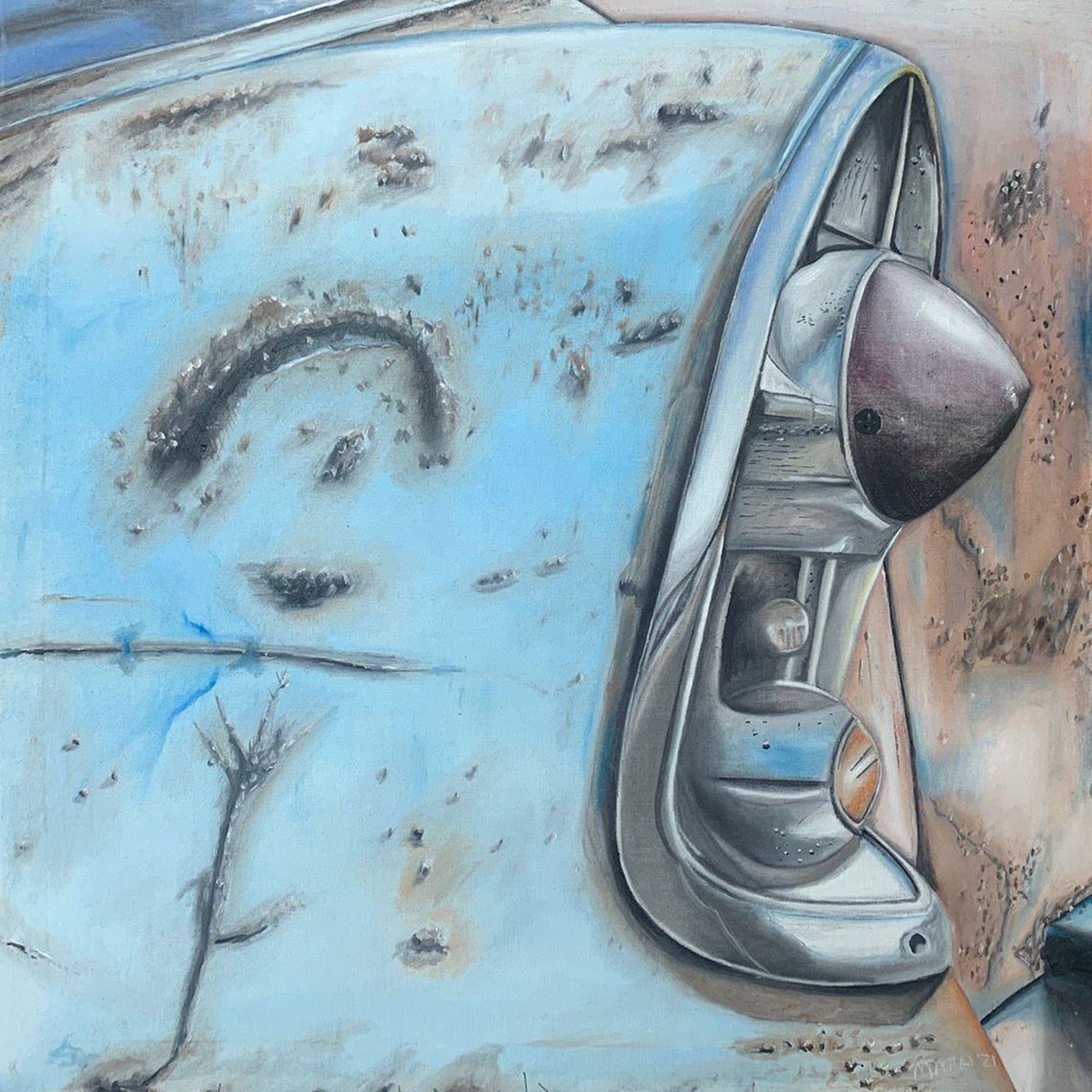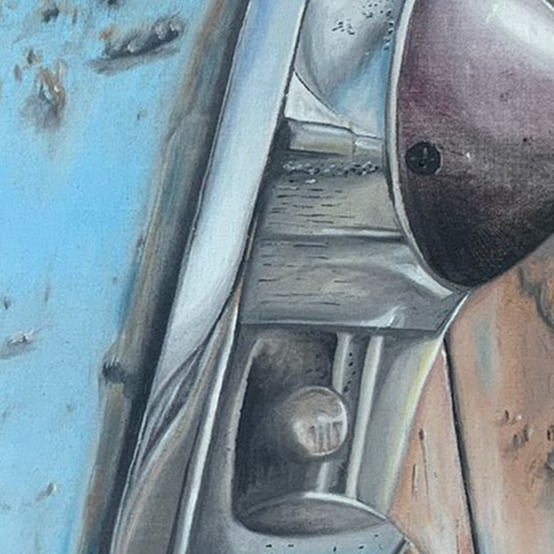 La superficie de la pintura denota el paso del tiempo, resalta la calidad de la artesanía de la época. El azul se combina con detalles cromados, como molduras y emblemas, que añaden un contraste brillante y sofisticado.
