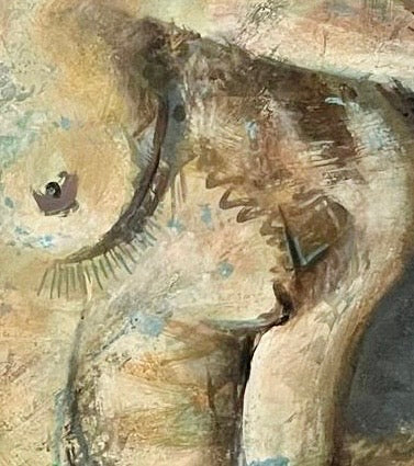 Esto es una pieza aislada en cuanto a formato, pero también pertenece en cierta forma a una serie de desnudos que he trabajado de manera bastante lenta, porque voy alternando con otros trabajos que actualmente solamente tengo cuatro pinturas, las otras tres están en Colombia en una excursión itinerante y esta por ser un formato grande ha sido complicado moverlo. Este desnudo, aparte de mostrar más movimiento, también sugiere un contexto que las otras piezas de la serie queda a disposición del espectador. Aquí empieza a buscar un poco más de la luz, algo de abstracción, en el agua.