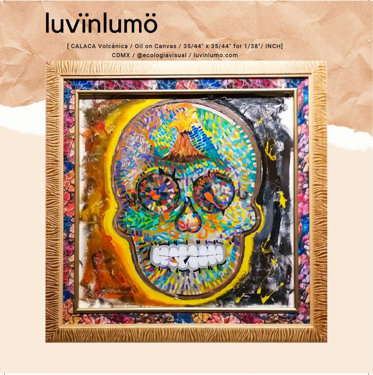 Hace alusión a las formas de Calacas de nuestra infancia inmersa en un mundo colorido y llena de símbolos y significados de nuestras tradiciones prehispánicas mexicanas.