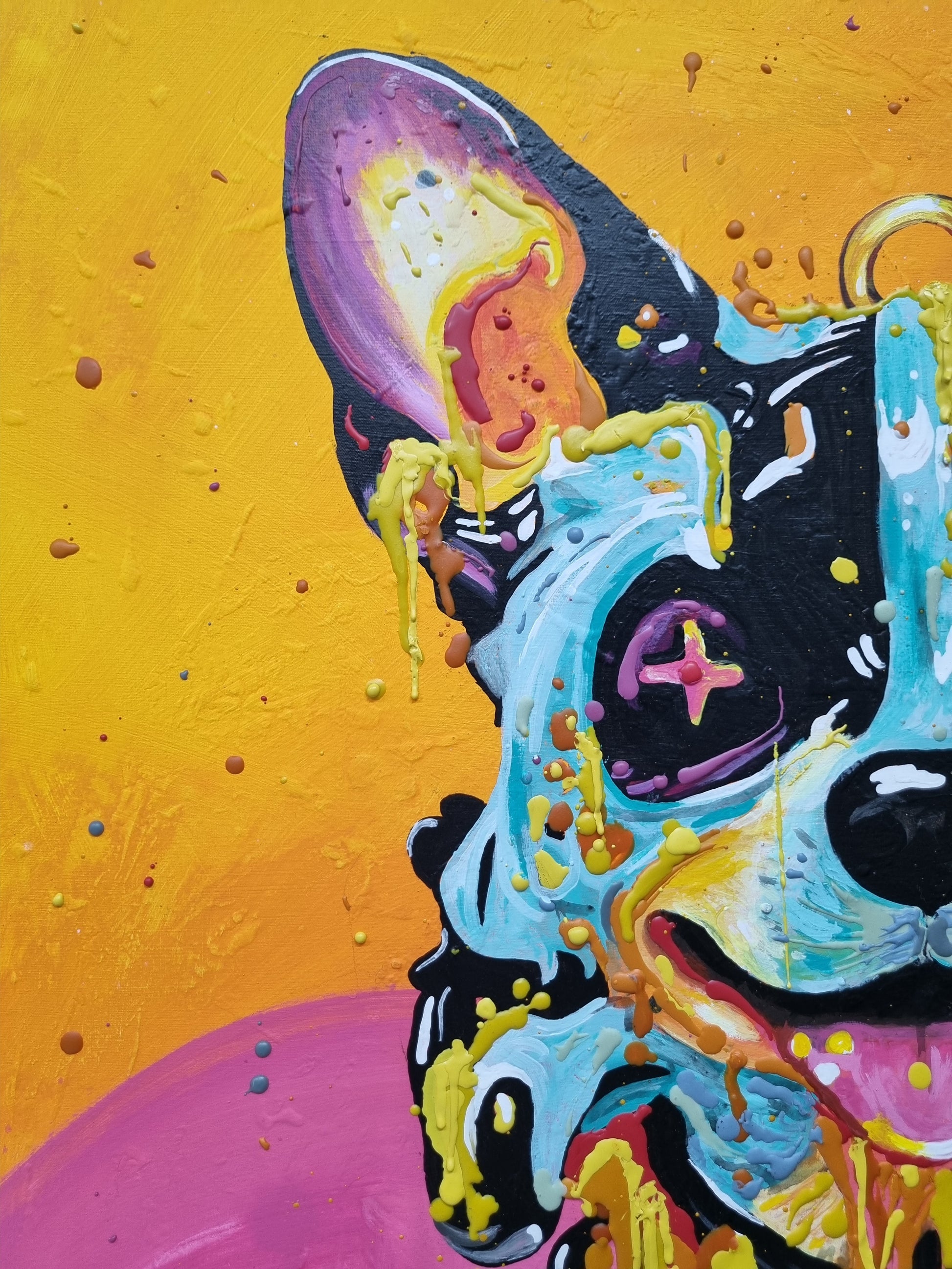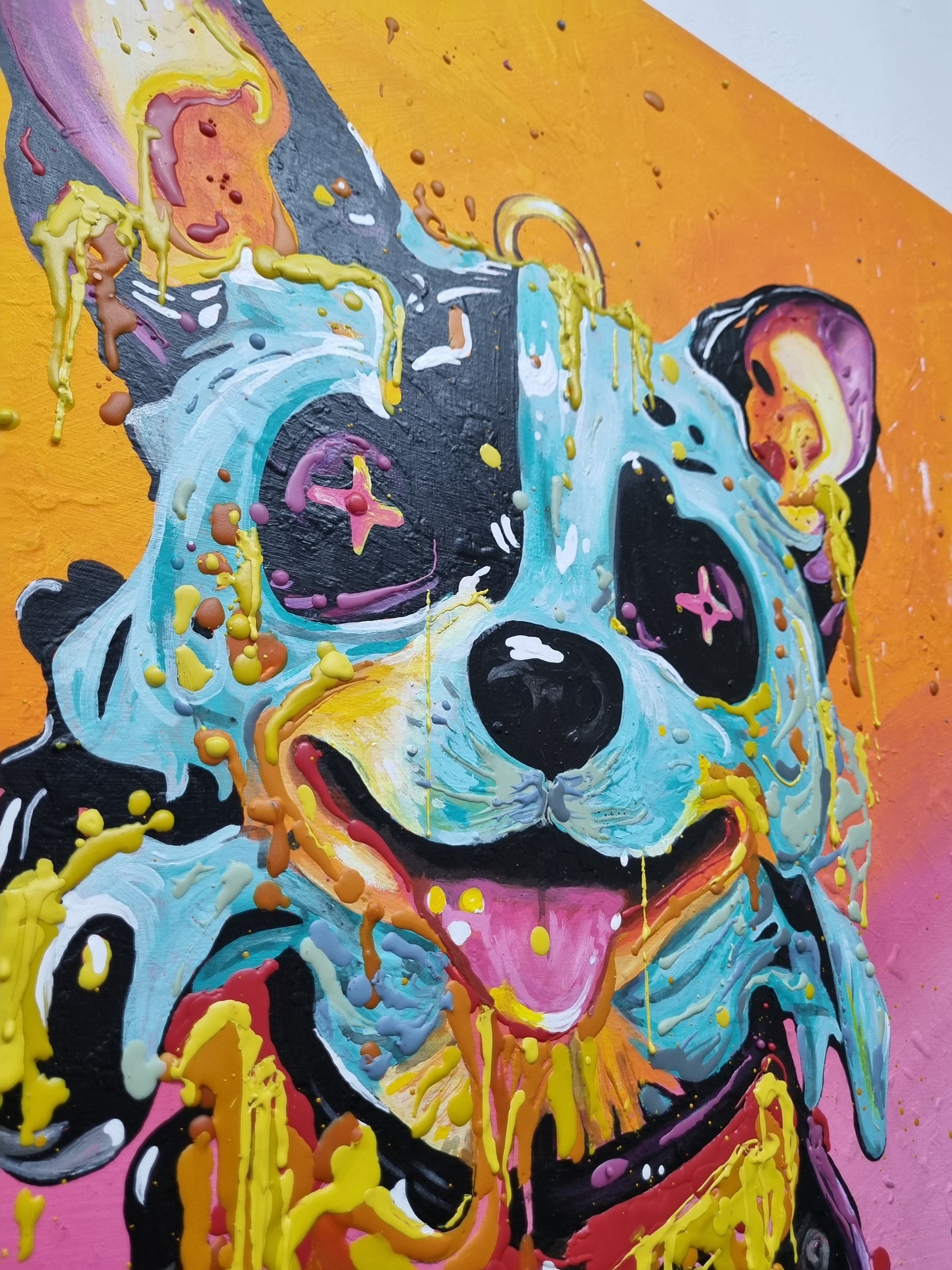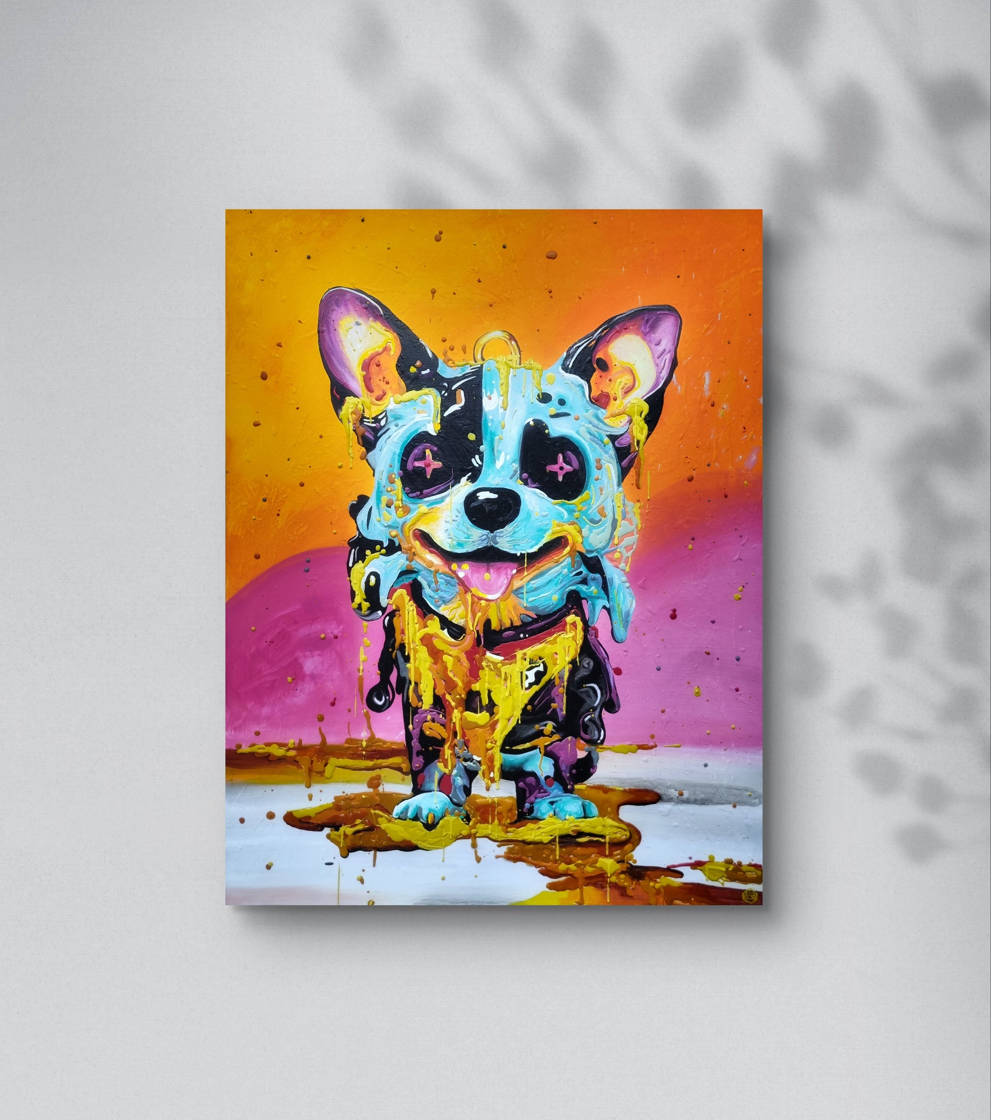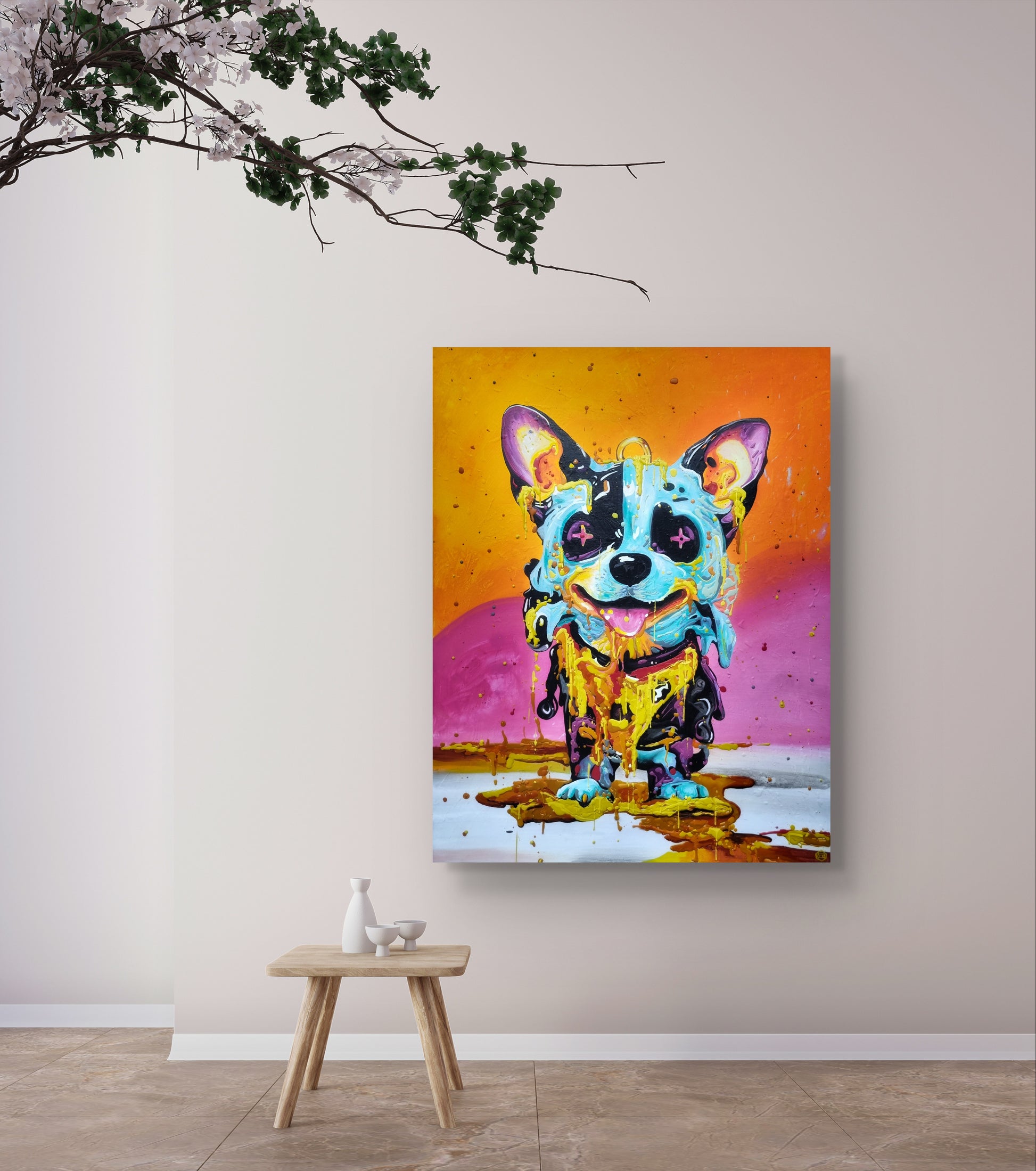 Esta pintura captura la esencia del perro un protector amistoso, símbolo de lealtad y sabiduría ancestral.